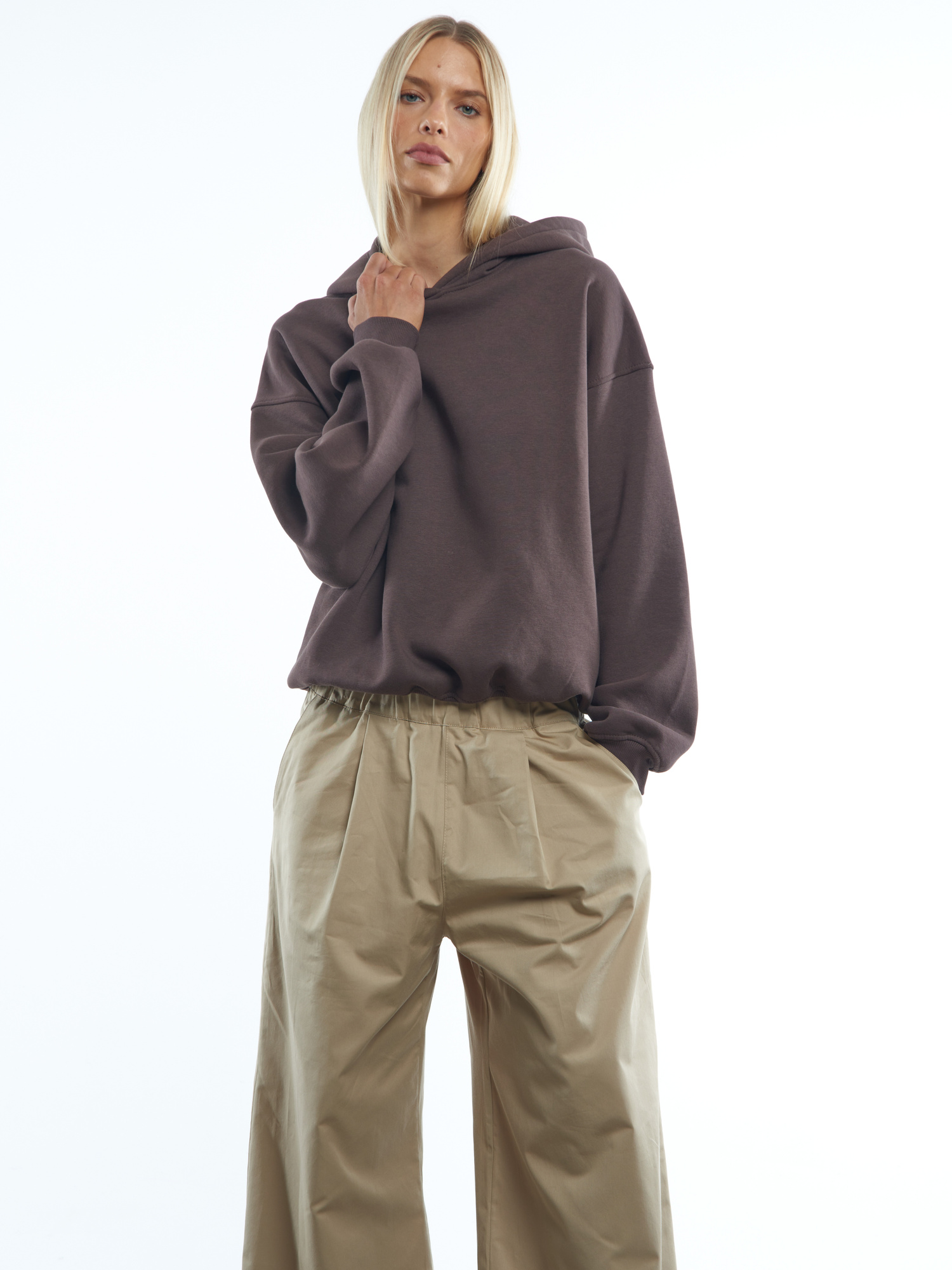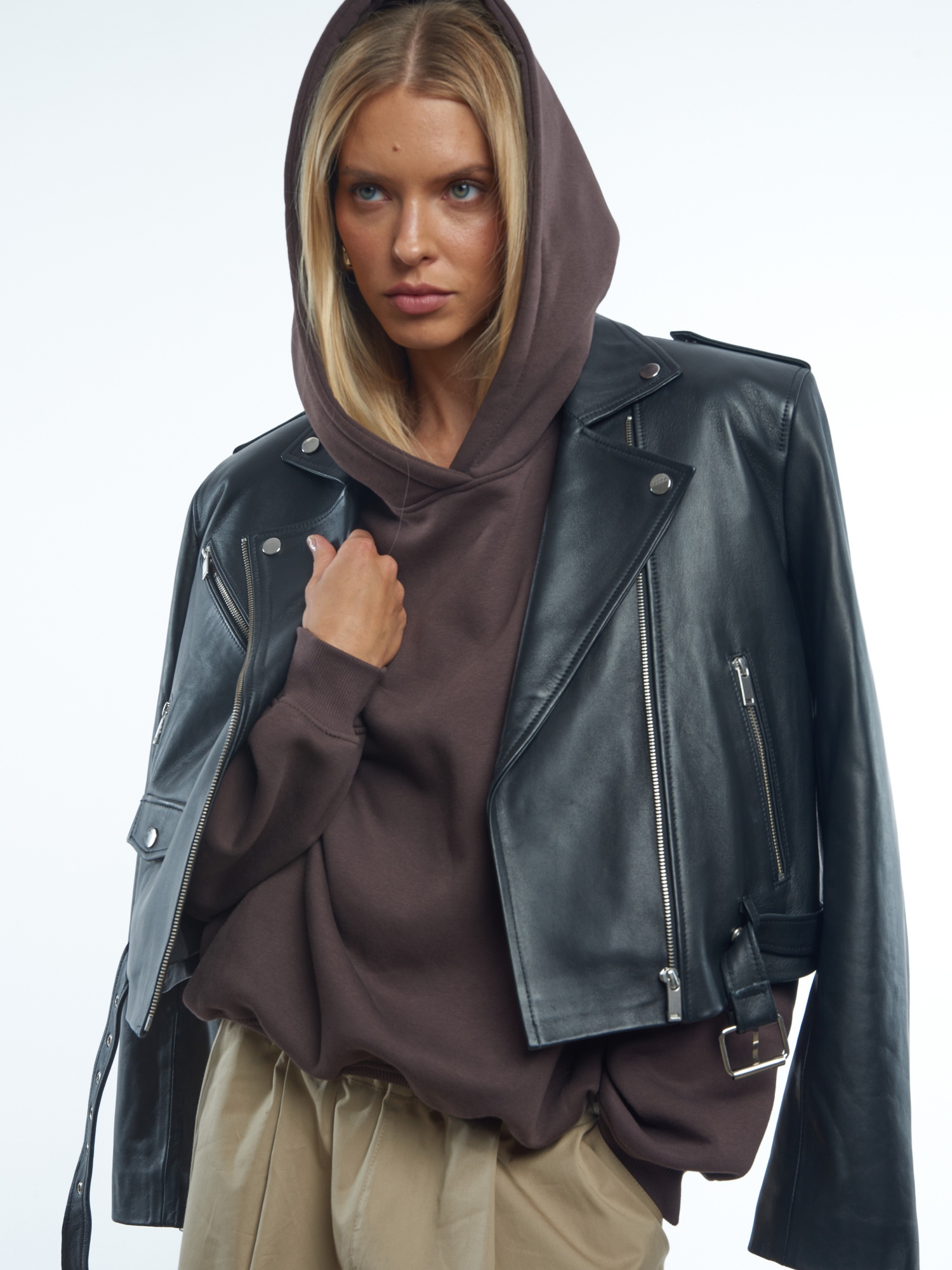 A short oversized hoodie made from soft cotton with a cozy fleece lining on the inside. Its balloon-style design stands out with wide, long sleeves finished with cuffs and a snug waistband that gives it a unique, voluminous shape. Perfect to pair with joggers, leggings, or jeans for a stylish and comfortable look.
