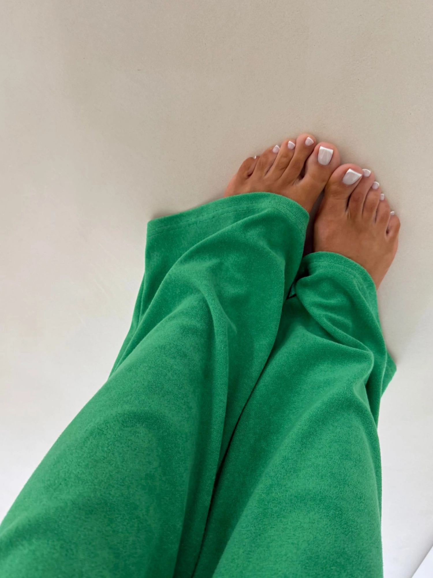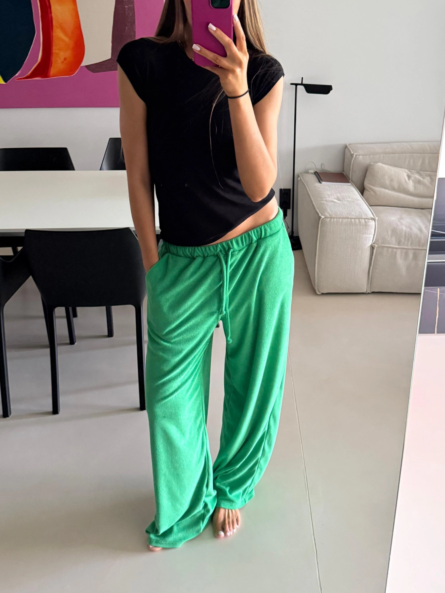Pants made from a unique terry-finished cotton fabric. This type of material is known for its looped texture, making it soft, absorbent, and effortlessly drapey. The relaxed fit—with straight legs and an elastic waistband with a drawstring—adds extra comfort.
