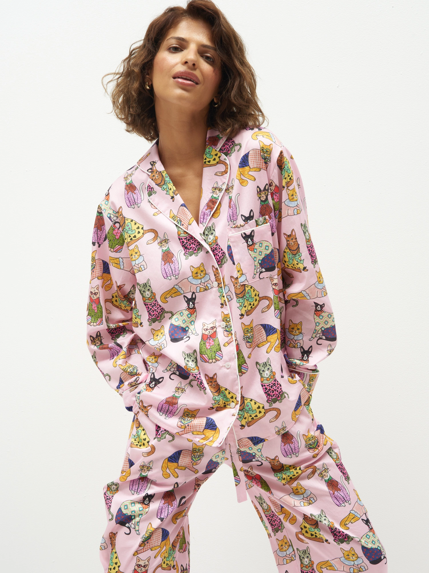 Pajama shirt made of soft and airy cotton. Classic style, buttoned witha a turn-down collar. Long sleeves with cuffs and trimming. The whole is closed in unique colors and print, which will make yoy feel stylish even moments after waking up.