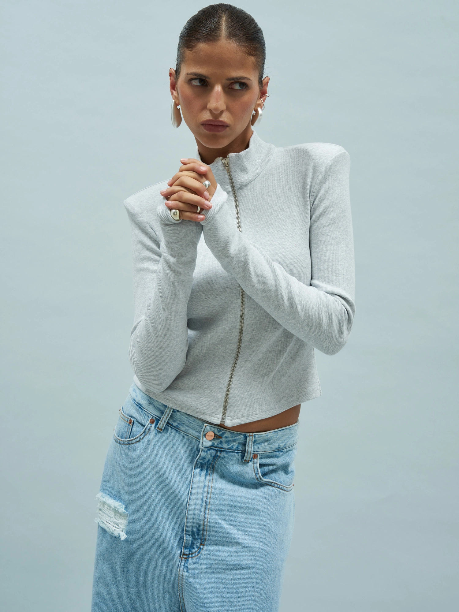 A unique long-sleeve top crafted from soft ribbed knit. The fabric is stretchy and adapts perfectly to the body’s shape. Its minimalist design is elevated by a front zipper and structured shoulders with pads, giving it a strong, modern look. A fresh alternative to classic long-sleeve tops, sweaters, and sweatshirts. Perfect for both casual and more polished outfits - pair it with jeans or relaxed trousers for effortless style.