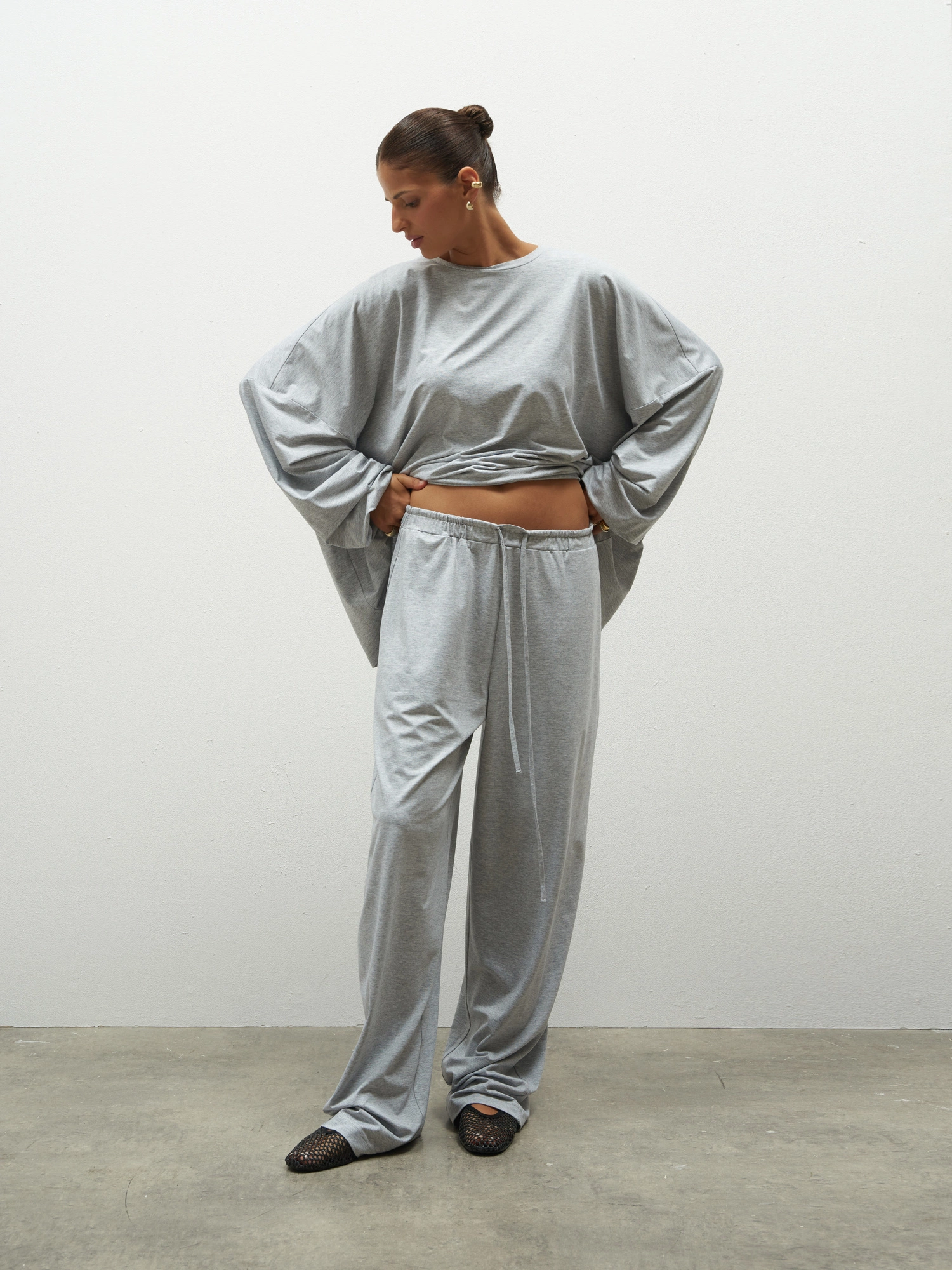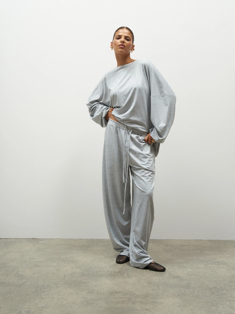 Pants made from T-shirt viscose with a touch of elastane – the fabric is soft, fluid, gently hugs the body, and ensures maximum comfort. They feature a relaxed, loose fit with straight legs and an elastic waistband with a drawstring, allowing for easy adjustment to the silhouette. Lightweight, breathable, and extremely comfortable, they are perfect for everyday wear, lounging at home, or traveling. Their simple shape and timeless style make them a great alternative to classic joggers.