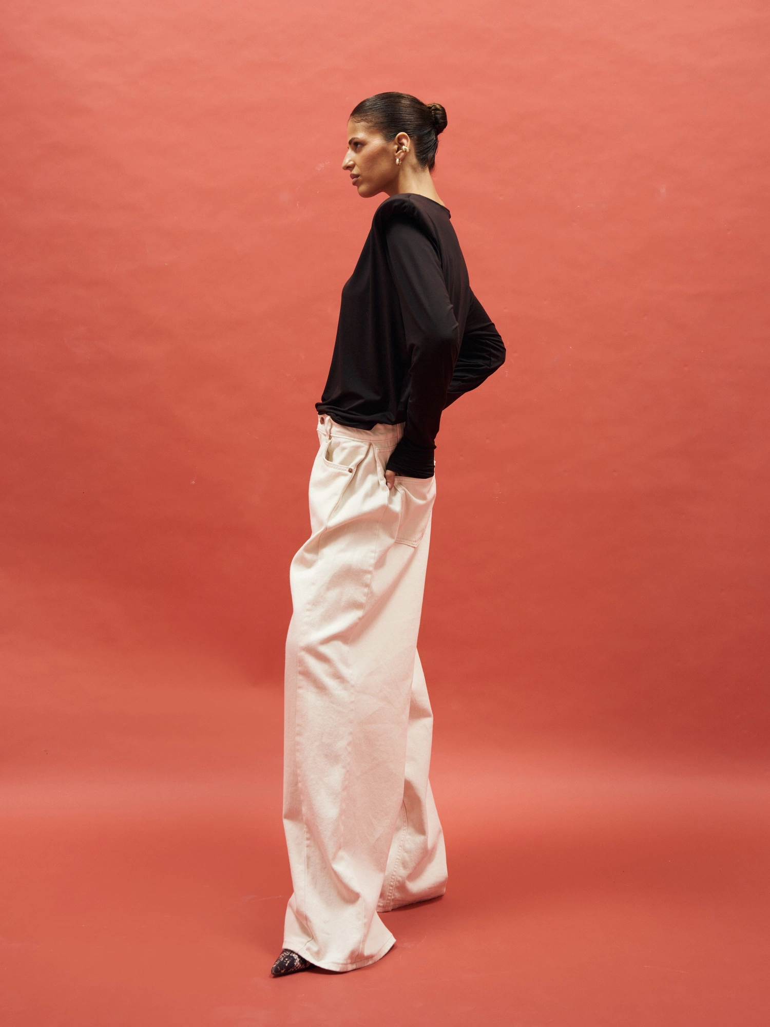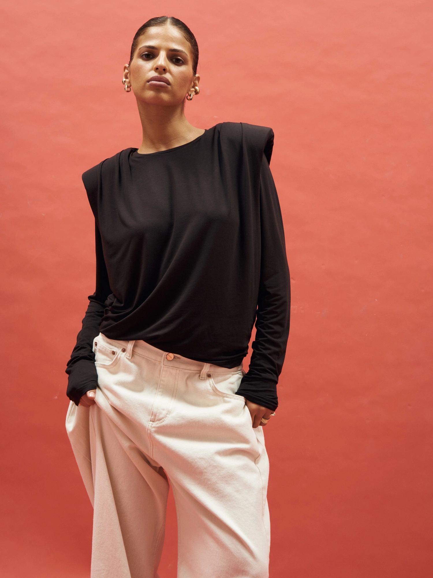 Blouse with shoulder pads in a simple yet unique cut. Made from light, soft knit fabric that drapes beautifully on the body and feels incredibly gentle on the skin. Featuring a slightly oversized fit with long sleeves and a round neckline. Perfect to style with high-waisted trousers, jeans, or an elegant skirt. An ideal base for countless outfits – from casual to more sophisticated looks. This piece is the essence of minimalism with a touch of modern edge.