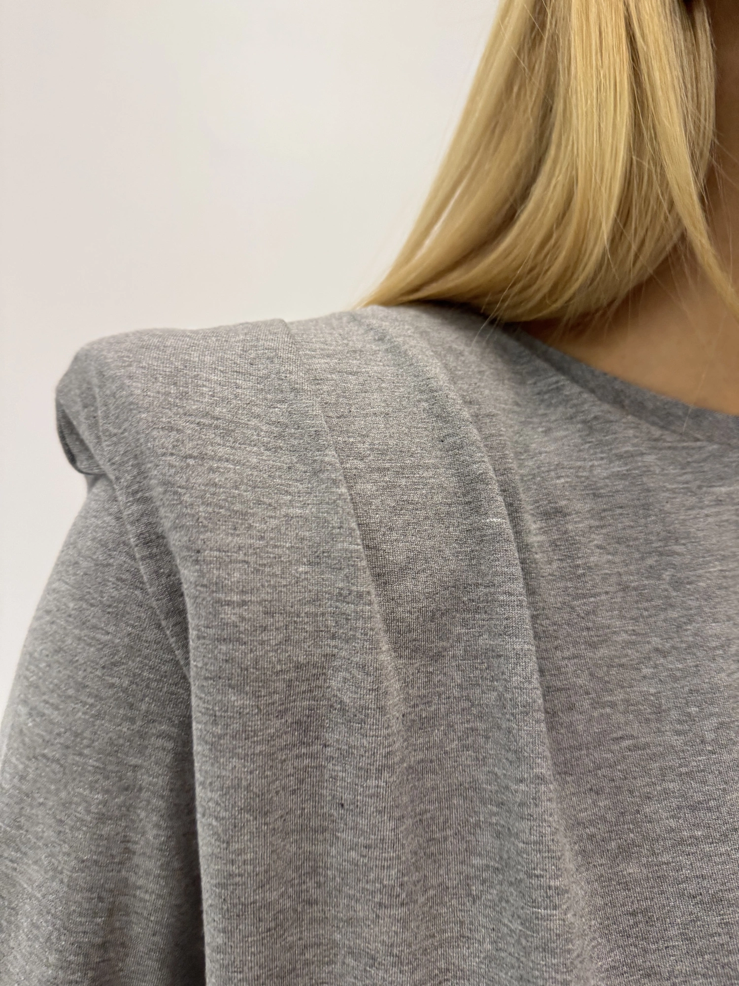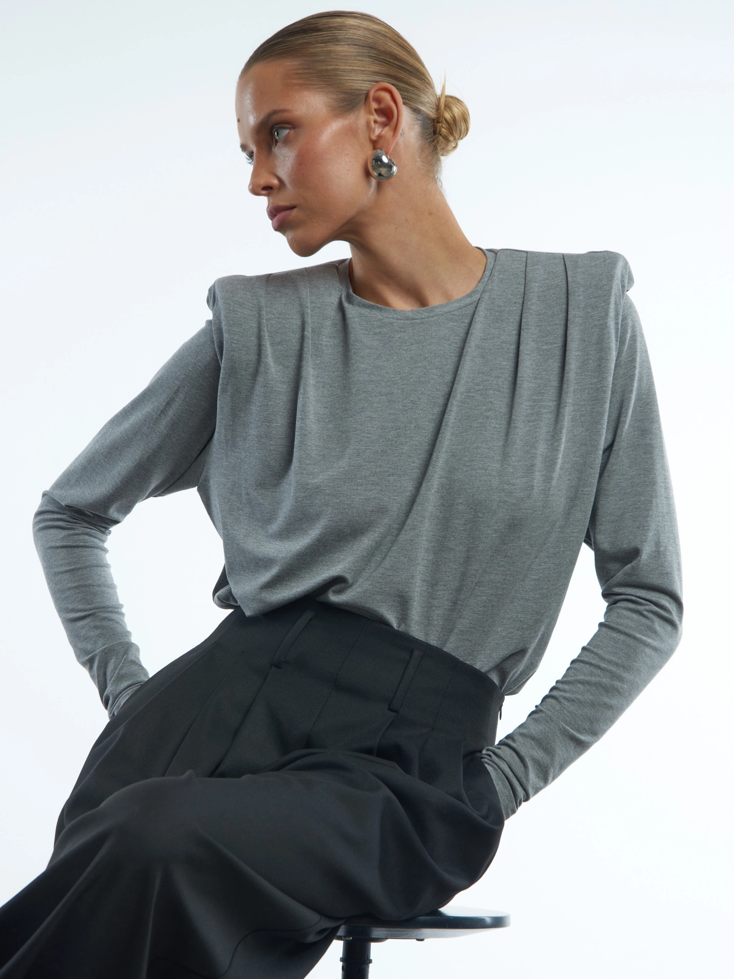 Blouse with shoulder pads in a simple yet unique cut. Made from light, soft knit fabric that drapes beautifully on the body and feels incredibly gentle on the skin. Featuring a slightly oversized fit with long sleeves and a round neckline. Perfect to style with high-waisted trousers, jeans, or an elegant skirt. An ideal base for countless outfits – from casual to more sophisticated looks. This piece is the essence of minimalism with a touch of modern edge.