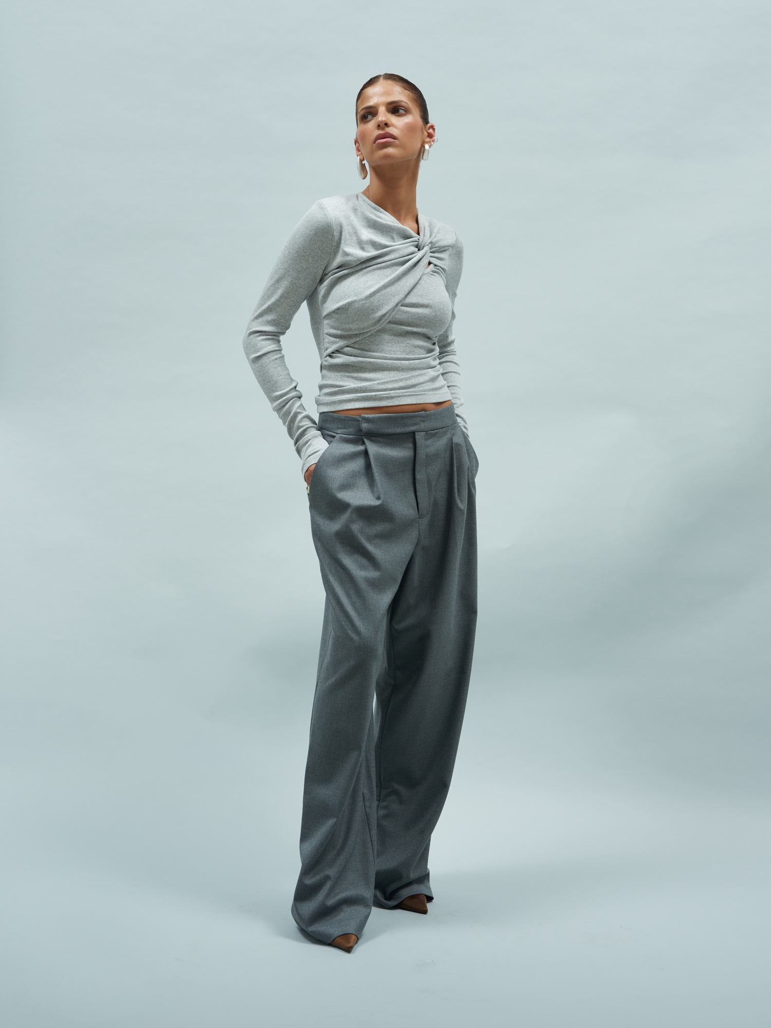 A long-sleeve top with a ribbed texture, crafted from stretch knit that perfectly hugs the body while ensuring all-day comfort. Soft and cozy, yet strikingly feminine thanks to the unique front stitch. This piece stands out from classic basics—simple, but with a bold detail that gives it a modern, slightly dressier edge. Perfect for pairing with elegant outfits or your favorite jeans.