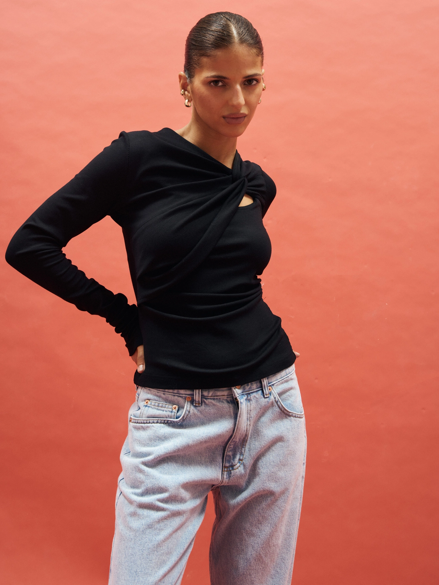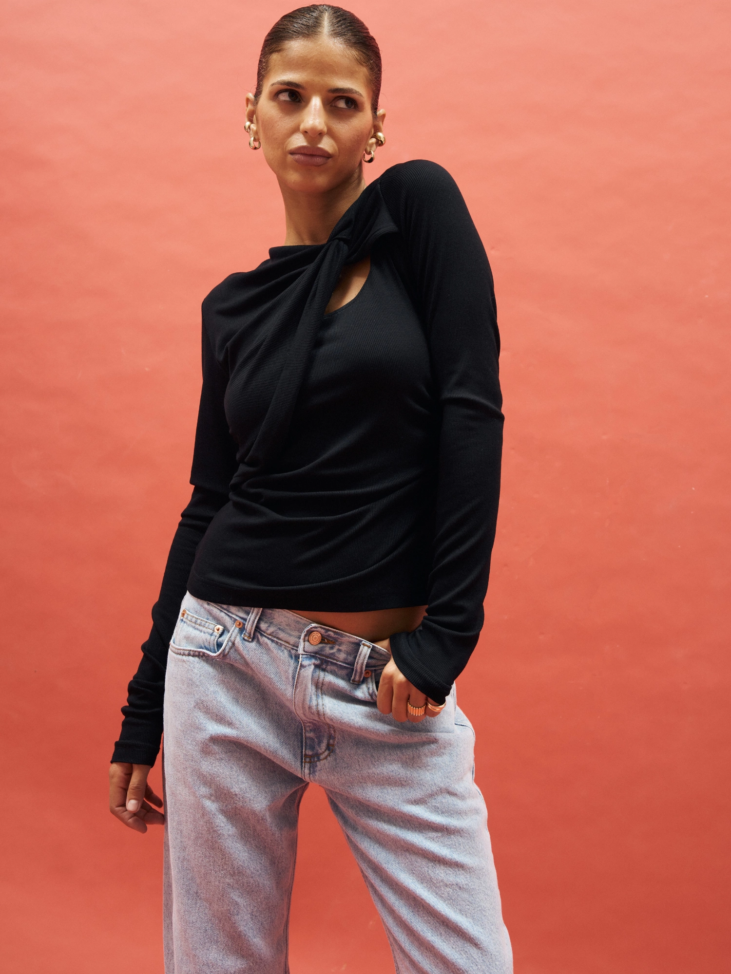 A long-sleeve top with a ribbed texture, crafted from stretch knit that perfectly hugs the body while ensuring all-day comfort. Soft and cozy, yet strikingly feminine thanks to the unique front stitch. This piece stands out from classic basics—simple, but with a bold detail that gives it a modern, slightly dressier edge. Perfect for pairing with elegant outfits or your favorite jeans.