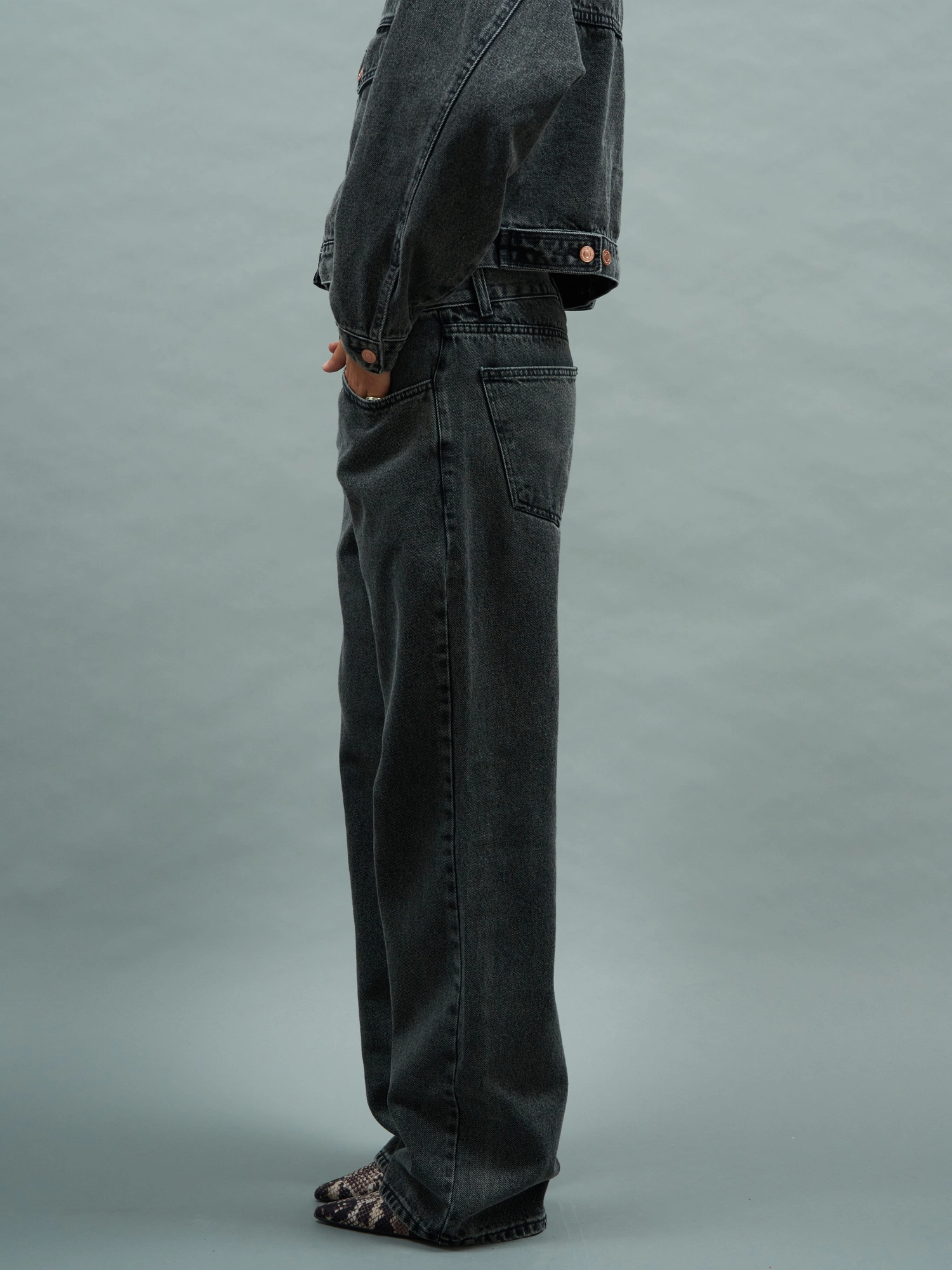 The best jeans in your wardrobe! Straight-cut and made from soft denim in a graphite shade with a vintage washed effect. These jeans feature a classic low-rise fit and a unique adjustable waistband (like those in kids’ collections—internal elastic with buttons, a rare feature in adult designs) so you can tailor them perfectly to your shape. The ideal jeans that truly adapt to you—HOW COOL IS THAT?!