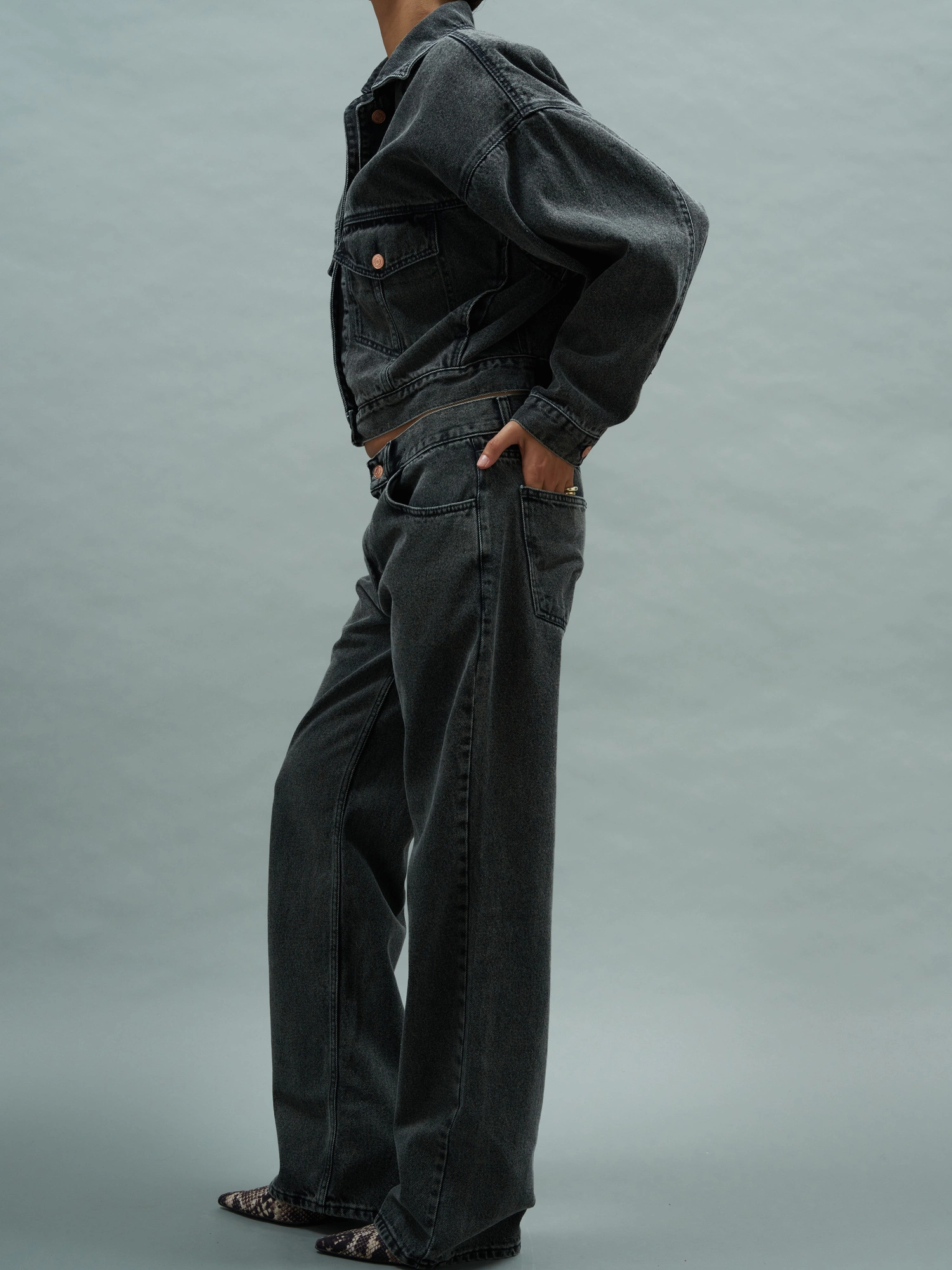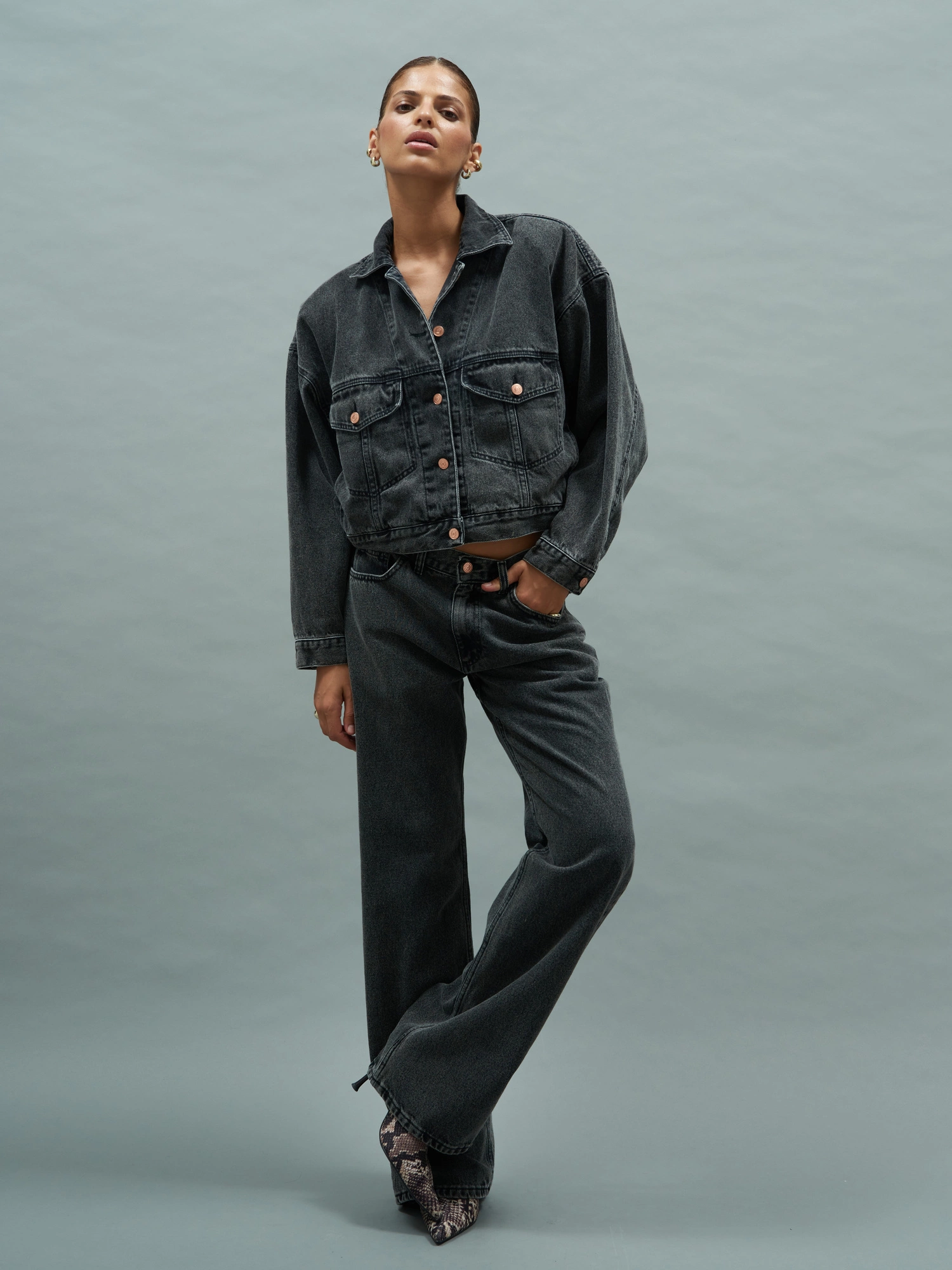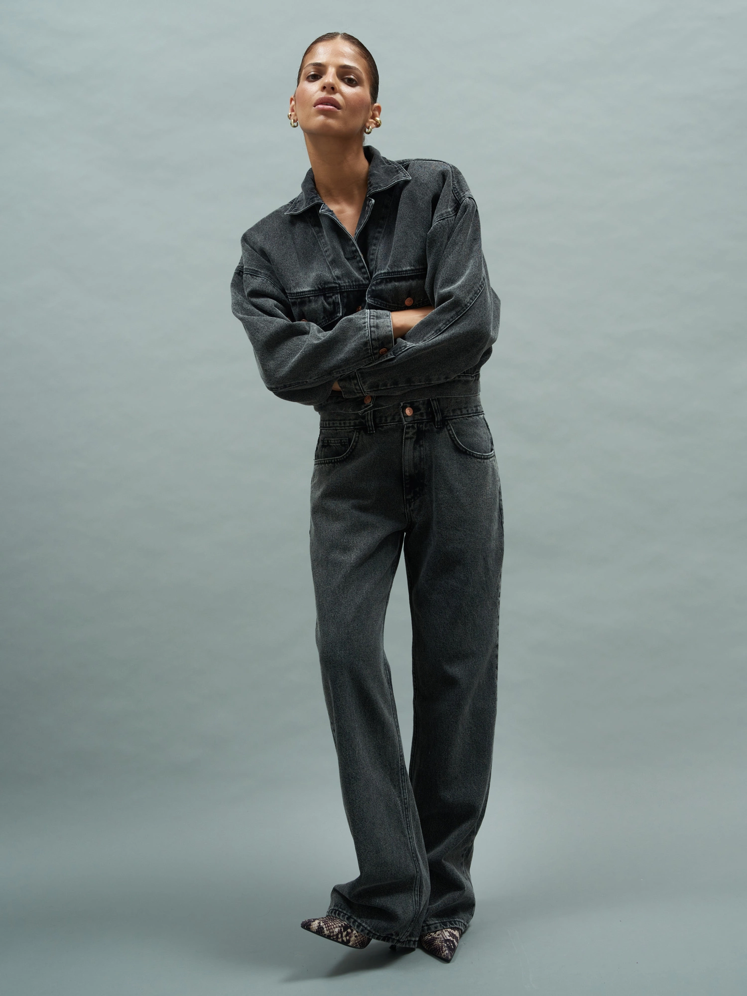 A cropped jacket made from soft denim in a washed graphite shade. It’s a classic cut with a twist—structured shoulders with removable padding. The front features two large pockets, while the back has an adjustable waistband. Wear it as a total look with the DALLAS jeans, with your favorite sweats, or over a dress. A versatile piece that will complement countless outfits, not just for autumn.