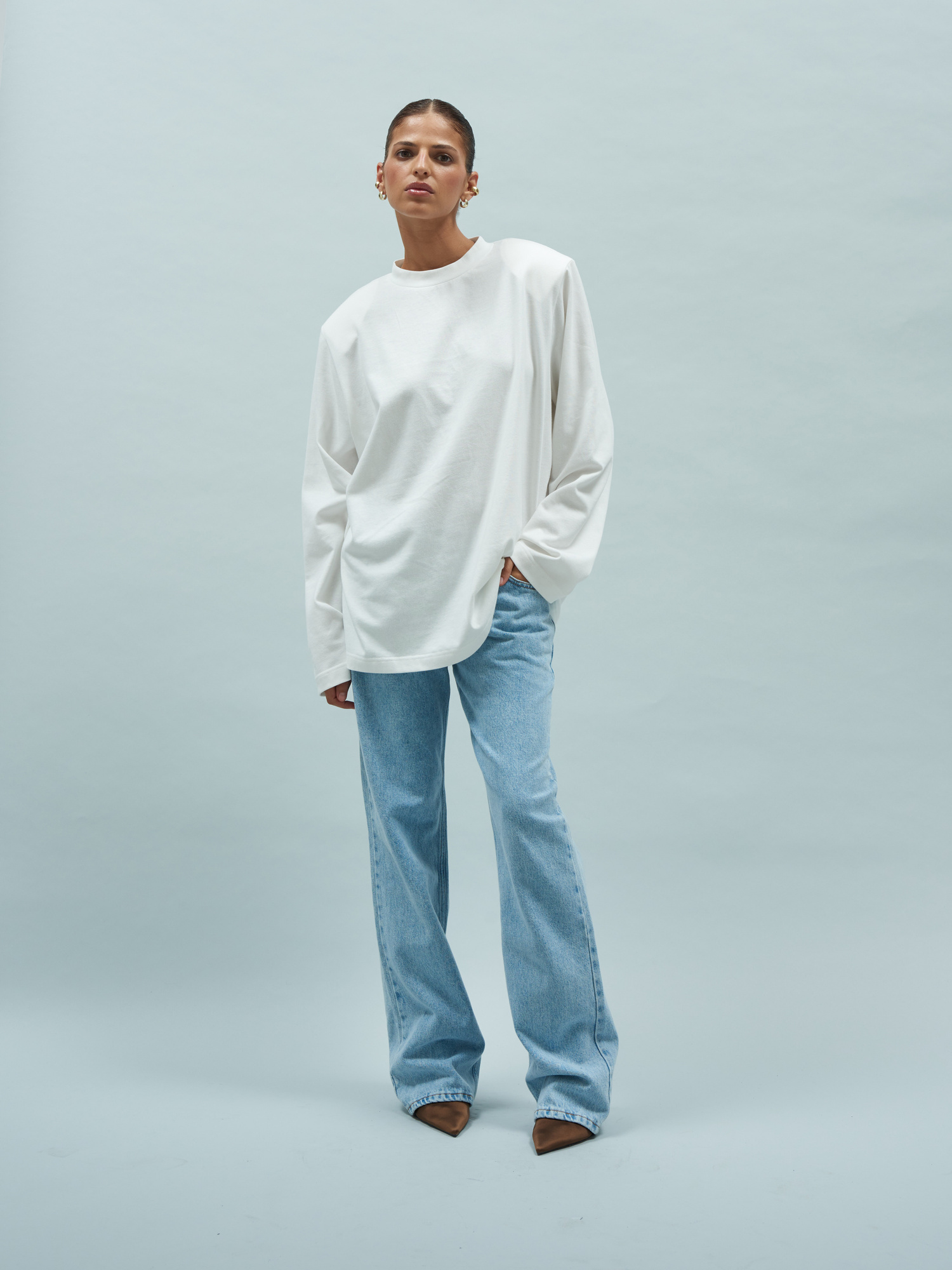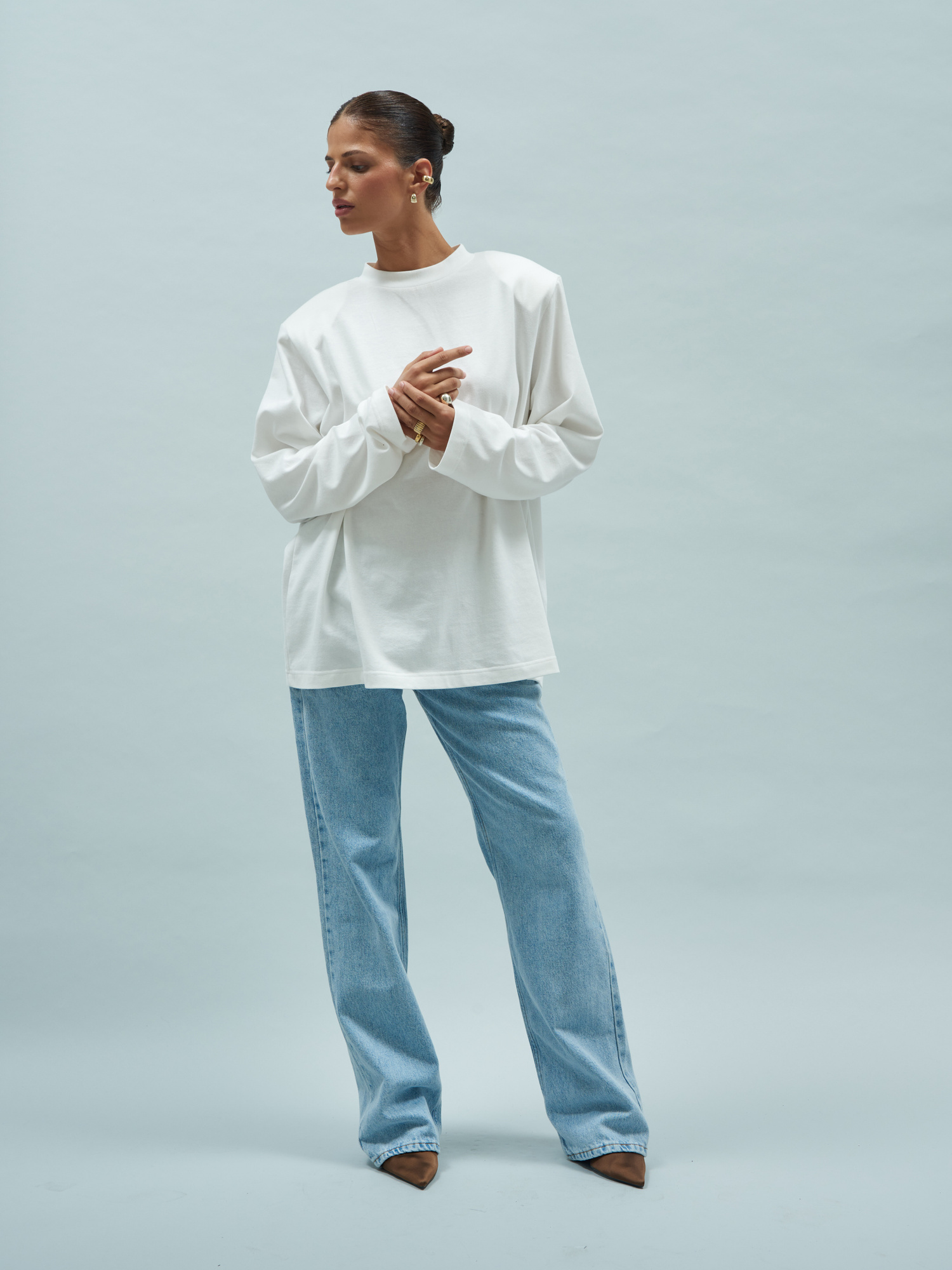 A classic oversized longsleeve. It has long sleeves and strong shoulders highlighted with detachable shoulder pads. Made of 100% cotton, it is soft, breathable, and above all comfortable. It is ideal for everyday and more elegant outfits - paired with jeans or loose-fitting material pants. It is a basic piece with a twist, perfect for any capsule wardrobe.