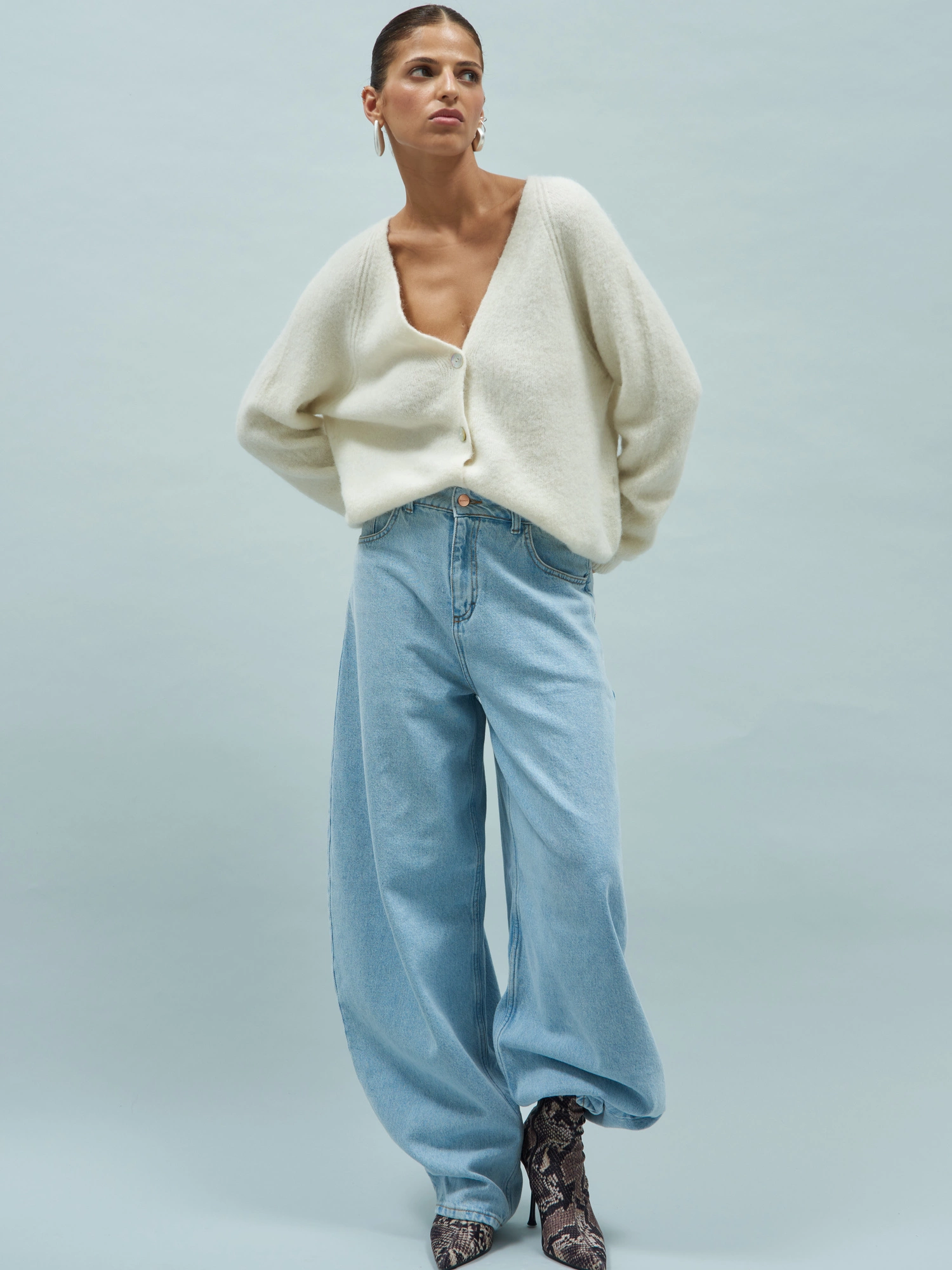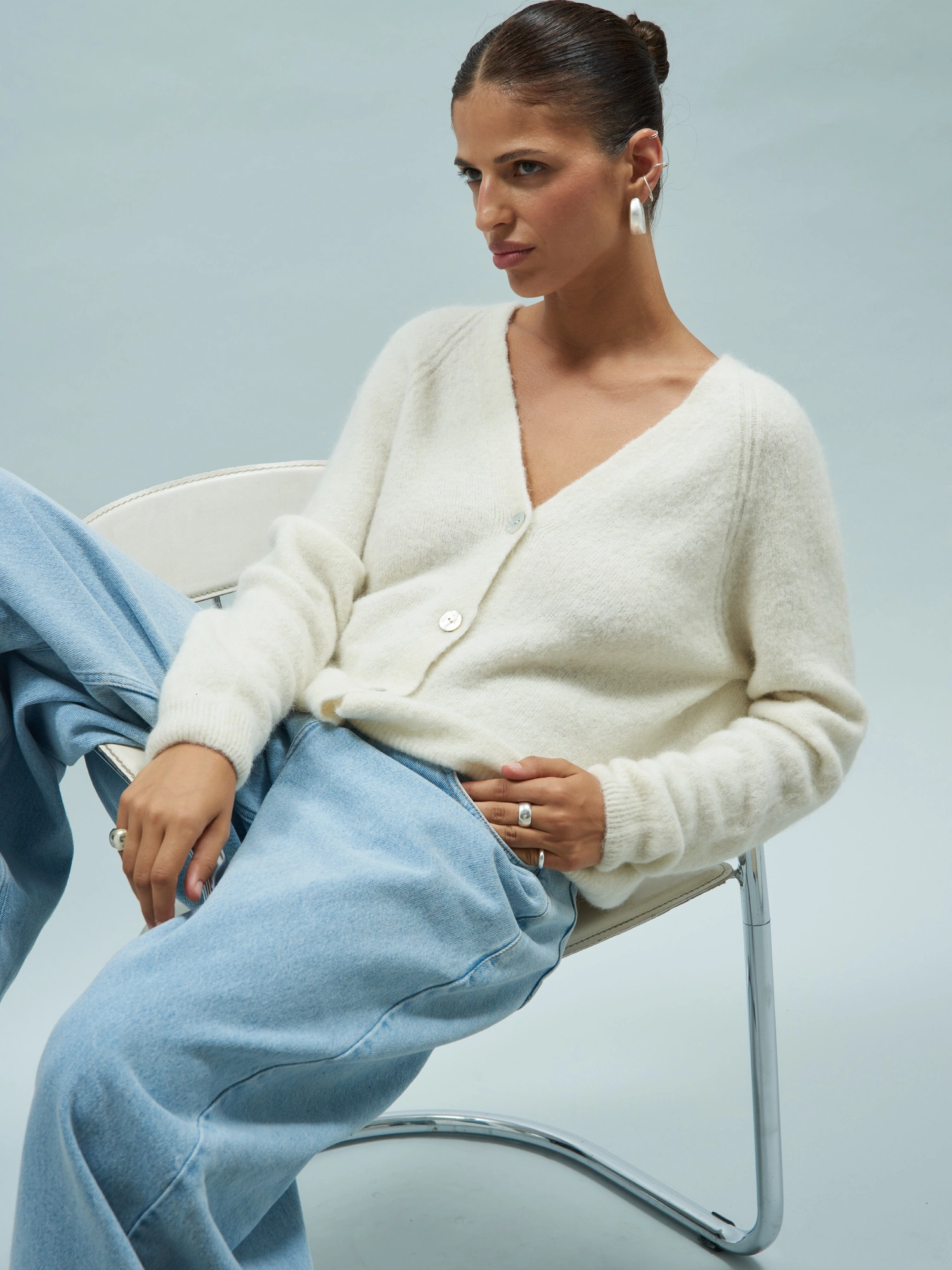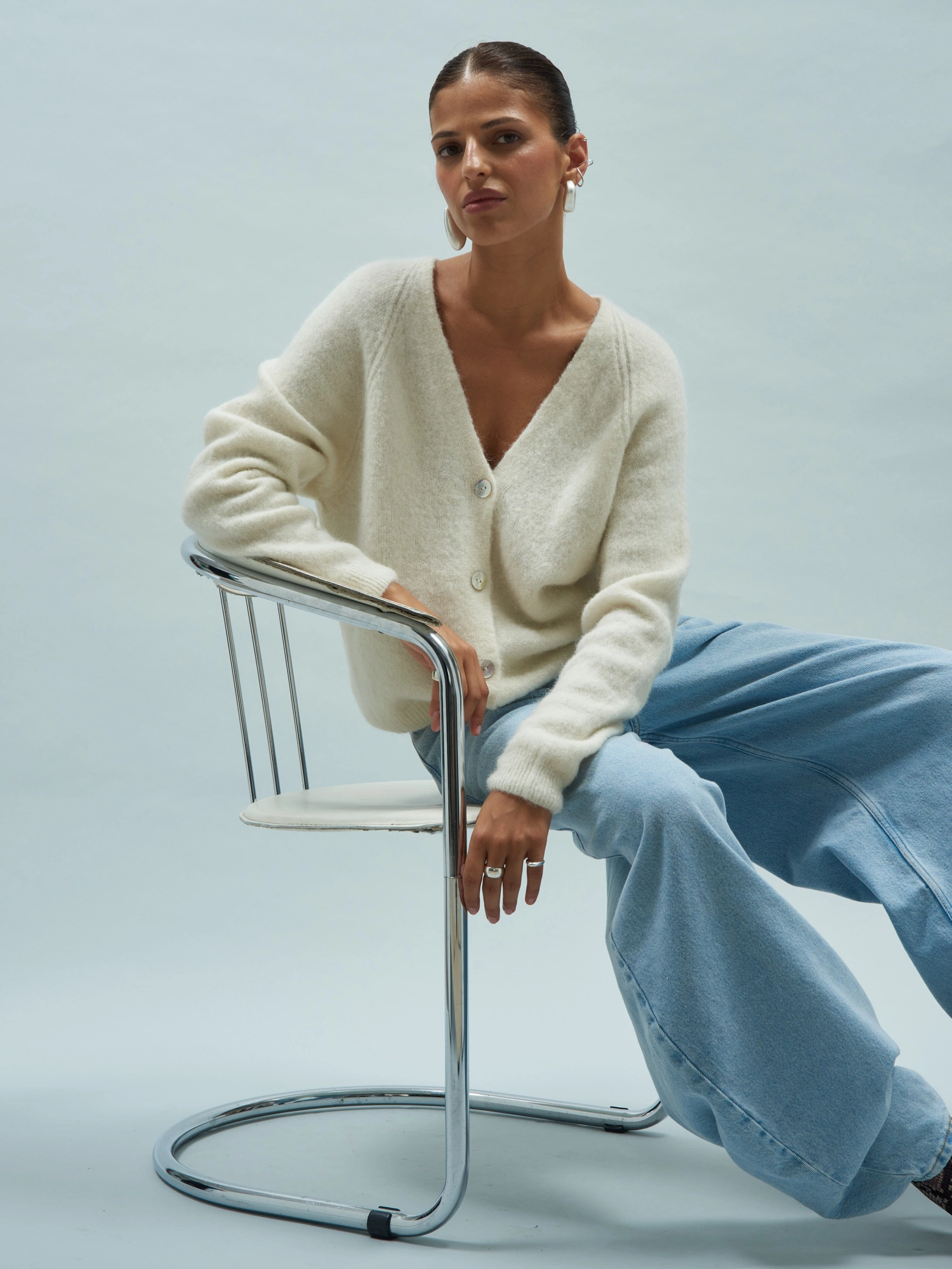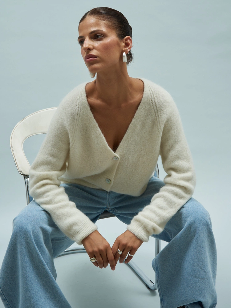 A classic, simple-cut sweater with buttons. It has a V- neckline and long sleeves. Thanks to the baby alpaca wool and virgin wool content, it is incredibly warm, light, and pleasant to the touch. It doesn't itch, fits beautifully, and keeps you cozy on colder days. Its minimalist, timeless design makes it suitable for both everyday and more elegant outfits. Wear it with your favorite jeans, fabric pants, or an elegant skirt—it will work in any version.