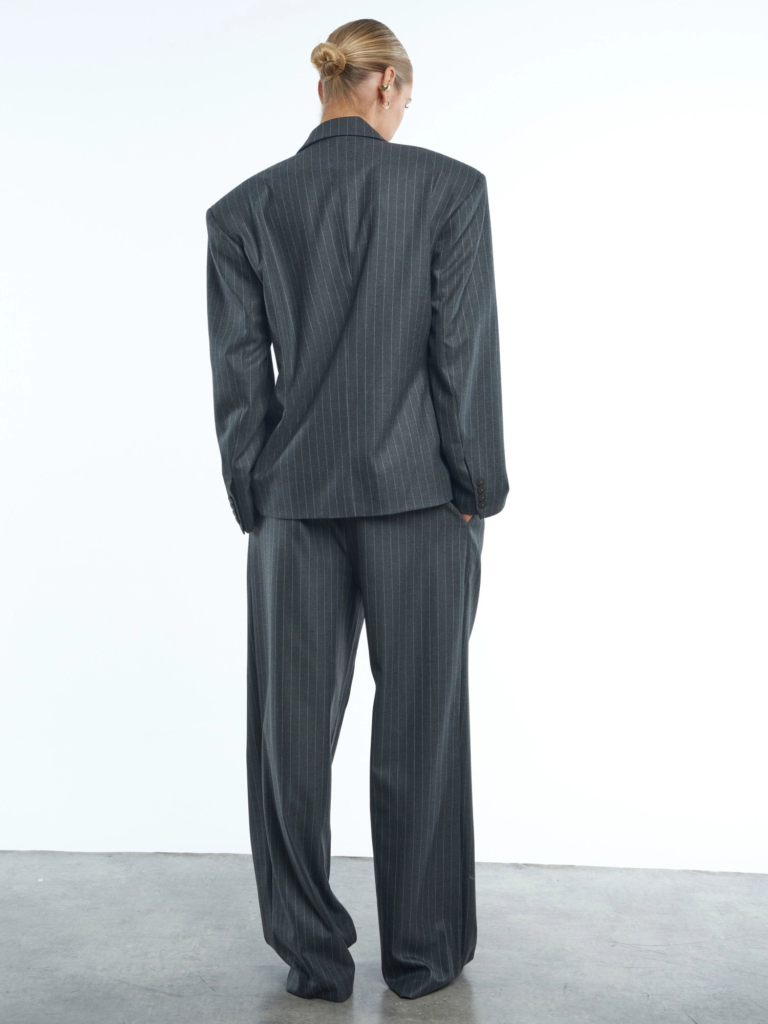 Tailored trousers crafted from a soft, grey fabric with a subtle pinstripe pattern. Inspired by classic menswear, they feature a low-rise waist, wide straight legs, and front pleats for added structure. These trousers are the perfect complement to a matching blazer for a polished look, but work just as well styled casually with a basic tank, classic shirt, or denim jacket.