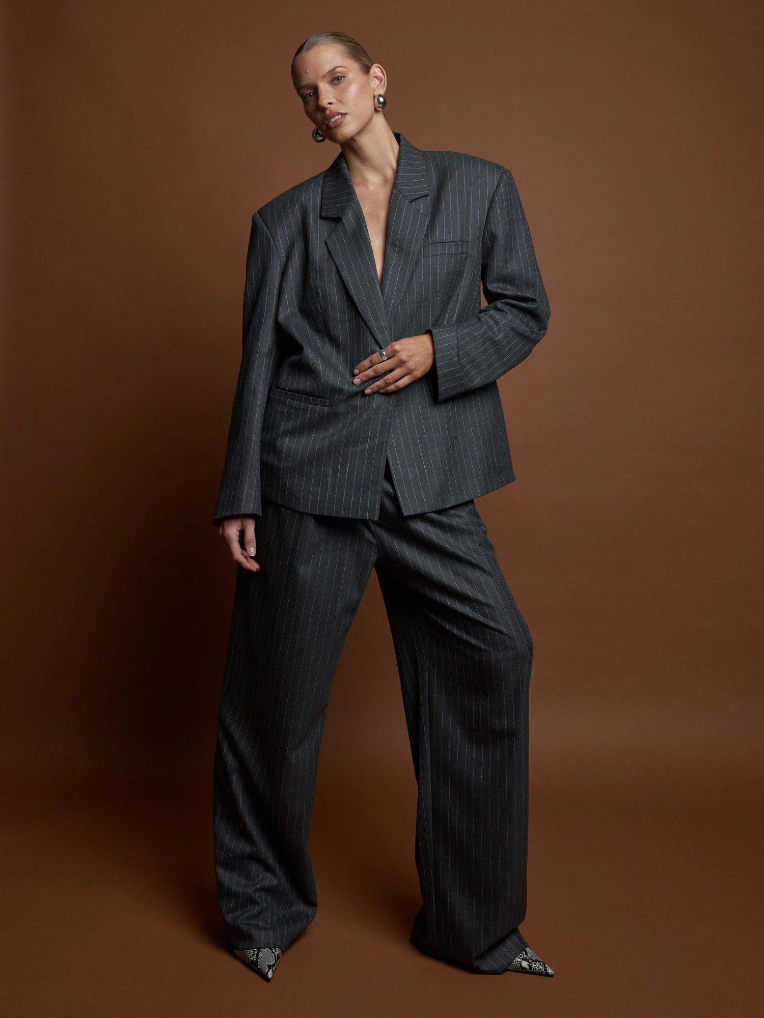 Tailored trousers crafted from a soft, light grey fabric with a subtle pinstripe pattern. Inspired by classic menswear, they feature a low-rise waist, wide straight legs, and front pleats for added structure. These trousers are the perfect complement to a matching blazer for a polished look, but work just as well styled casually with a basic tank, classic shirt, or denim jacket.