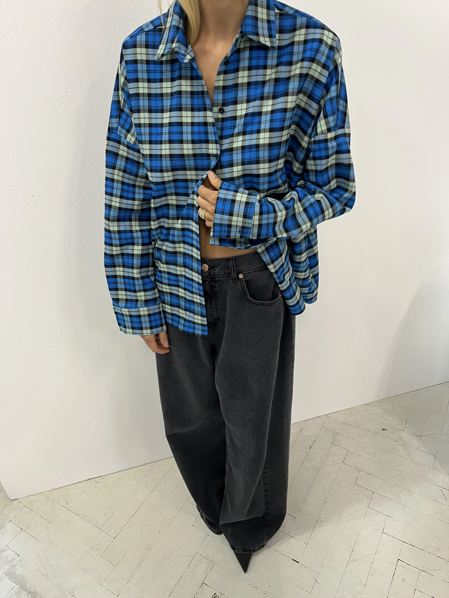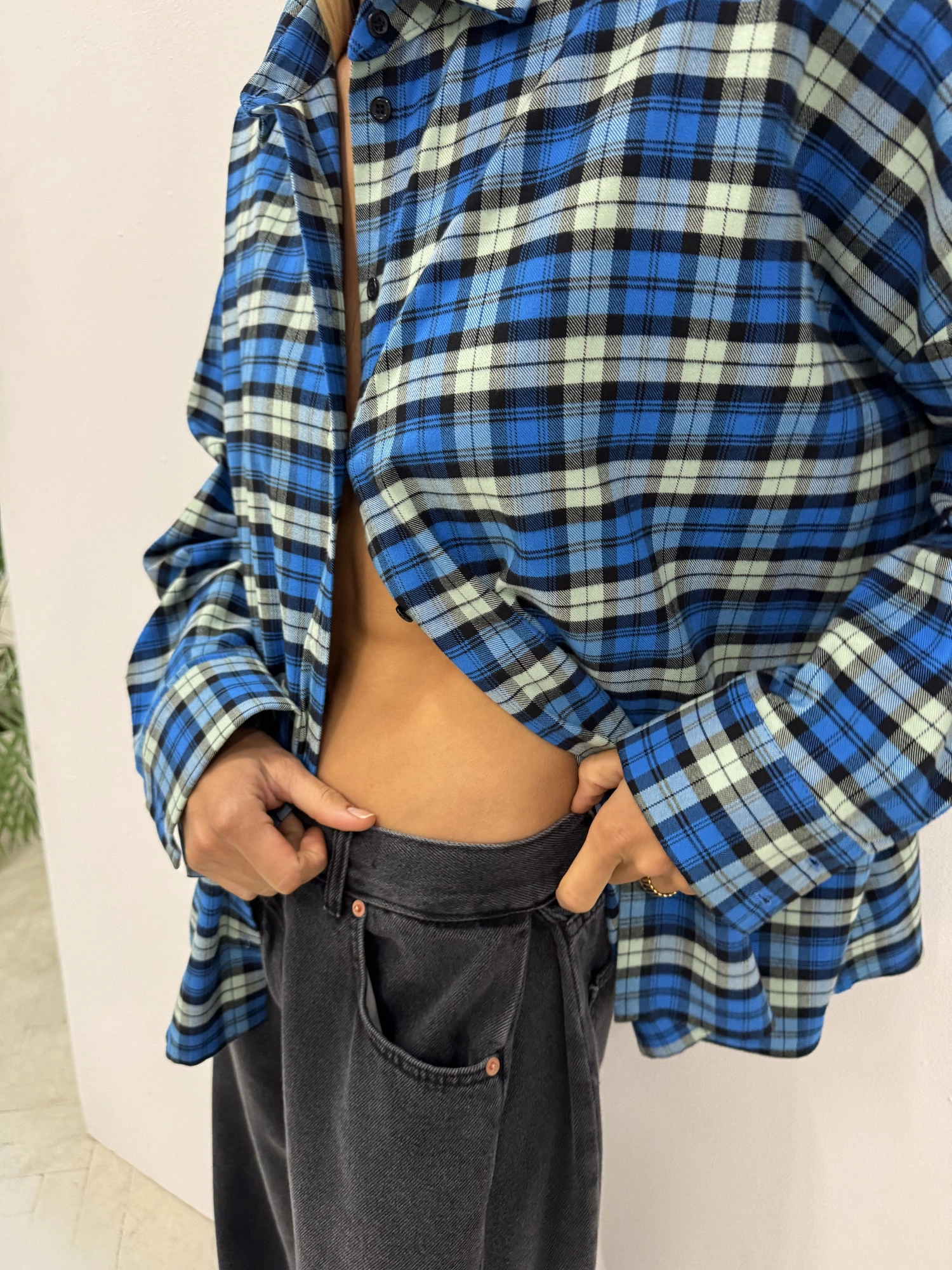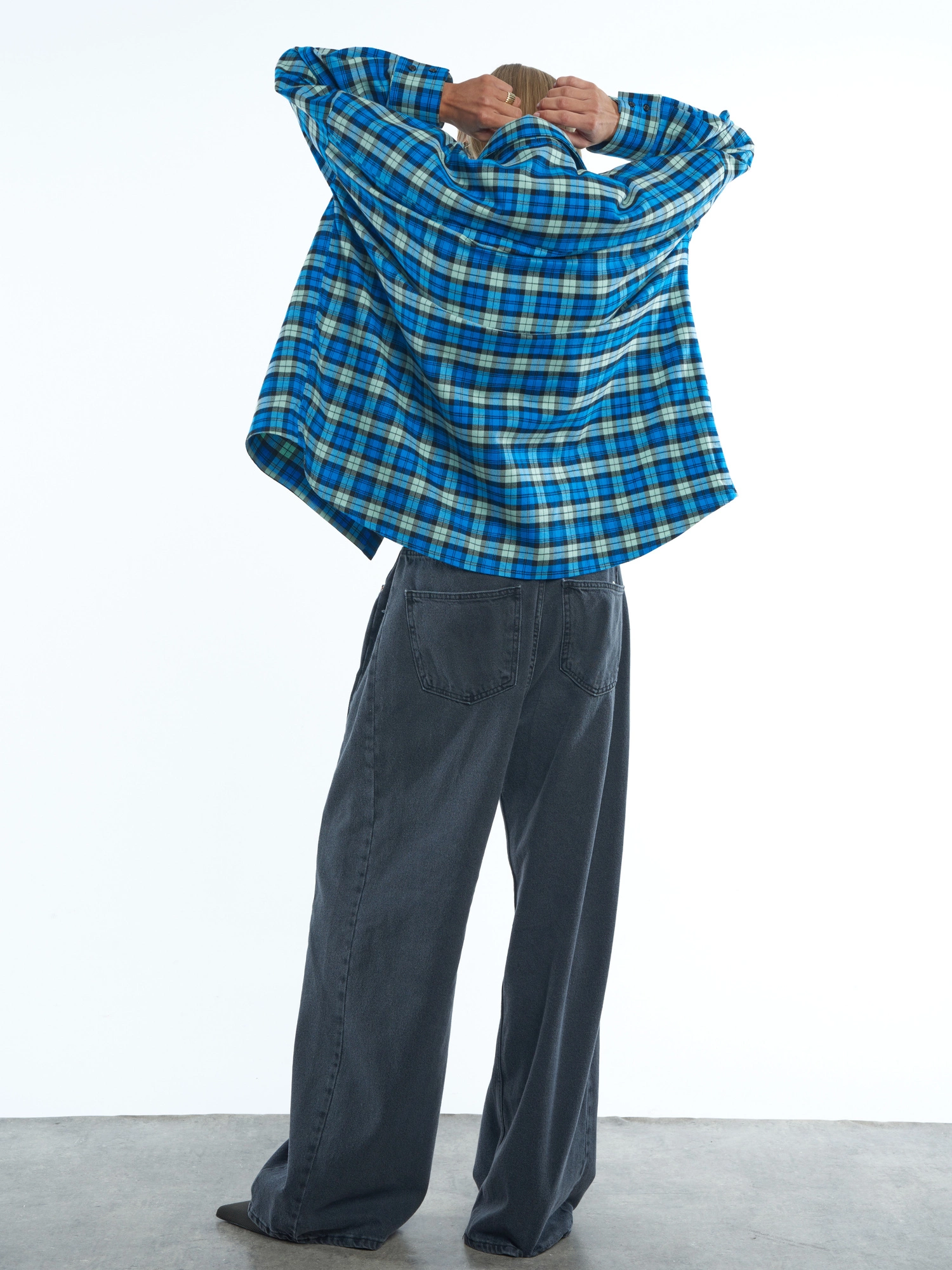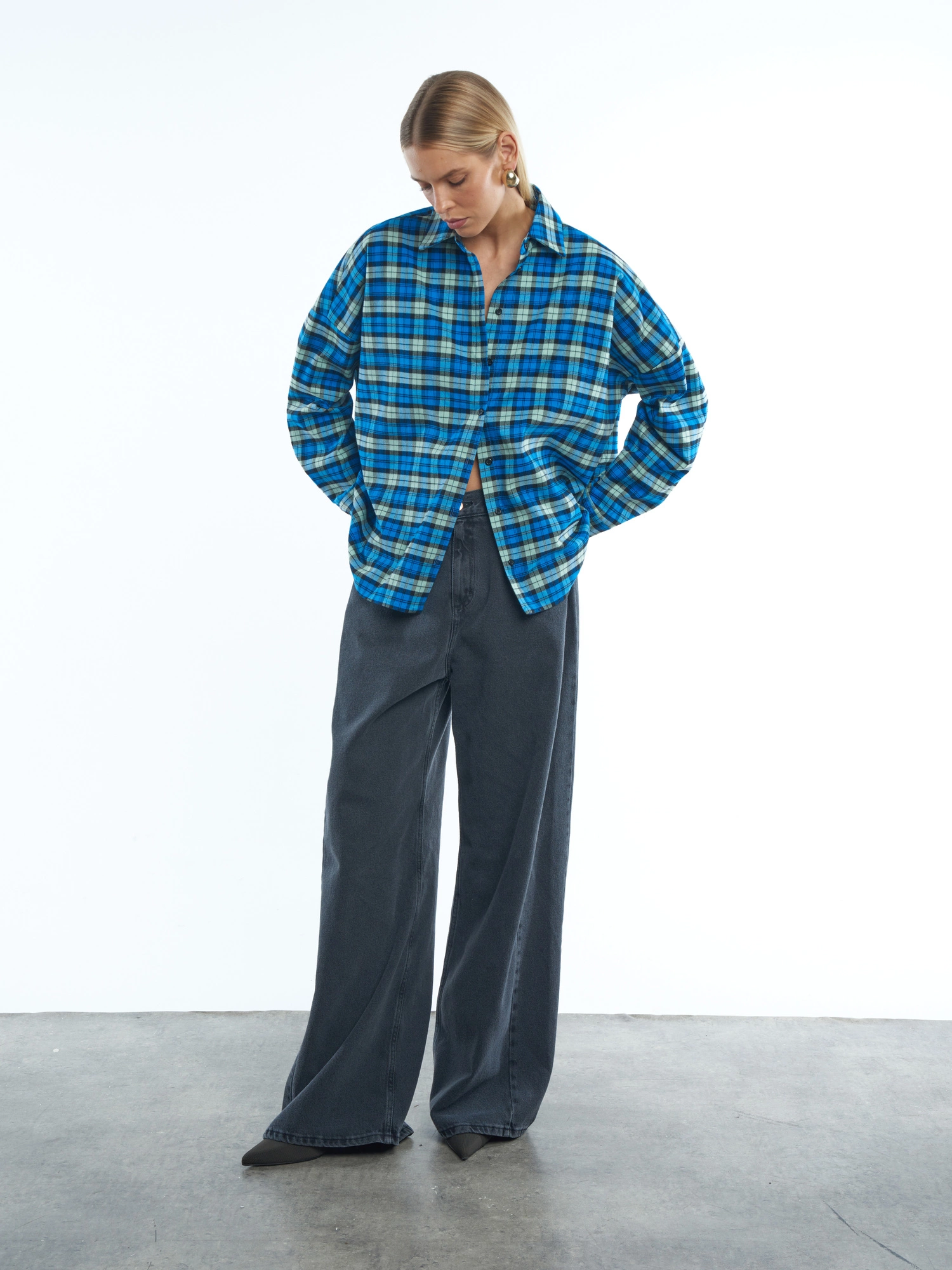 An oversized shirt made of cotton fabric with a signature checkered print. Designed in the style of a worker shirt, it is large, roomy, and styled to look masculine. It has a classic collar and wide cuffs at the sleeves. Wear it with your favorite jeans, throw it over a top and leggings, or tie it loosely at the waist to spice up your tracksuit look - all tricks are allowed.