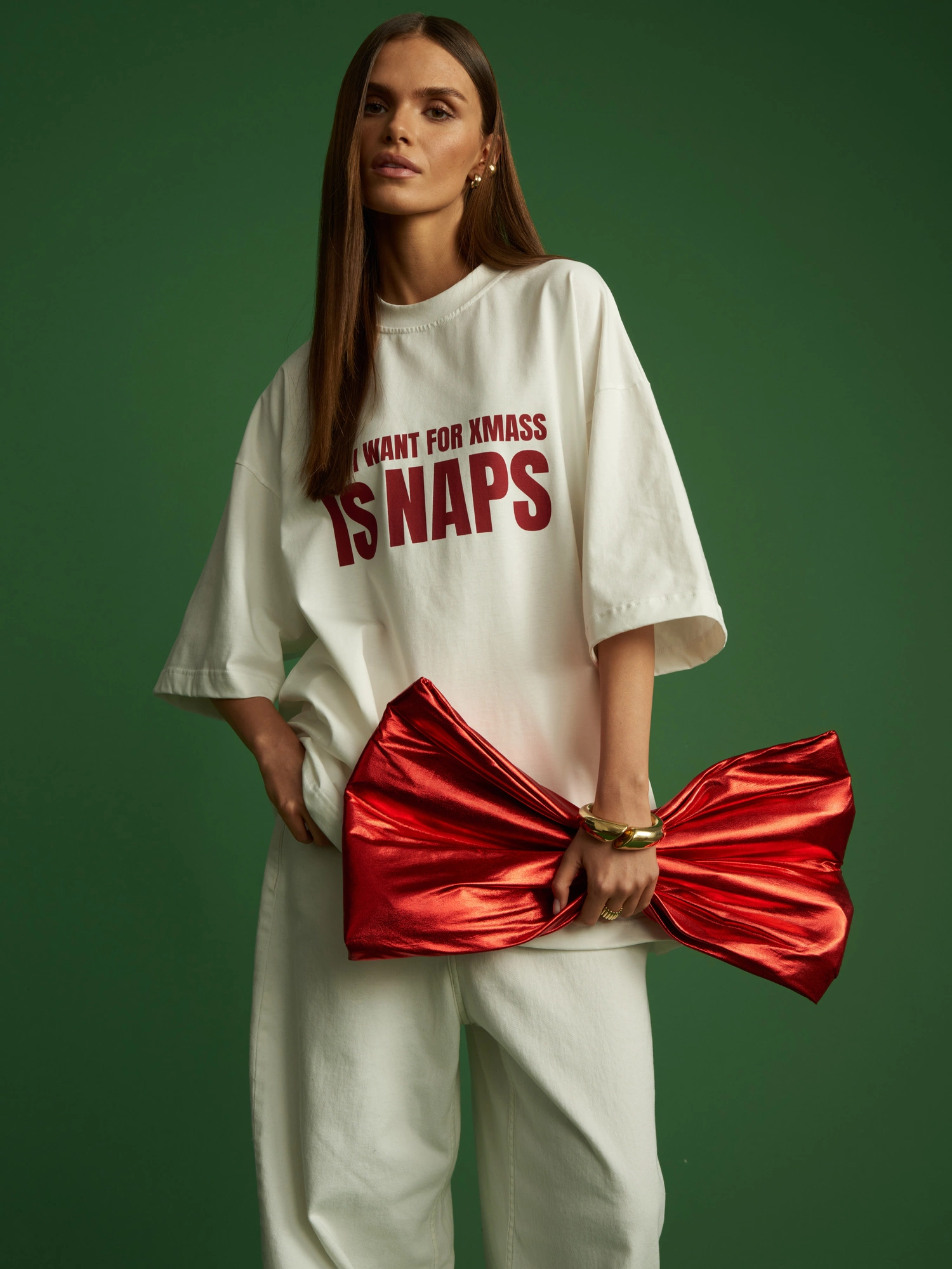 An oversized tee made from 100% soft, high-quality cotton. The relaxed fit and bold All I want for Xmass is NAPS print give it a laid-back, streetwear vibe. Comfortable, stylish, and a little cheeky – wear it your way: with jeans, leggings, or as a fun twist to a more polished look with a skirt or tailored trousers.