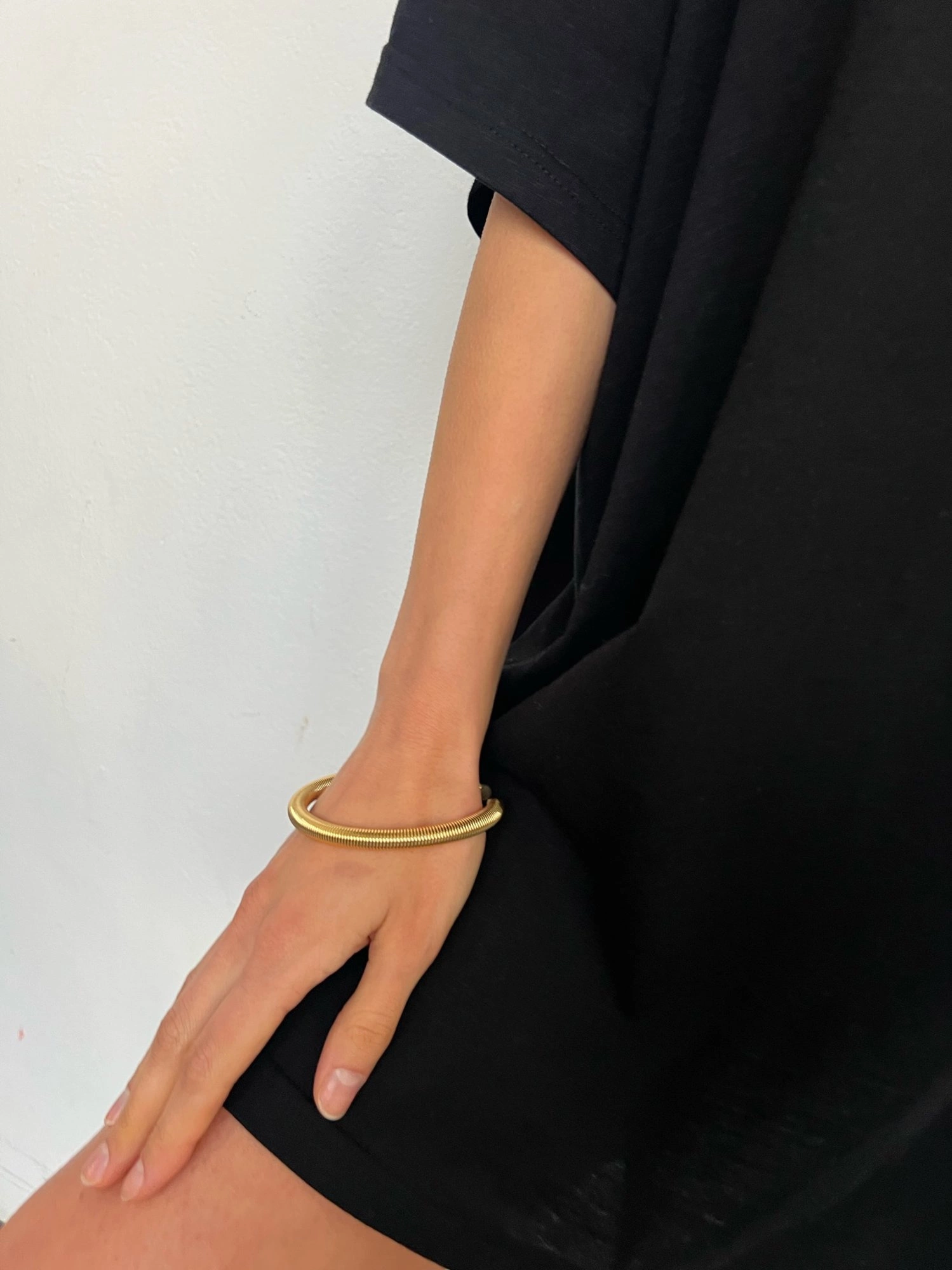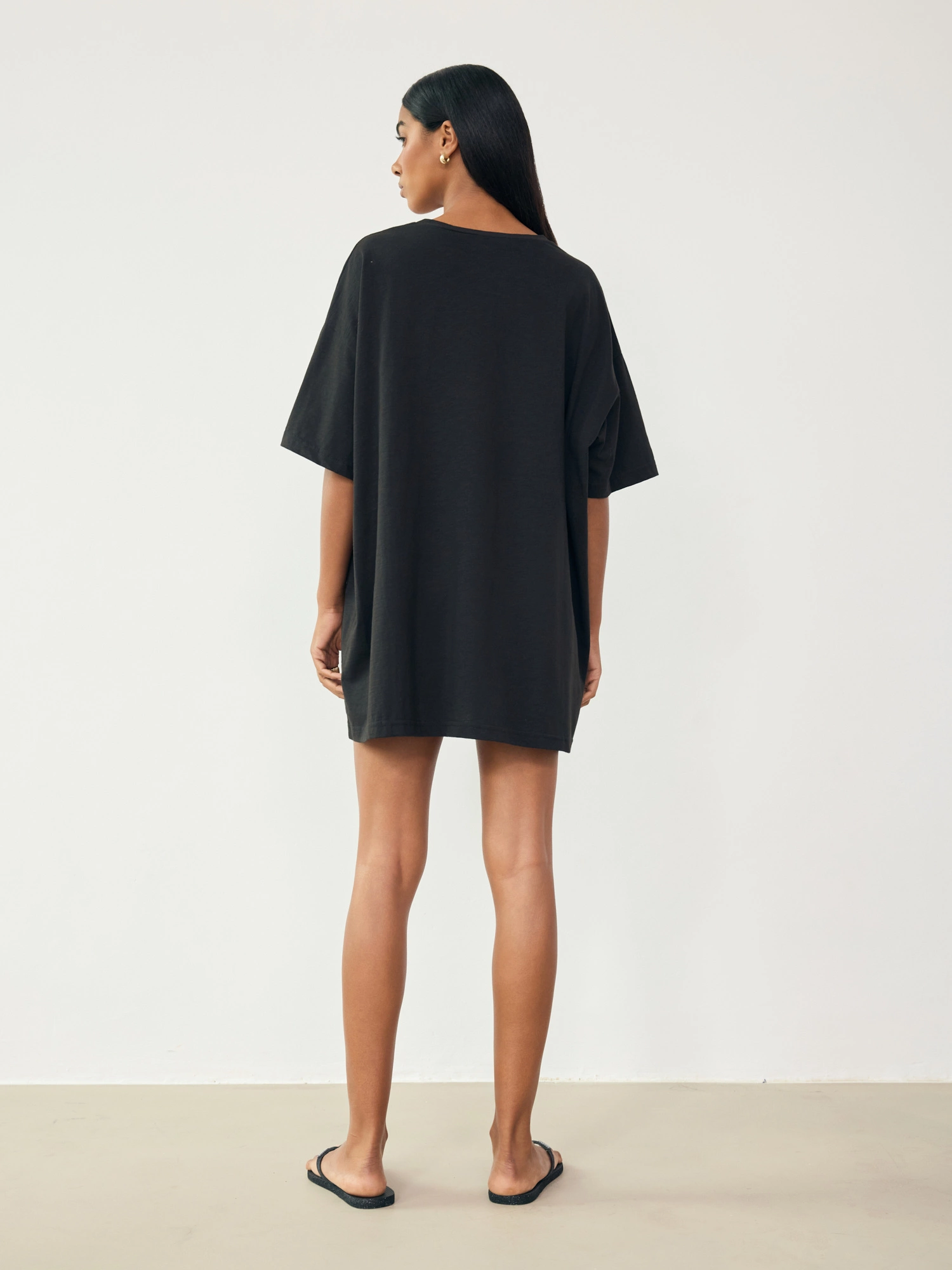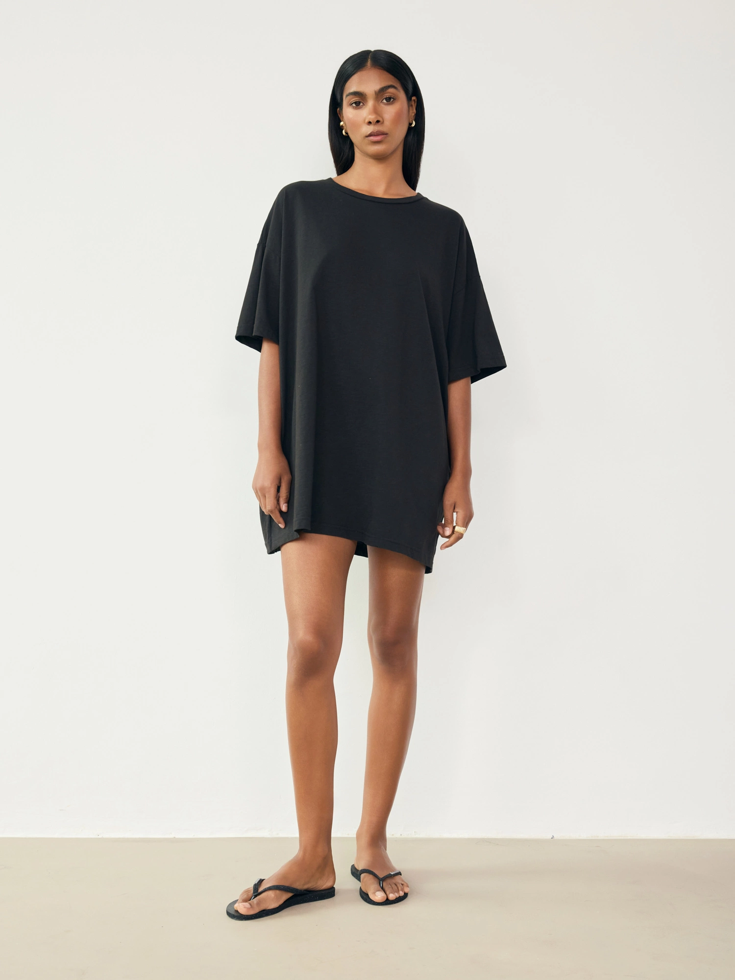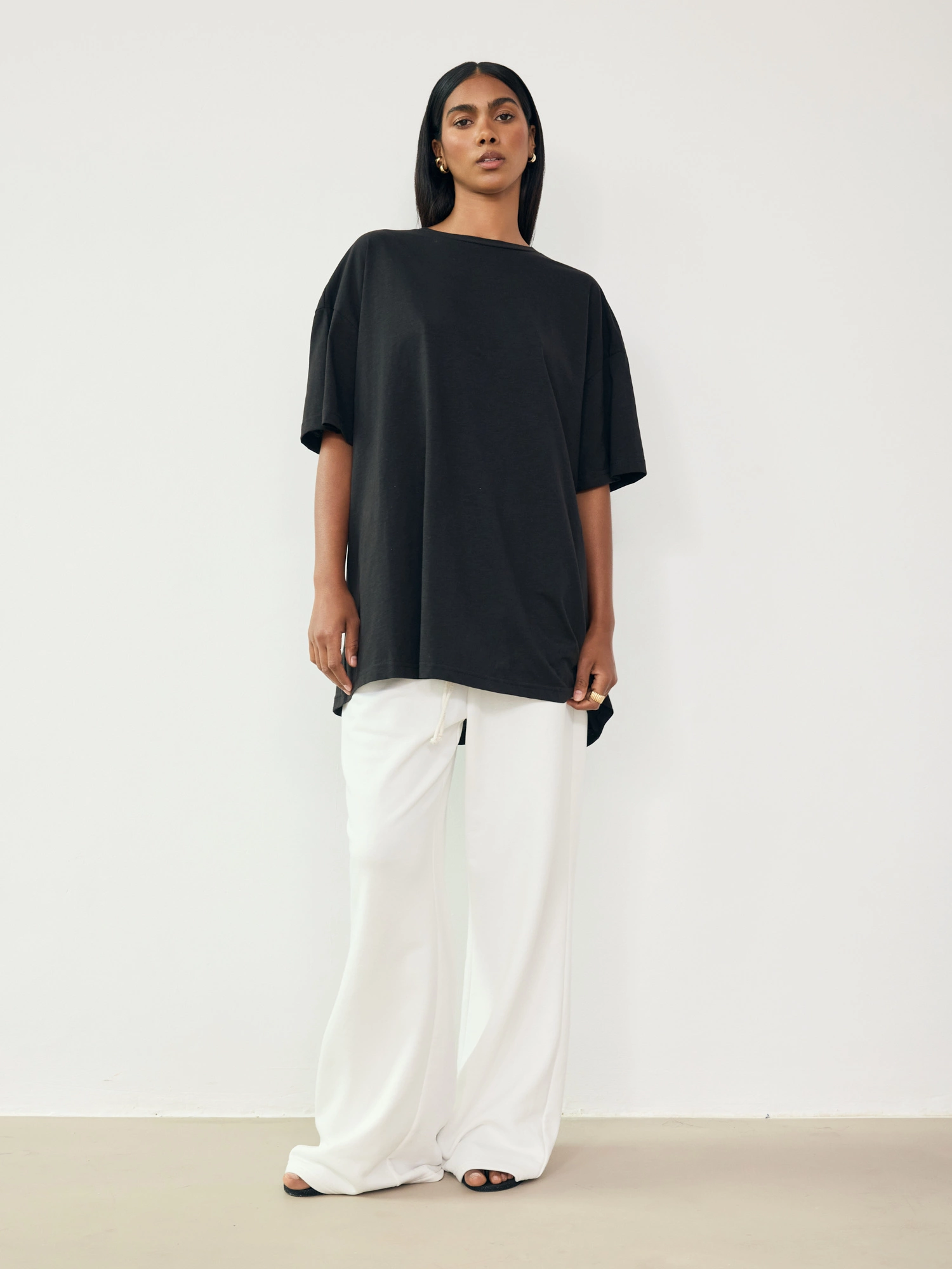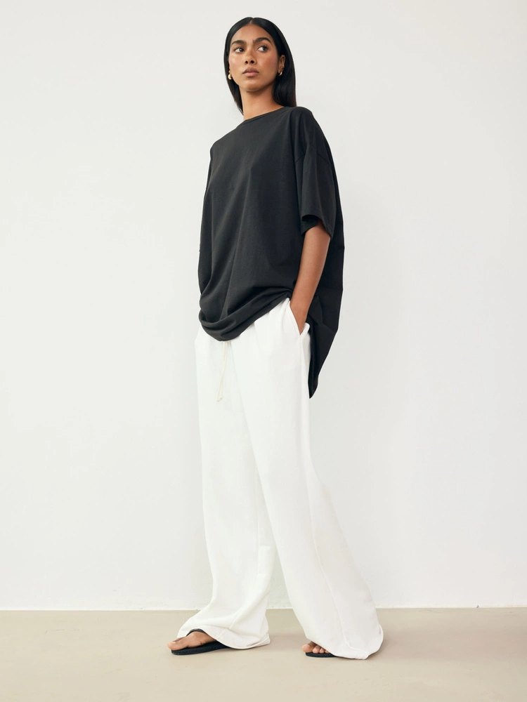 Obszerny, oversizowy T-shirt z charakterystycznie wydłużonymi rękawami. Wykonany z miękkiej bawełny o fakturze płomyka - delikatnej i przyjemnej w noszeniu. Jest długi, dlatego z łatwością możesz nosić go jako tunikę do szortów lub wciągnąć na strój i lecieć na plażę! No i oczywiście jest nieodłącznym towarzyszem naszych dużych bluz i to właśnie on zawsze spod nich wystaje.