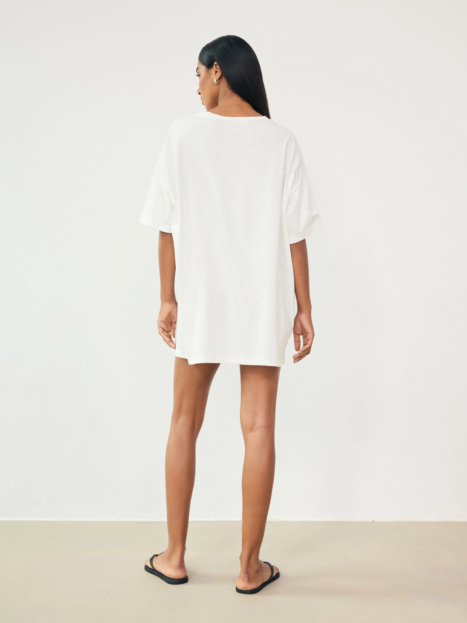 Obszerny, oversizowy T-shirt z charakterystycznie wydłużonymi rękawami. Wykonany z miękkiej bawełny o fakturze płomyka - delikatnej i przyjemnej w noszeniu. Jest długi, dlatego z łatwością możesz nosić go jako tunikę do szortów lub wciągnąć na strój i lecieć na plażę! No i oczywiście jest nieodłącznym towarzyszem naszych dużych bluz i to właśnie on zawsze spod nich wystaje.