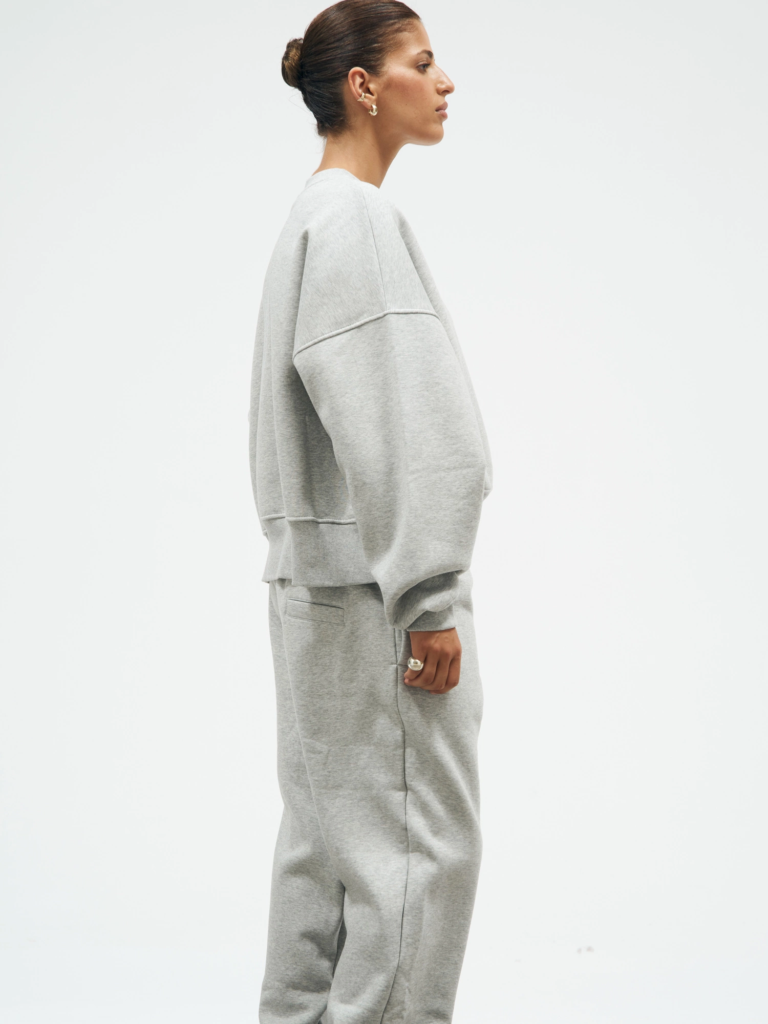 Krótka bluza oversize z szerokim ściągaczem i obniżoną linią ramion. Wykonana z ultra miękkiej bawełny, od wewnątrz wykończona ciepłym misiem. Połącz z JOGGERAMI i stwórz zestaw idealny na jesienną chandrę lub noś z jeansami lub skórzanymi spodniami i ciesz się sportową elegancją w klasycznej, melanżowej szarości.