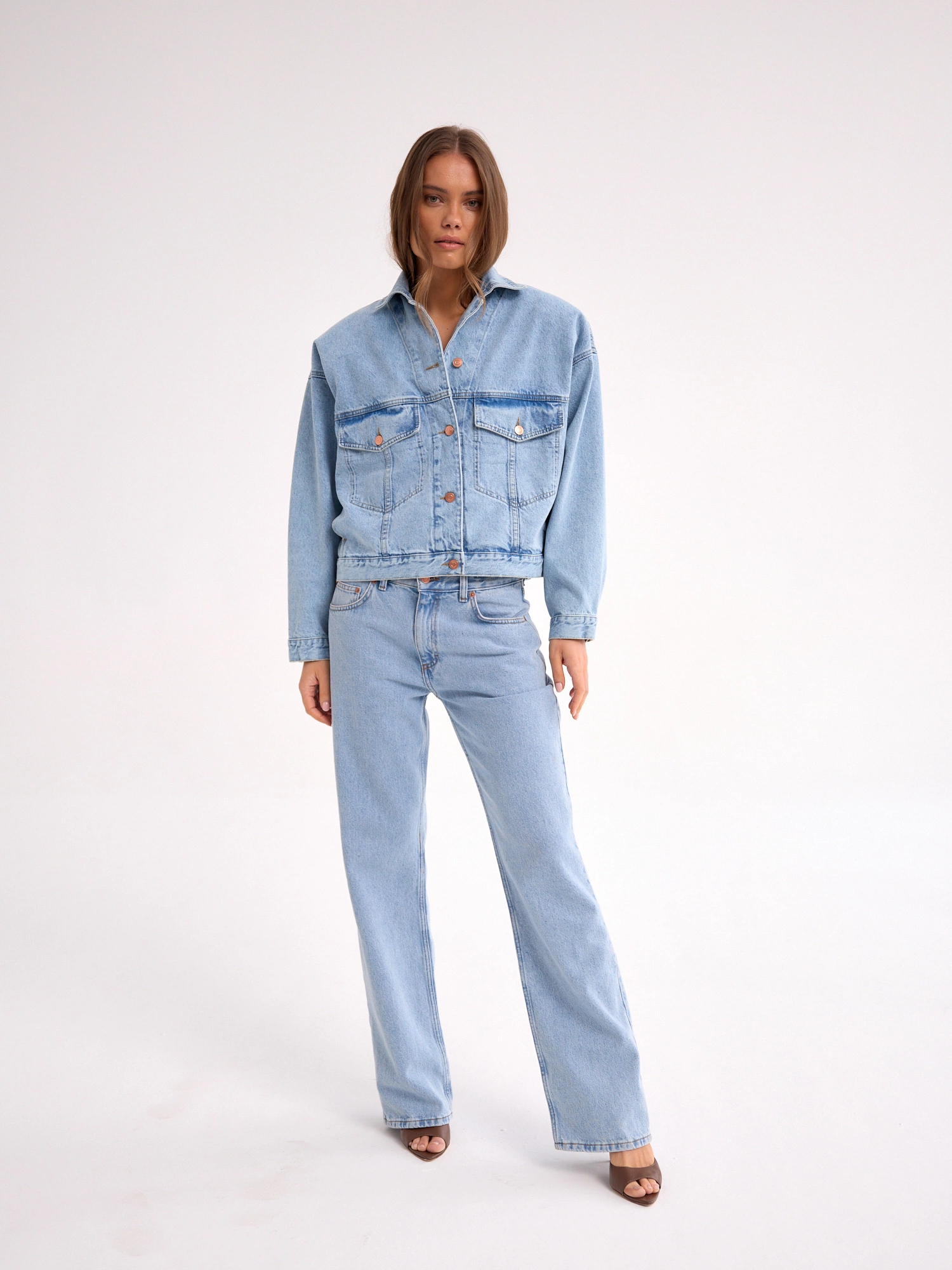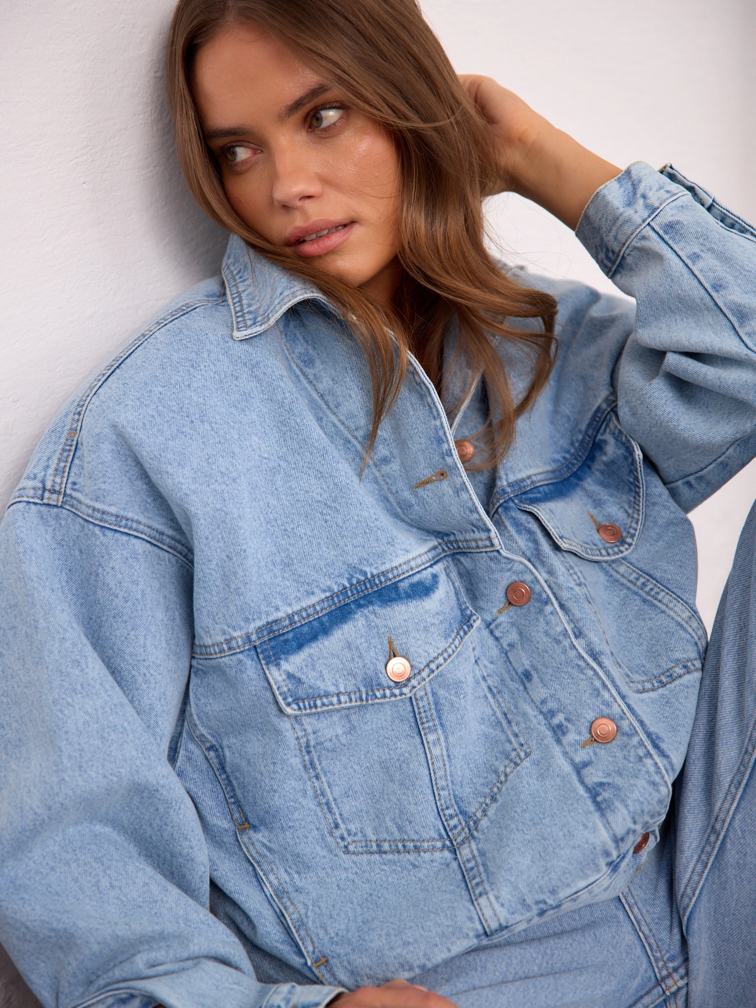 Krótka kurtka wykonana z miękkiego denimu w jasnym odcieniu błękitu. To klasyczny fason podkręcony detalem - mocnymi ramionami z wypinanymi poduszkami. Na przodzie dwie duże kieszenie, na tyle regulacja w pasie. Noś w total looku z JEANSAMI, z ulubionym dresem lub sukienką. To niezawodny dodatek, który uzupełni wiele ponadczasowych stylizacji.