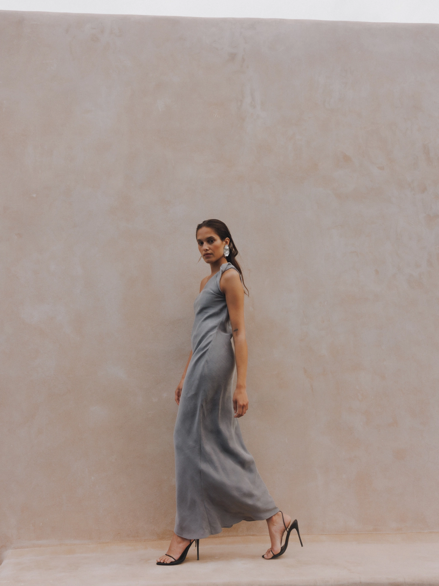 Bankietowa sukienka maxi. Wykonana z miękkiej i lejącej mieszanki wiskozy i lyocelu o delikatnym, atłasowym połysku. Jest dopasowana z lekko rozkloszowanym dołem. Jej największym atutem jest jednak asymetryczna góra i skręcone ramiączko, które pięknie eksponuje ramię i podkreśla linię biustu. To niezwykle elegancka propozycja, która z pewnością idealnie sprawdzi się podczas najważniejszych i wielkich wyjść.
