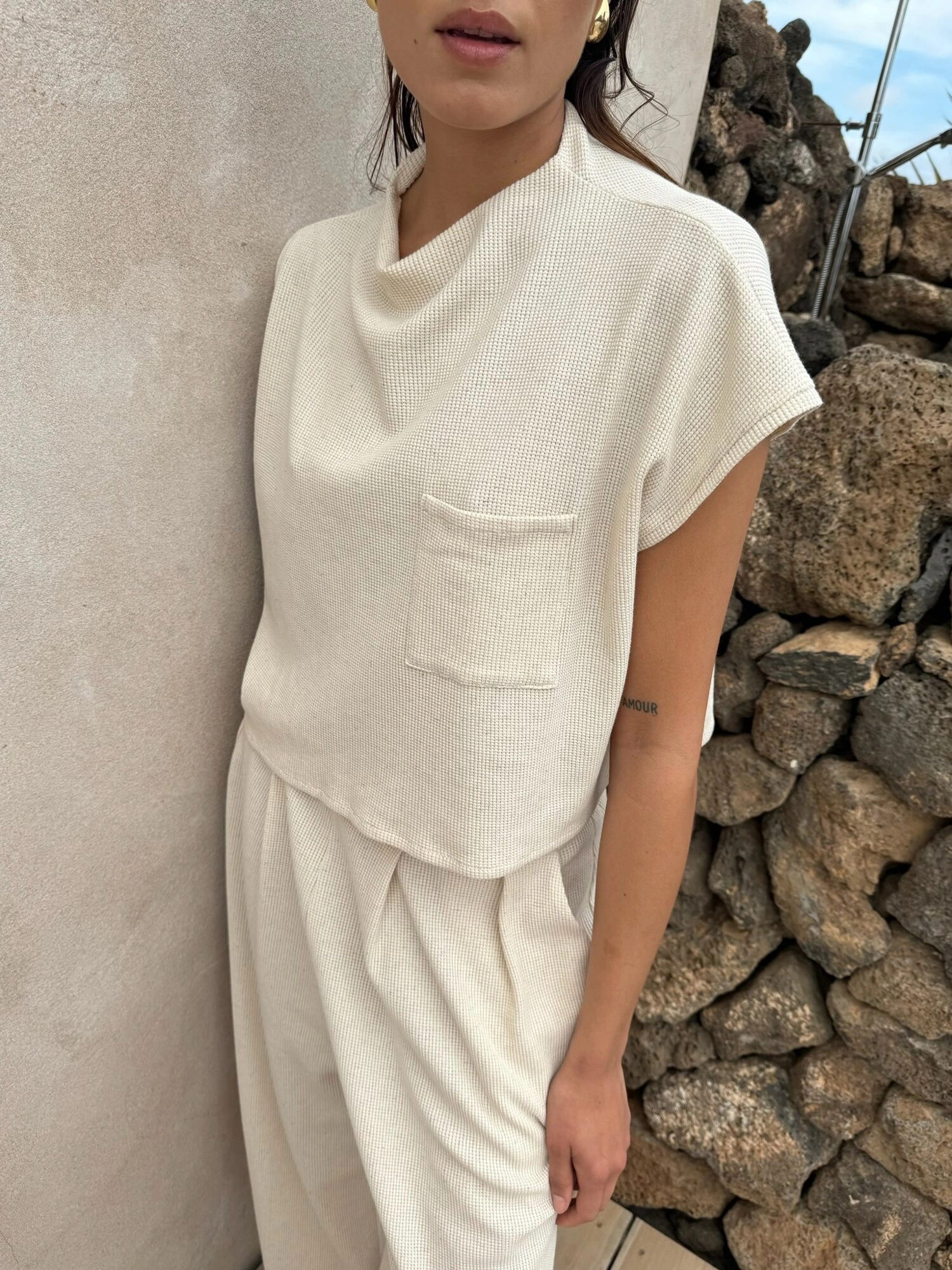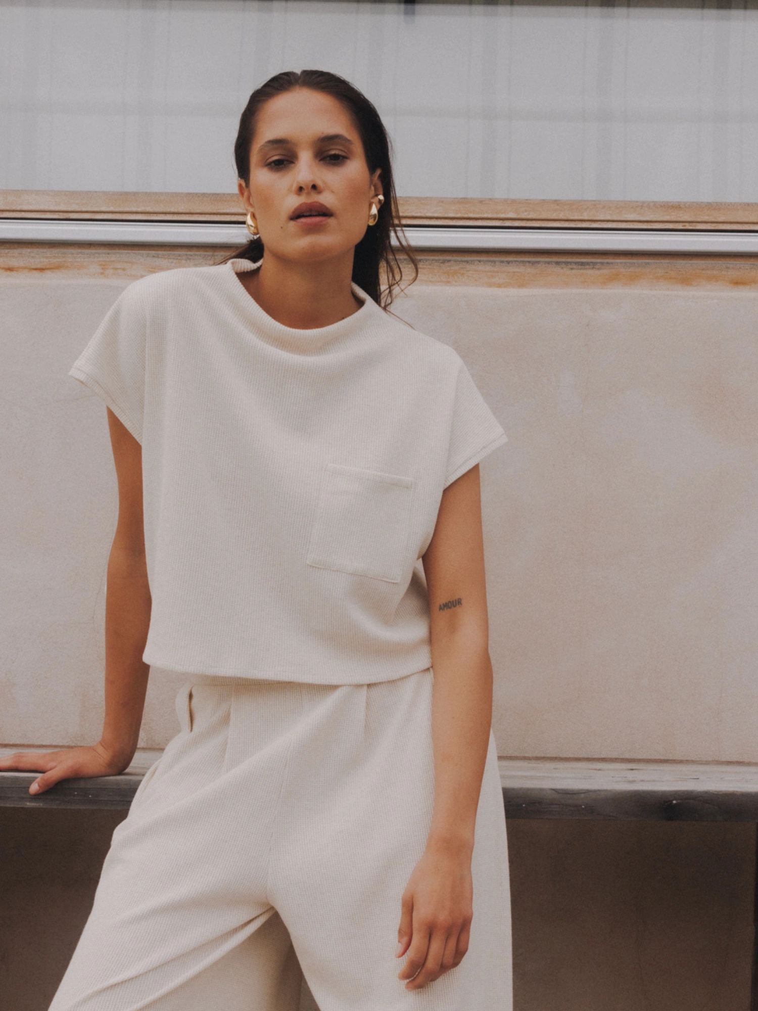 Top wykonany z miękkiej bawełny z dodatkiem lnu o charakterystycznej fakturze wafelka. Ma krótki, pudełkowy krój z luźniejszą stójką i kieszenią na piersi. W zestawie ze SPODNIAMI będzie minimalistyczną i nieco bardziej elegancką alternatywą dla dresów. Noś z jeansami, ulubionymi spodniami z materiału lub szortami i zamień swój basicowy T-shirt na coś extra.