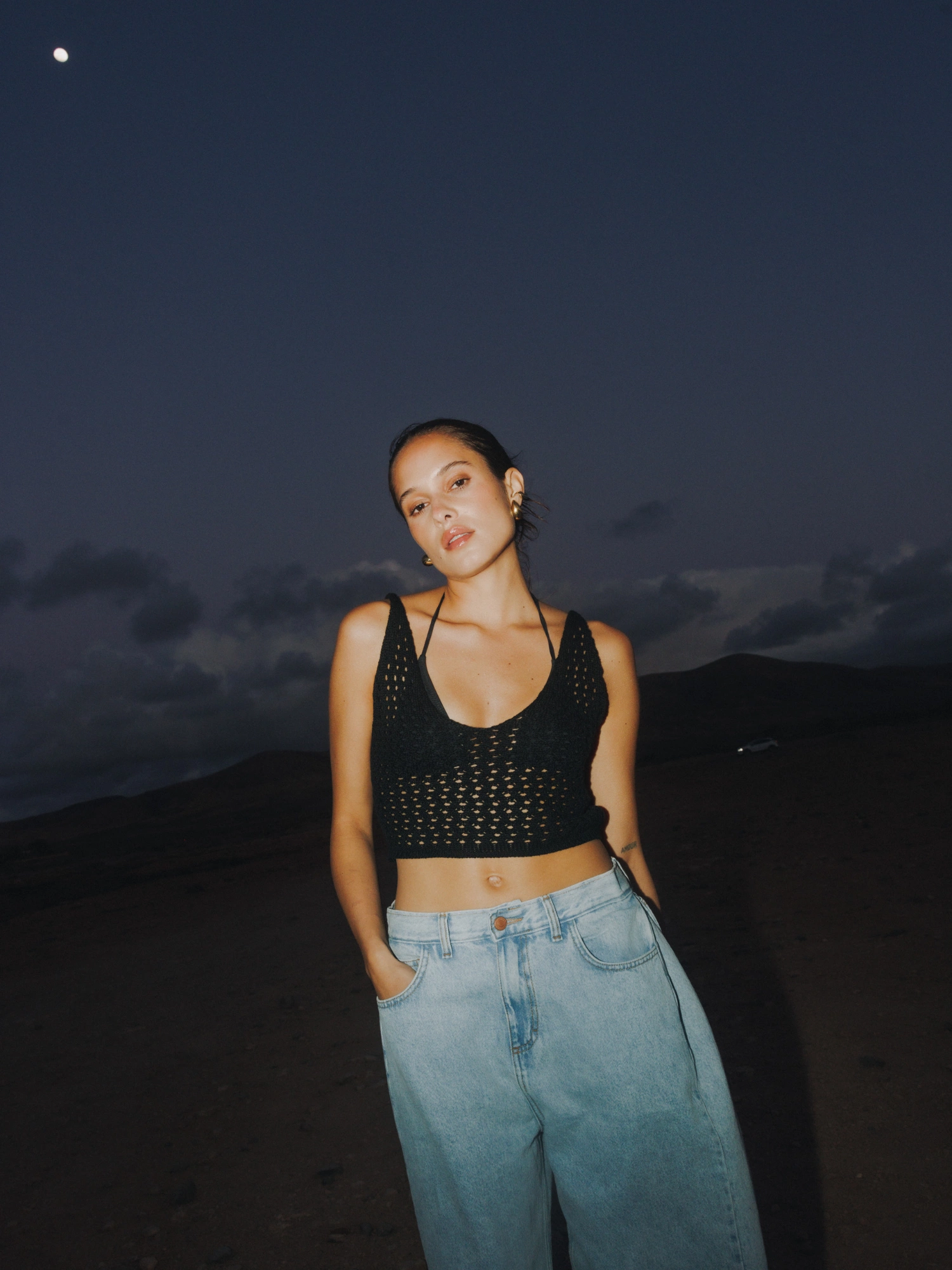 Krótki dzianinowy top, wykonany z miękkiej i delikatnej dla skóry przędzy z bawełną. Ma głęboki dekolt V i wąskie ramiączka. To świetna alternatywa dla klasycznych koszulek basic, bo nie tylko zapewnią Ci komfort w upalne dni, ale i dodadzą do stylizacji odrobinę dziewczęcej nonszalancji. Noś z jeansami, spódnicą lub szortami z wysokim stanem, luźnymi, lnianymi, a nawet tymi bardziej eleganckimi spodniami.