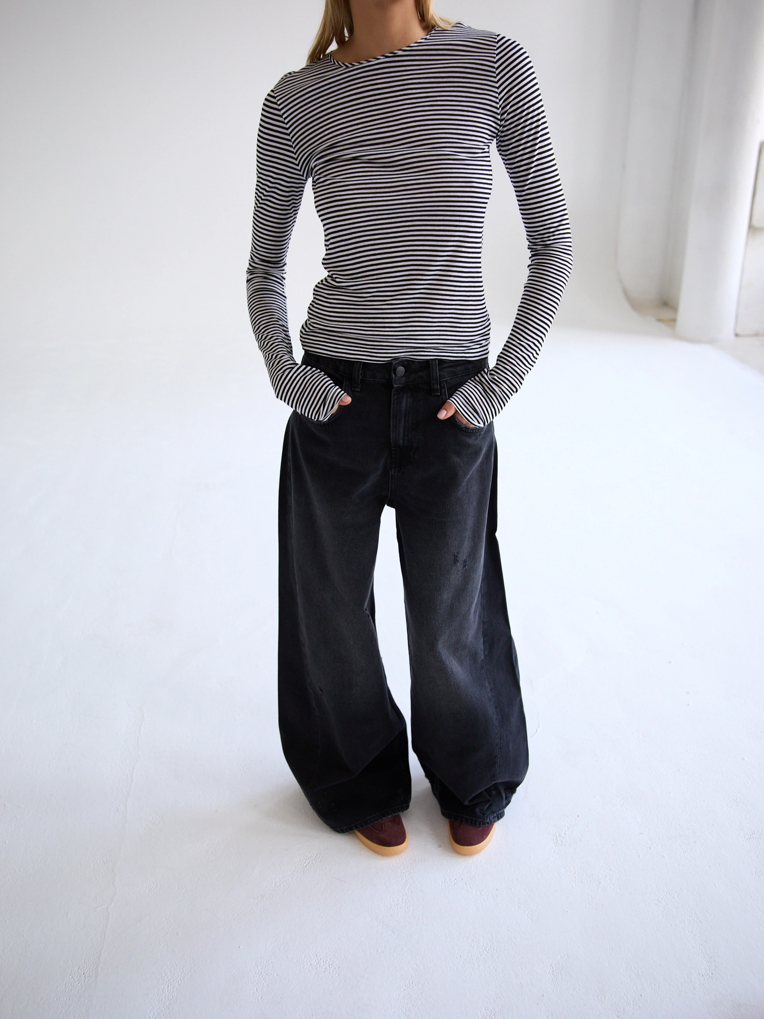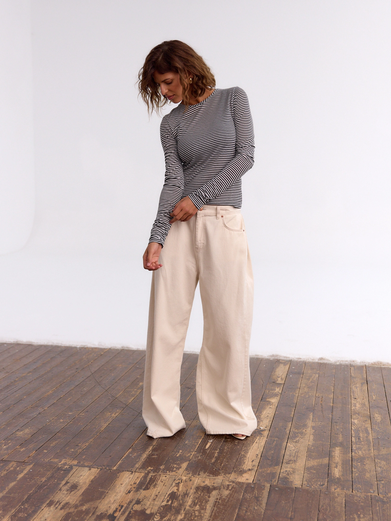 Lekki longsleeve wykonany z miękkiego modalu w delikatnie transparentne paski. Jest prosty, głęboko zabudowany pod szyją i ma charakterystyczne dla nas długie rękawy. Będzie idealną bazą do stworzenia stylizacji codziennych z jeansami czy joggerami, ale sprawdzi się również w tych bardziej eleganckich, pod marynarkę.