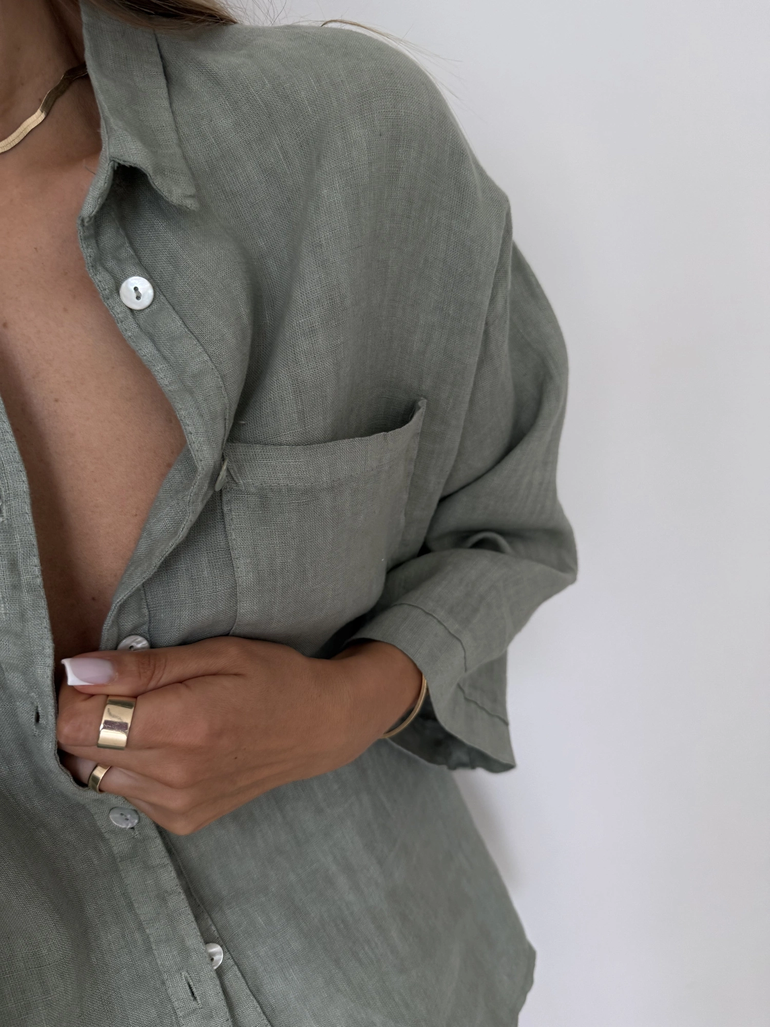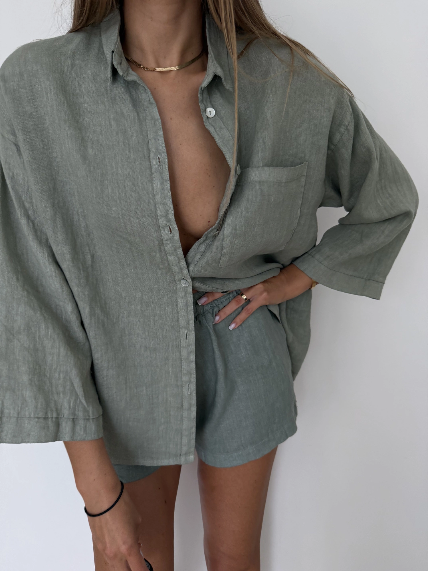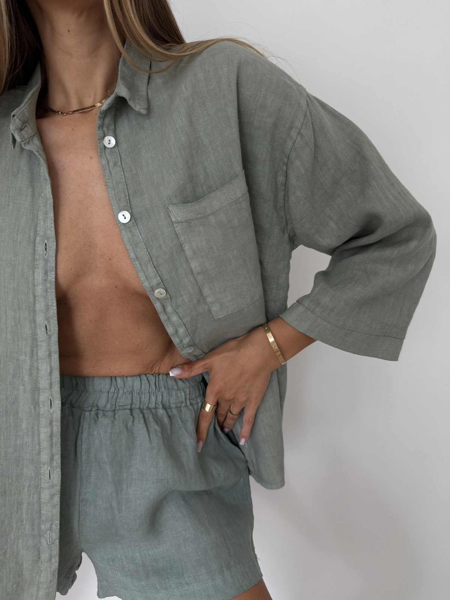 Pssst... Między koszulą, a szortami możliwa jest delikatna różnica w odcieniu - wynika to z naturalnych właściwości lnu i procesu barwienia. Pozostaje jednak niezauważalna w codziennym użytkowaniu.