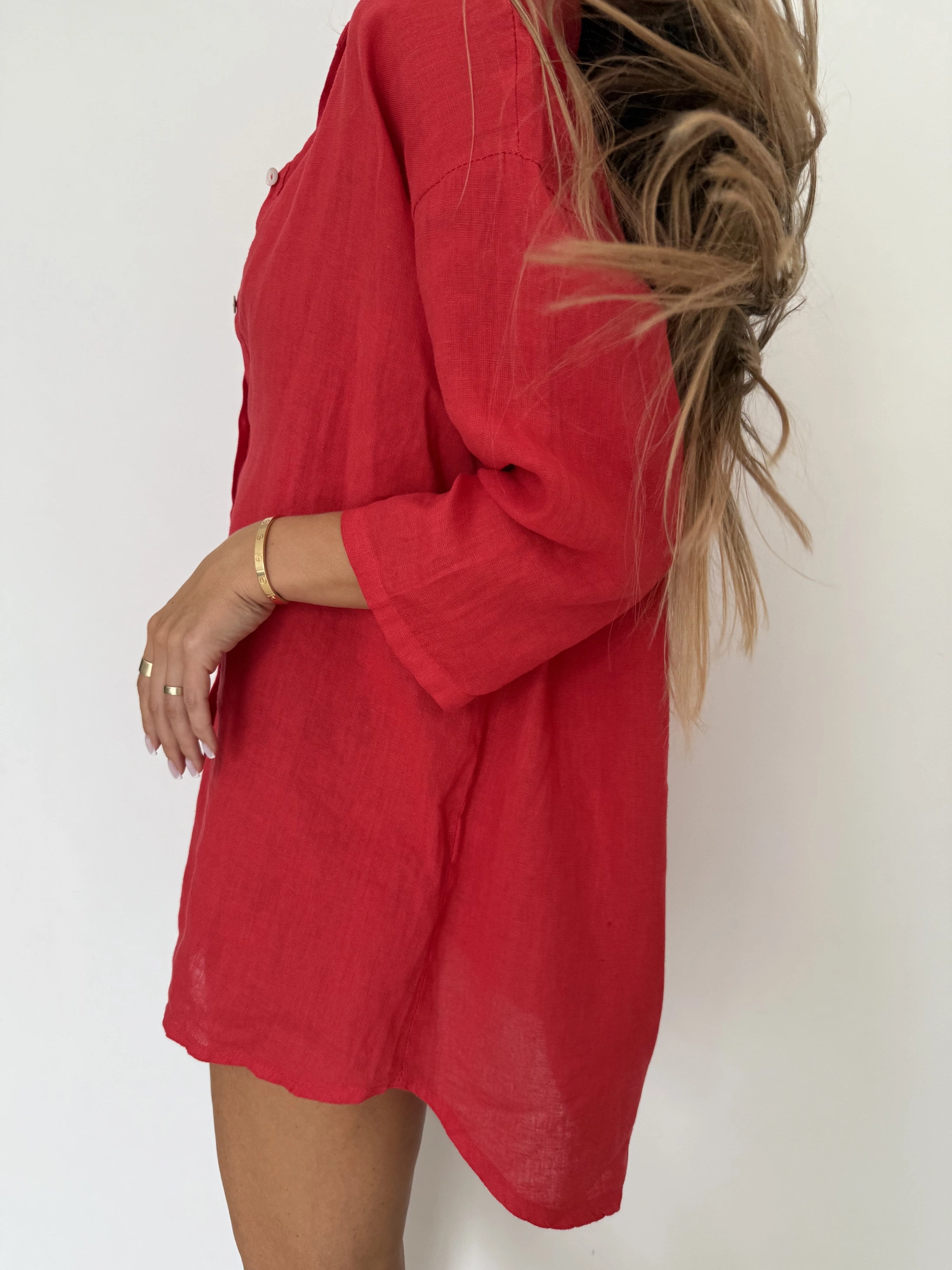 Niezwykle przewiewna, stworzona w 100% z naturalnego lnu, dzięki czemu będzie idealna szczególnie w upalne dni. Jej krój oversize sprawia, że świetnie sprawdzi się zarówno w miejskiej stylówce z szortami jak i w plażowej wersji ze strojem kąpielowym.