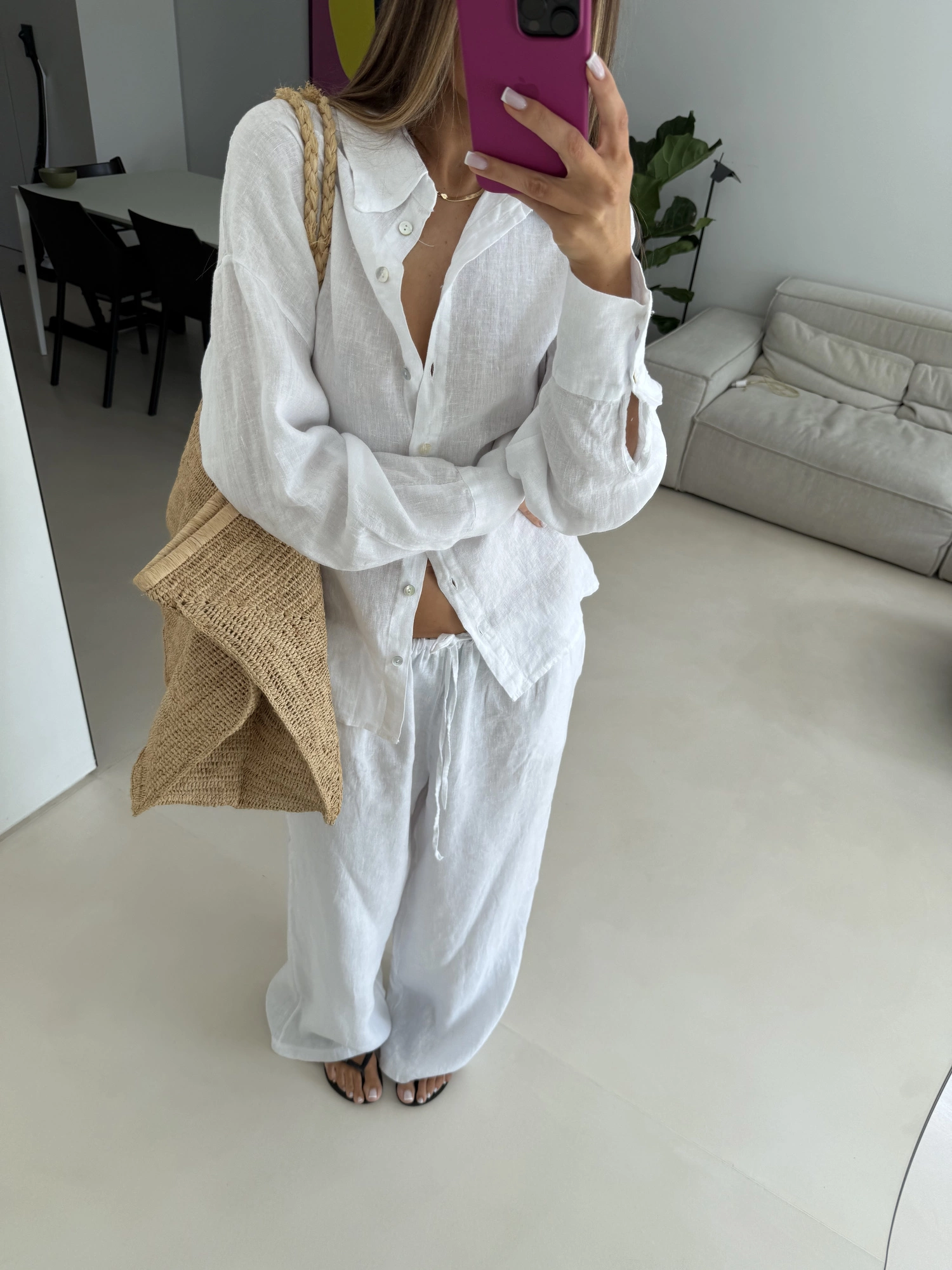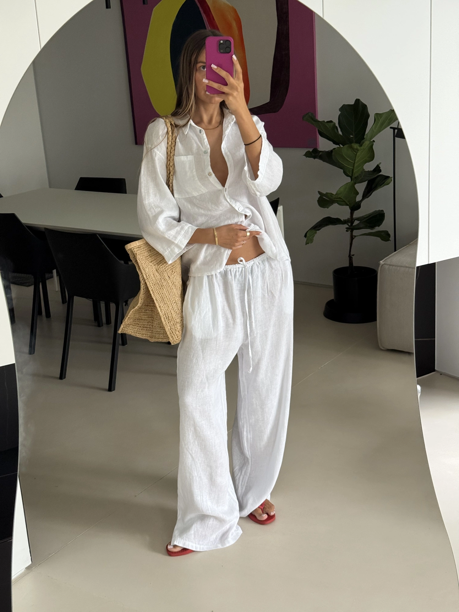 Lniane spodnie z szerokimi i długimi nogawkami. Materiał jest miękki i przewiewny, dlatego sprawdzi się nawet podczas największych upałów. Mają obniżony stan i wygodne wiązanie w pasie, dzięki któremu dostosujesz je do swojej sylwetki. To klasyka o nieco przeskalowanej formie i z charakterystycznym chłopięcym luzem. Wciągnij na bikini i narzuć KOSZULĘ - to must-have w każdej letniej garderobie.
