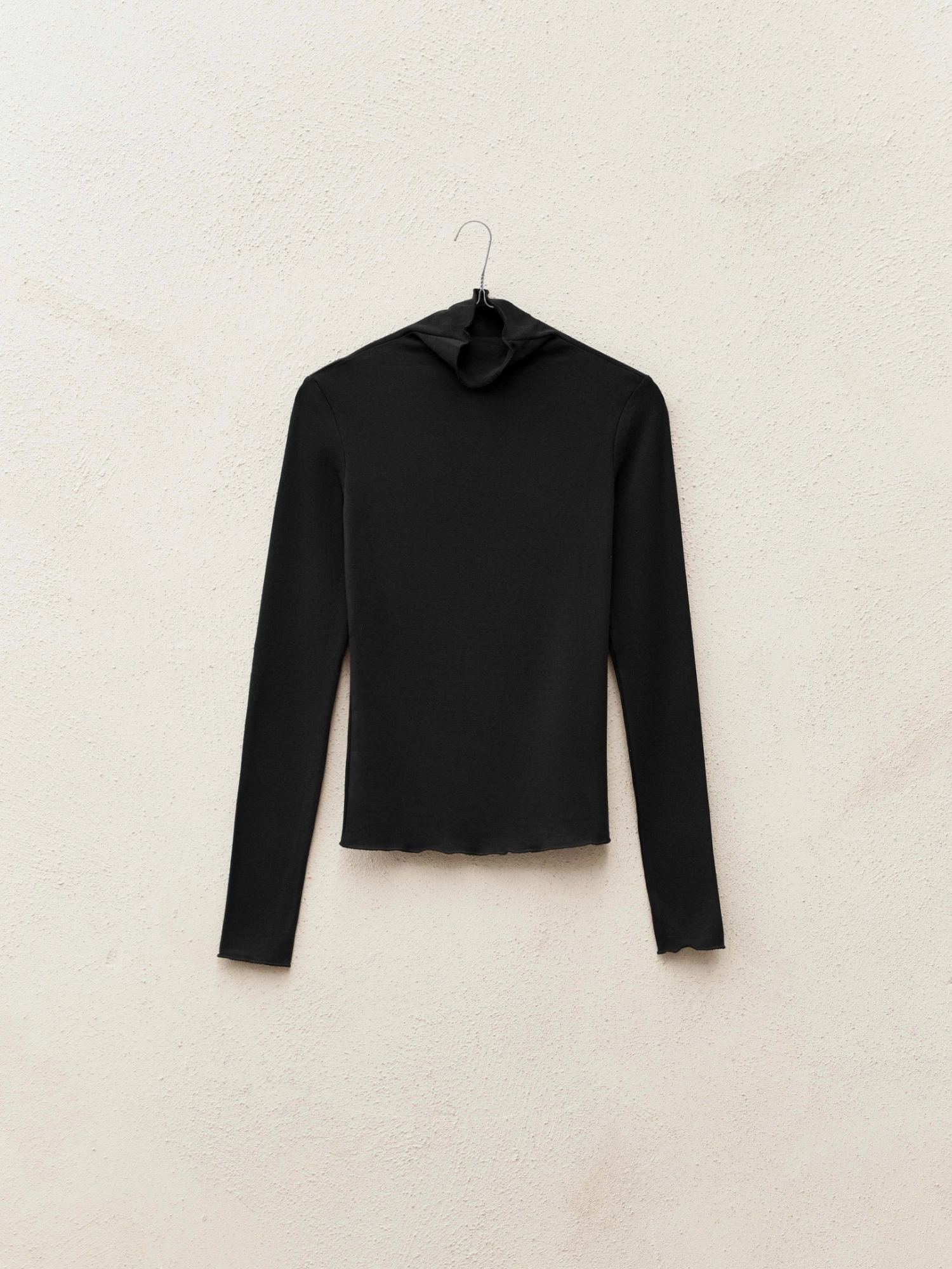 Dopasowany golf wykonany z miękkiej i cienkiej tkaniny z bawełną. Ma prosty krój z charakterystycznym, surowym wykończeniem i wywijaną stójką. Idealnie sprawdzi się jako baza pod marynarkę, kardigan czy sweter. Noś ze spodniami z wysokim stanem, jeansami lub spódnicą i ciesz się ponadczasowym i minimalistycznym lookiem w pracy i na co dzień.