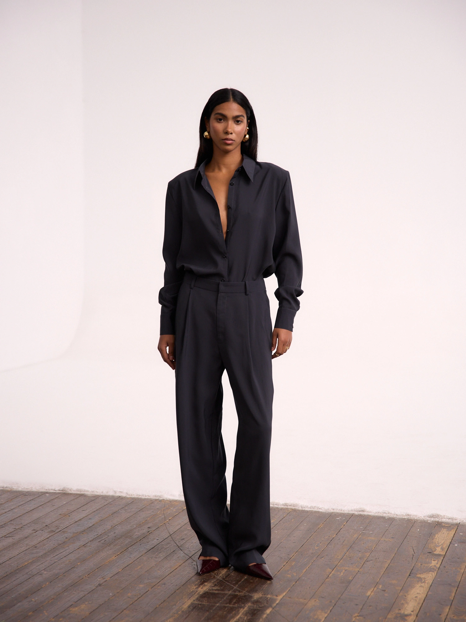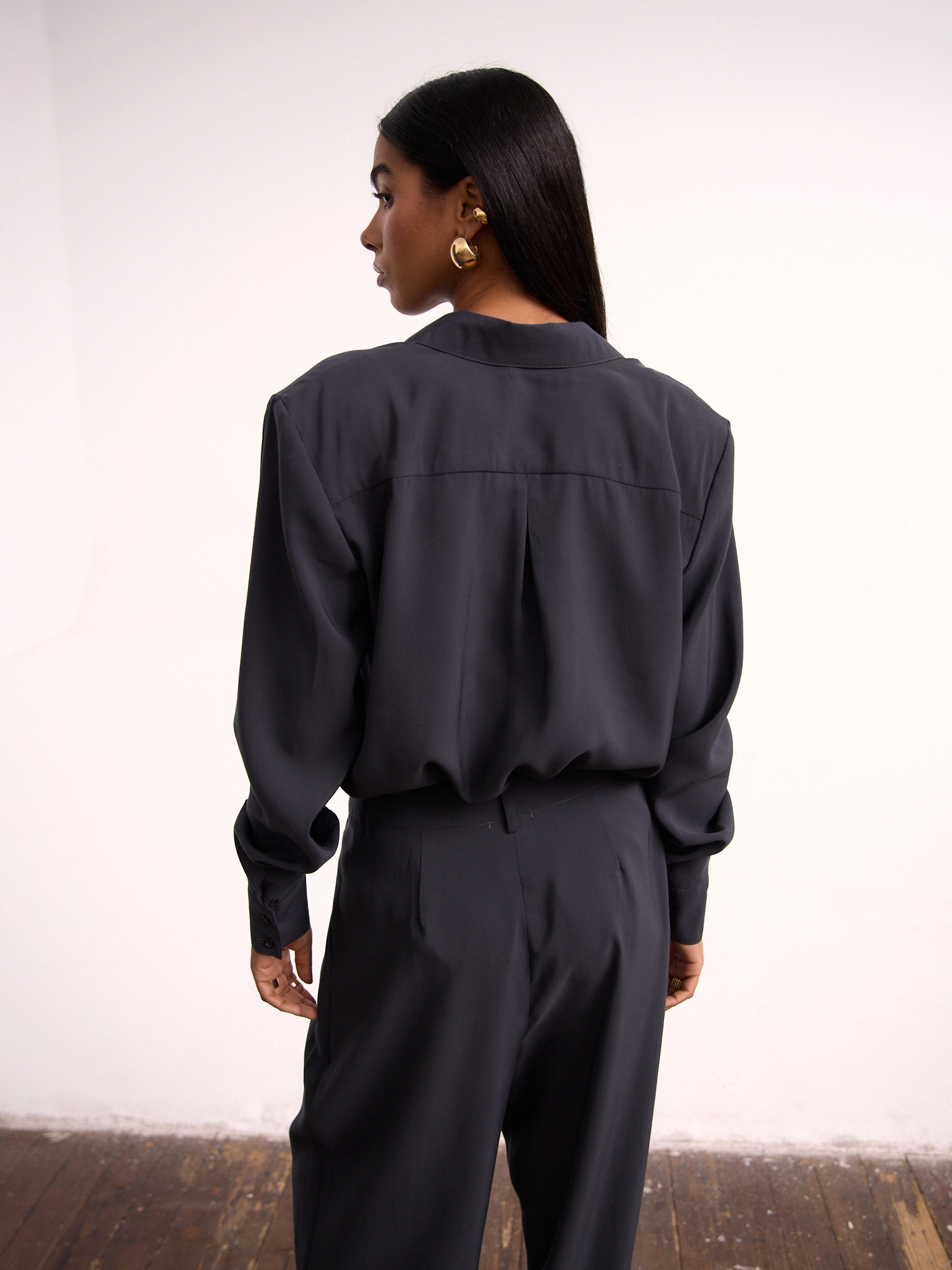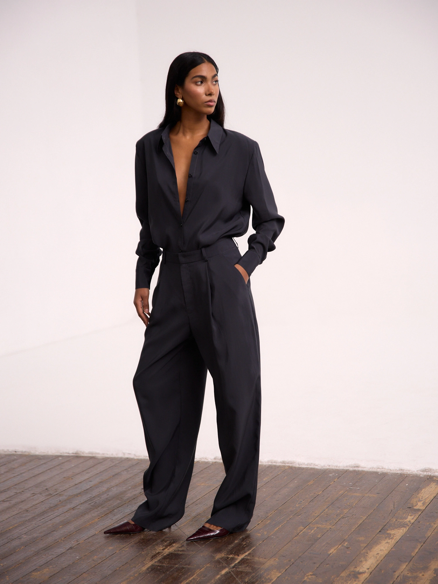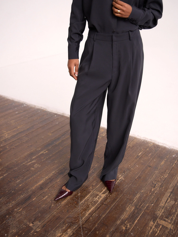 Klasyczne spodnie z obniżonym stanem i zakładkami wykonane z miękkiego modalu w pięknym, stalowym odcieniu. Stylizowane na męskie, z zakładkami, które przełamują ich sportowy charakter i z długimi, delikatnie zwężanymi nogawkami. Te spodnie są doskonałe zarówno na codzienne, jak i bardziej formalne okazje. To propozycja, która będzie bazą do stworzenia zarówno sportowych, jak i eleganckich stylizacji. Noś z dedykowaną KOSZULĄ, ciepłym swetrem lub bluzą w wersji codziennej. Mają dwie poręczne kieszenie i są zapinane na zamek.