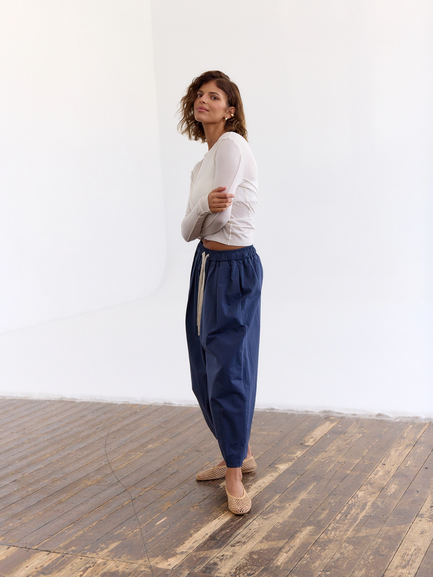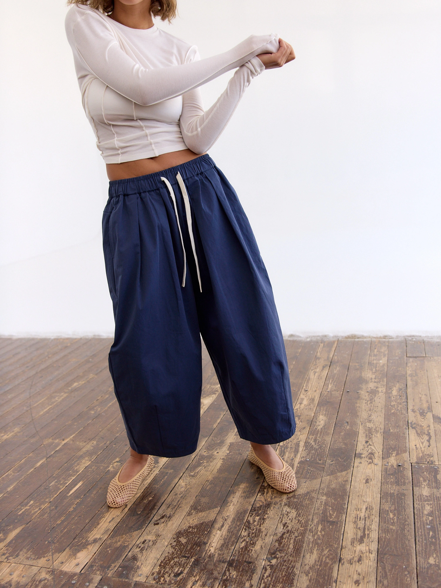Spodnie utrzymane w najmodniejszym w tym sezonie fasonie balloon z szerokimi, imitującymi spódnicę nogawkami. Wykonane z miękkiej i oddychającej bawełny o mięsistej strukturze, dzięki czemu super się układają, a całość zyskuje na unikalnej objętości. Ich luźny fason czyni je komfortową i wyróżniającą się propozycją do codziennych stylizacji. Mają głębokie kieszenie, obniżony krok, zakładki na przodzie oraz elastyczną gumę w pasie z wiązaniem, dzięki któremu możesz nosić je wyżej lub nisko na biodrach. Sprawdzą się zarówno w połączeniu z wygodnymi sneakersami, czy stylowymi baletkami. Dostępne w dwóch uniwersalnych kolorach – klasycznym granacie i subtelnym beżu.