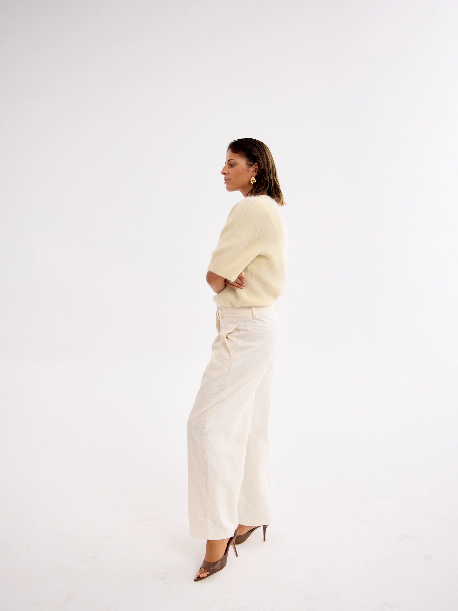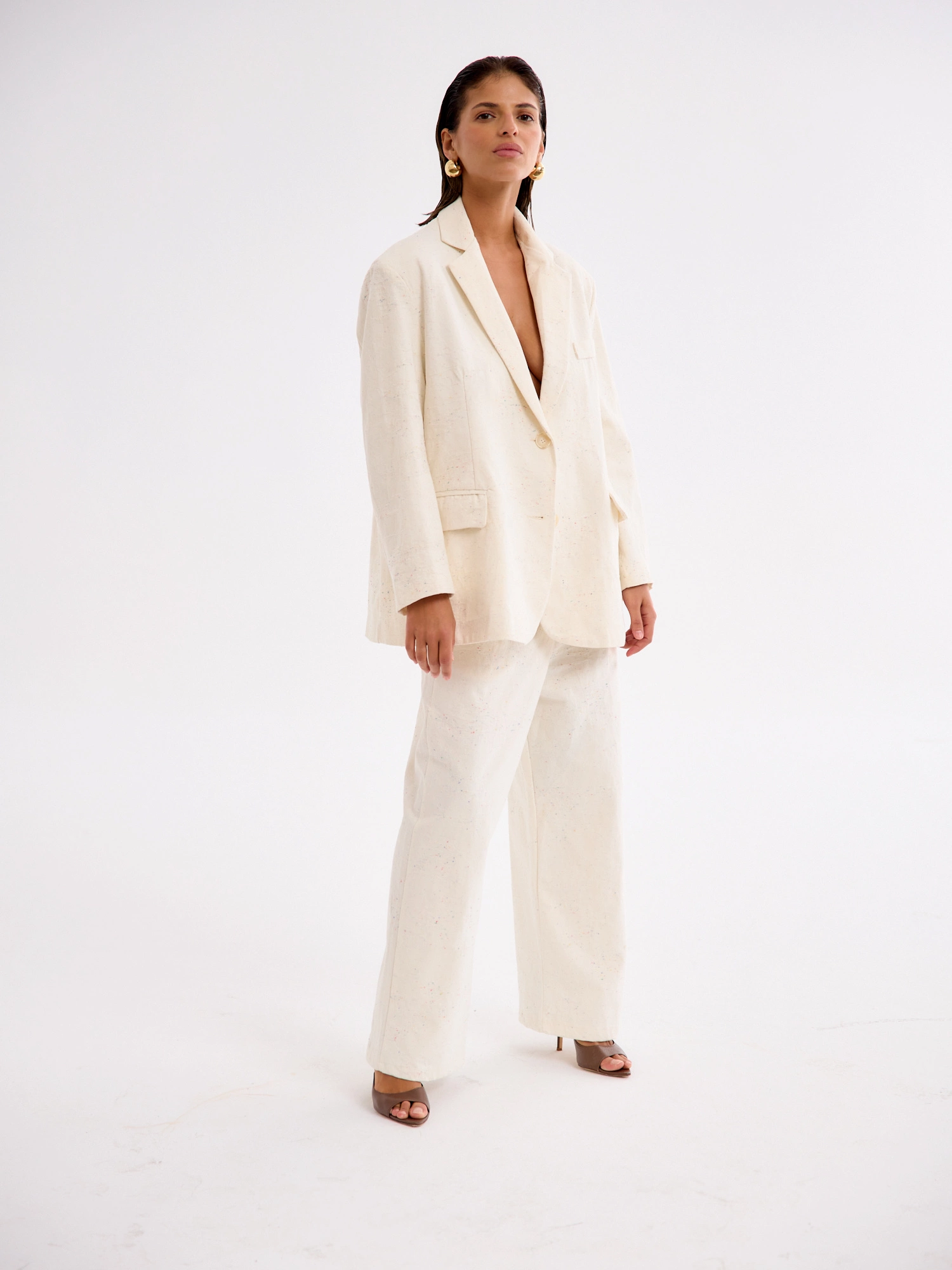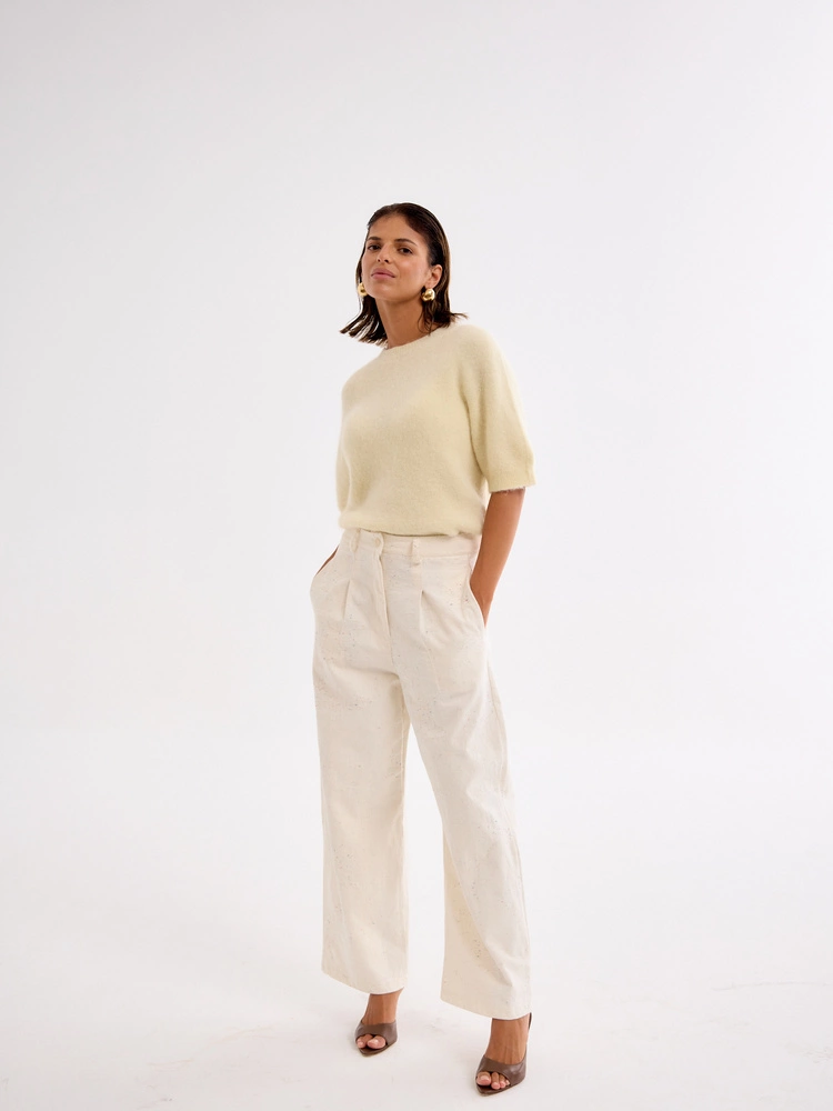Spodnie z wysokim stanem wykonane z bawełny o charakterystycznej fakturze z kolorowymi elementami. Mają proste, szersze nogawki do kostek, na przodzie dwie zakładki, na tyle kieszeń. Są częścią garnituru i w połączeniu z MARYNARKĄ tworzą fantastyczny wiosenno-letni set, który sprawdzi się zarówno w wersji codziennej, do pracy jak i podczas ważniejszych, świątecznych wyjść. Noś w zestawie lub miksuj z basicowym T-shirtem, ulubionym swetrem lub jeansem - z pewnością będą świeżym i multi-zadaniowym dodatkiem do Twojej garderoby.