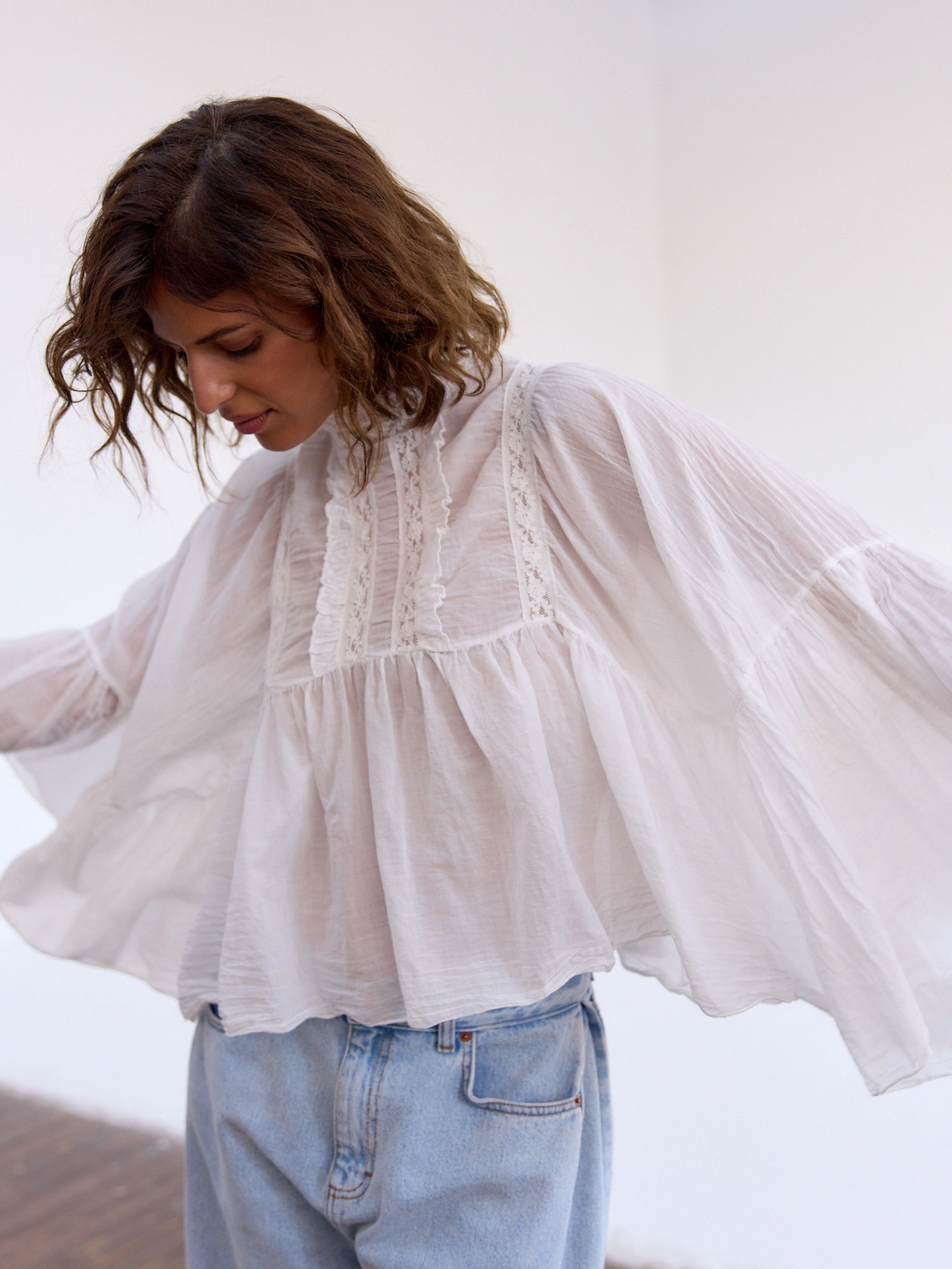Bawełniana koszula utrzymana w stylu boho. Ma wyjątkowy fason nietoperza z szerokimi rękawami, charakterystyczną stójką i ozdobnym, koronkowym wykończeniem. Materiał jest cienki i oddychający, dlatego będzie niezwykle zwiewną i romantyczną opcją na wiosnę, a nawet lato. Połącz z jeansami lub denimowymi szortami i dodaj do swojej garderoby odrobinę zmysłowej nonszalancji.