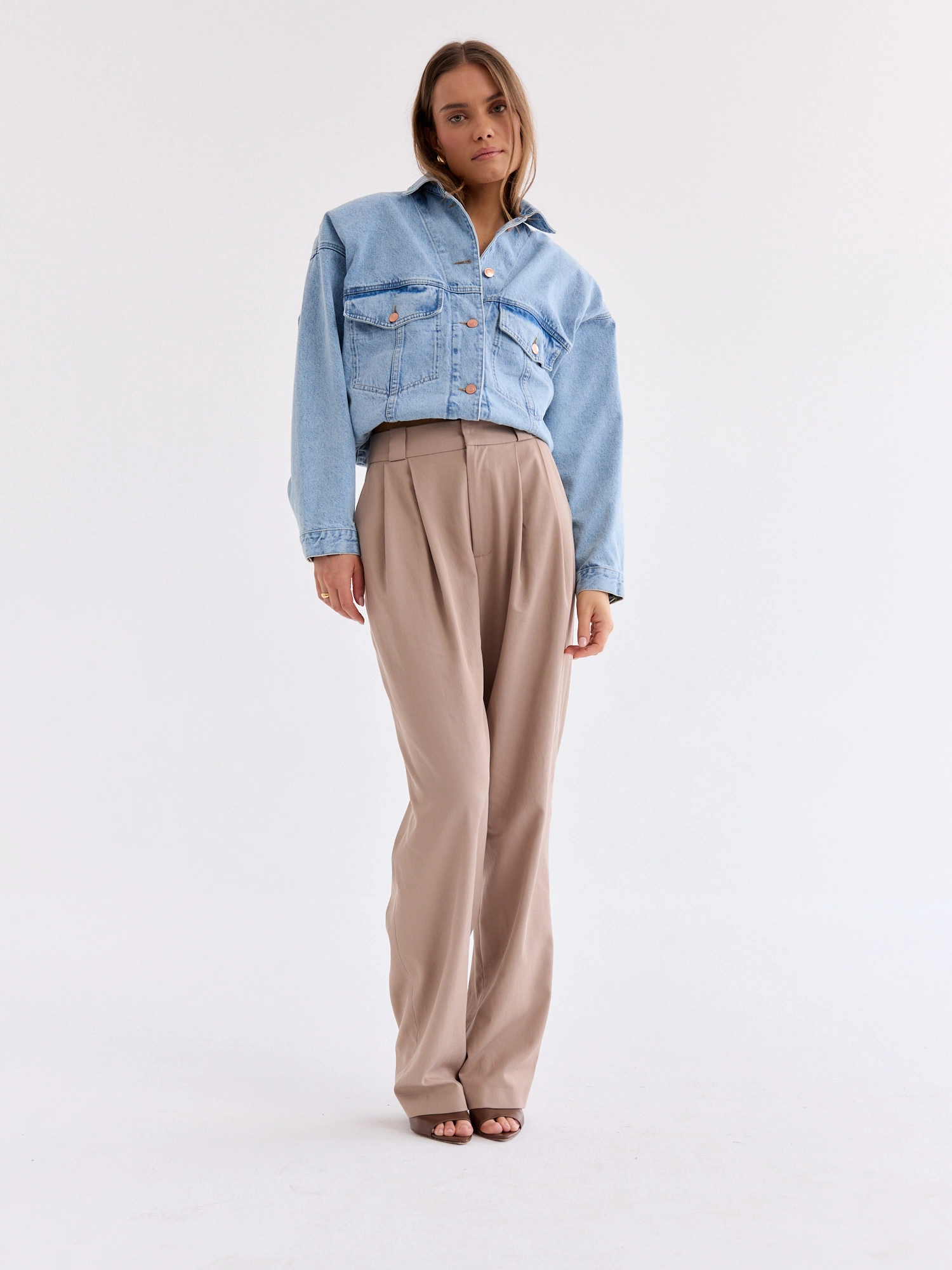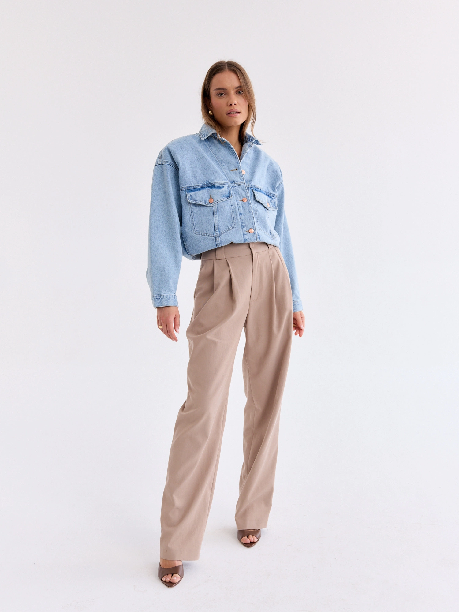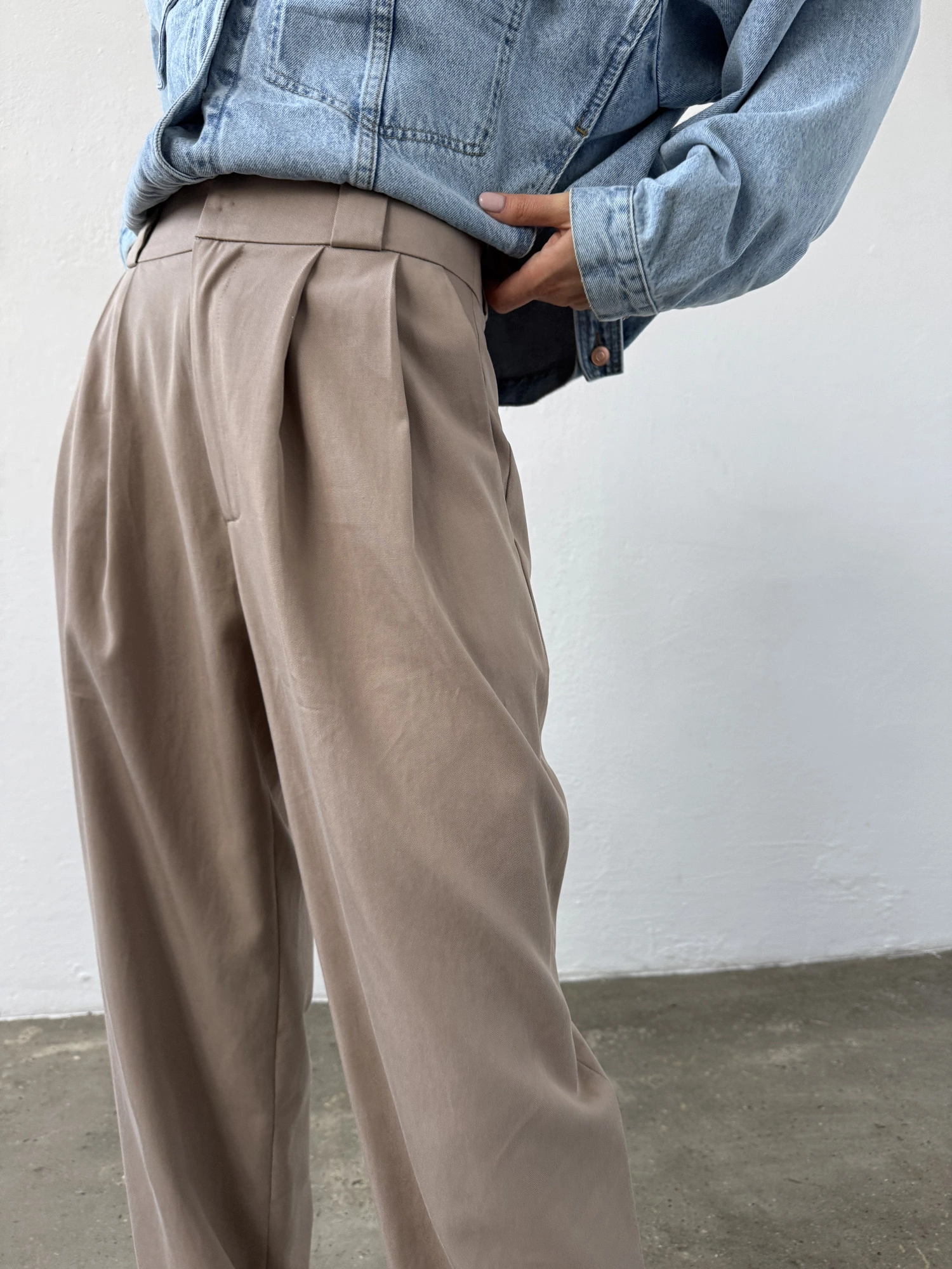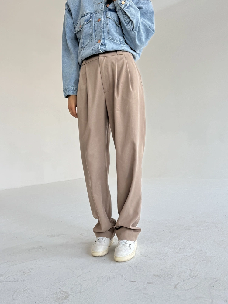 Klasyczne spodnie z podwyższonym stanem i zakładkami na przodzie, wykonane z miękkiej mieszanki bawełny i tencelu. Inspirowane męskim stylem, mają długie, proste nogawki. Idealnie sprawdzą się zarówno na co dzień, jak i podczas bardziej formalnych okazji, stanowiąc bazę do różnorodnych stylizacji – od sportowych po eleganckie. Świetnie komponują się z elegancką koszulą, ciepłym swetrem czy bluzą na luzie. Wyposażone w dwie praktyczne kieszenie i zapięcie na zamek.