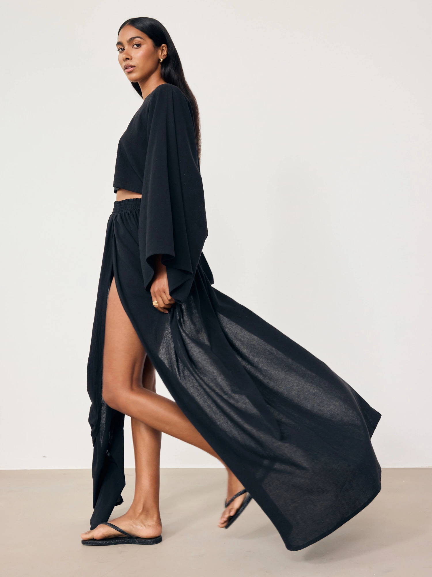 Długa spódnica z wysokim stanem wykonana z lekkiej, przewiewnej bawełny o delikatnej strukturze. Ma elastyczną talię, która dopasowuje się do sylwetki, oraz dwa efektowne, wysokie rozcięcia z przodu, eksponujące nogi i nadające sylwetce lekkości. Jej zwiewny krój pięknie pracuje w ruchu, a naturalny materiał sprawia, że świetnie sprawdza się nawet w największe upały. W duecie z krótkim topem tworzy zmysłowy, swobodny look idealny na plażę.