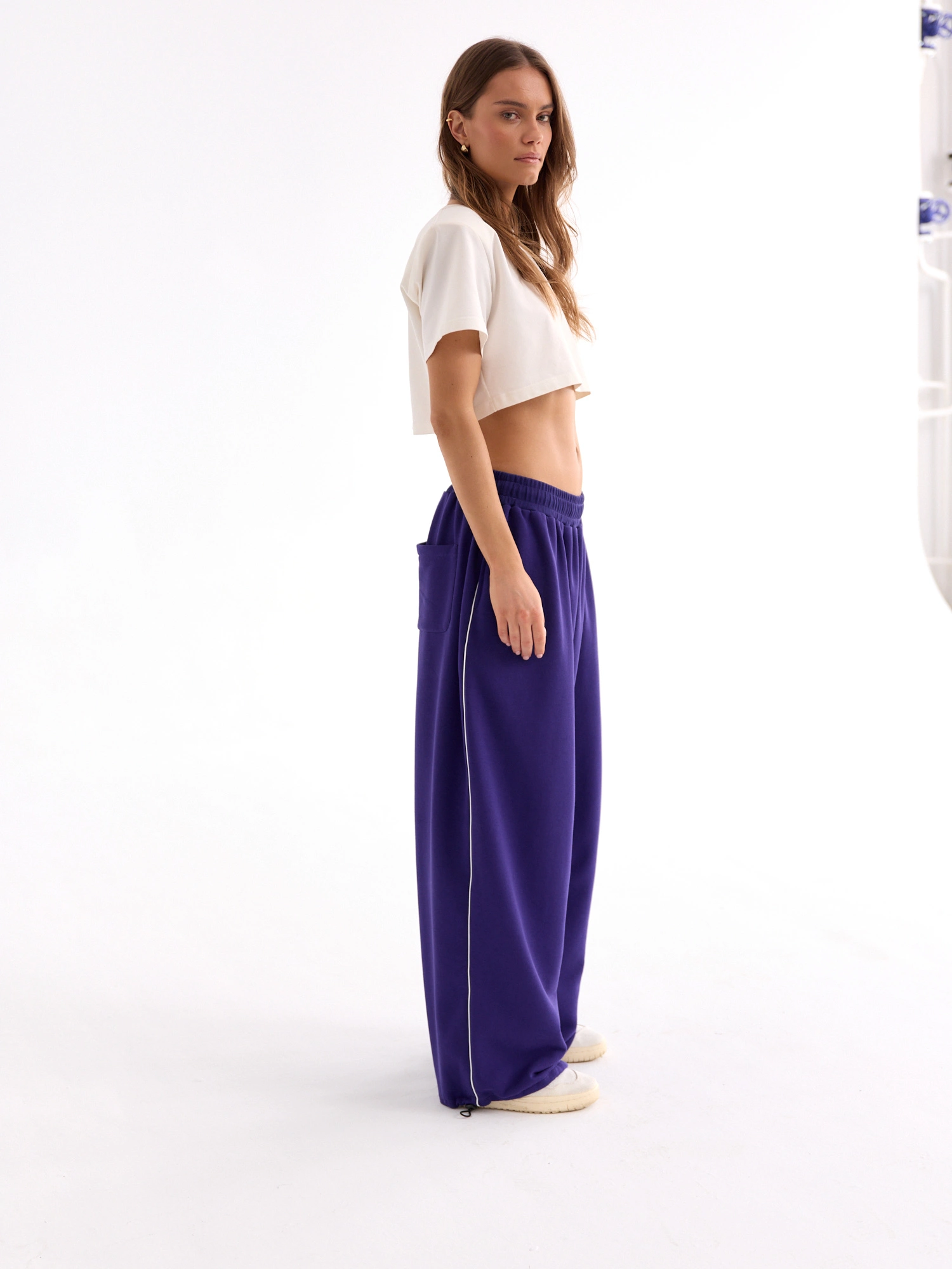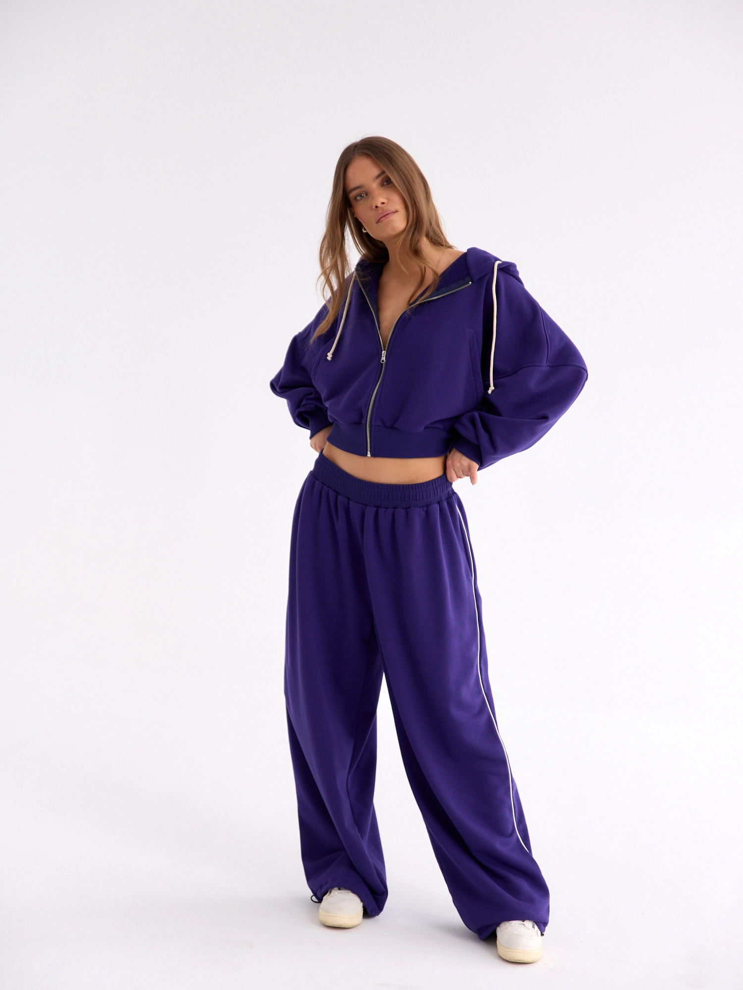 Szerokie spodnie dresowe wykonane z ultra miękkiej bawełny, wewnątrz wykończone pętelką. W pasie wygodna guma z dodatkowym wiązaniem, dzięki czemu możesz nosić je tak jak lubisz najbardziej - wyżej lub nisko na biodrach. Szerokie, wygodne nogawki, na dole z wąską gumką do ściągnięcia i ozdobnym lampasem po bokach. Łącząc z pudełkową bluzą na zamek lub z krótkim topem PADDED i skórzaną kurtką, stworzysz zestaw idealny na rozpoczęcie nowego sezonu.