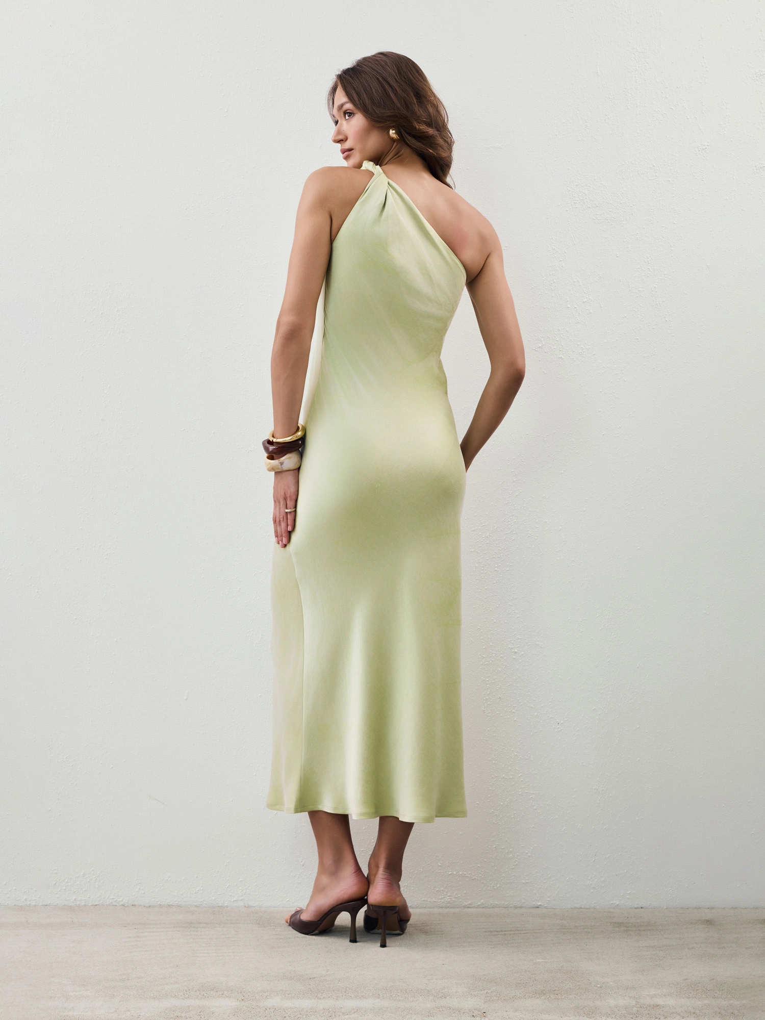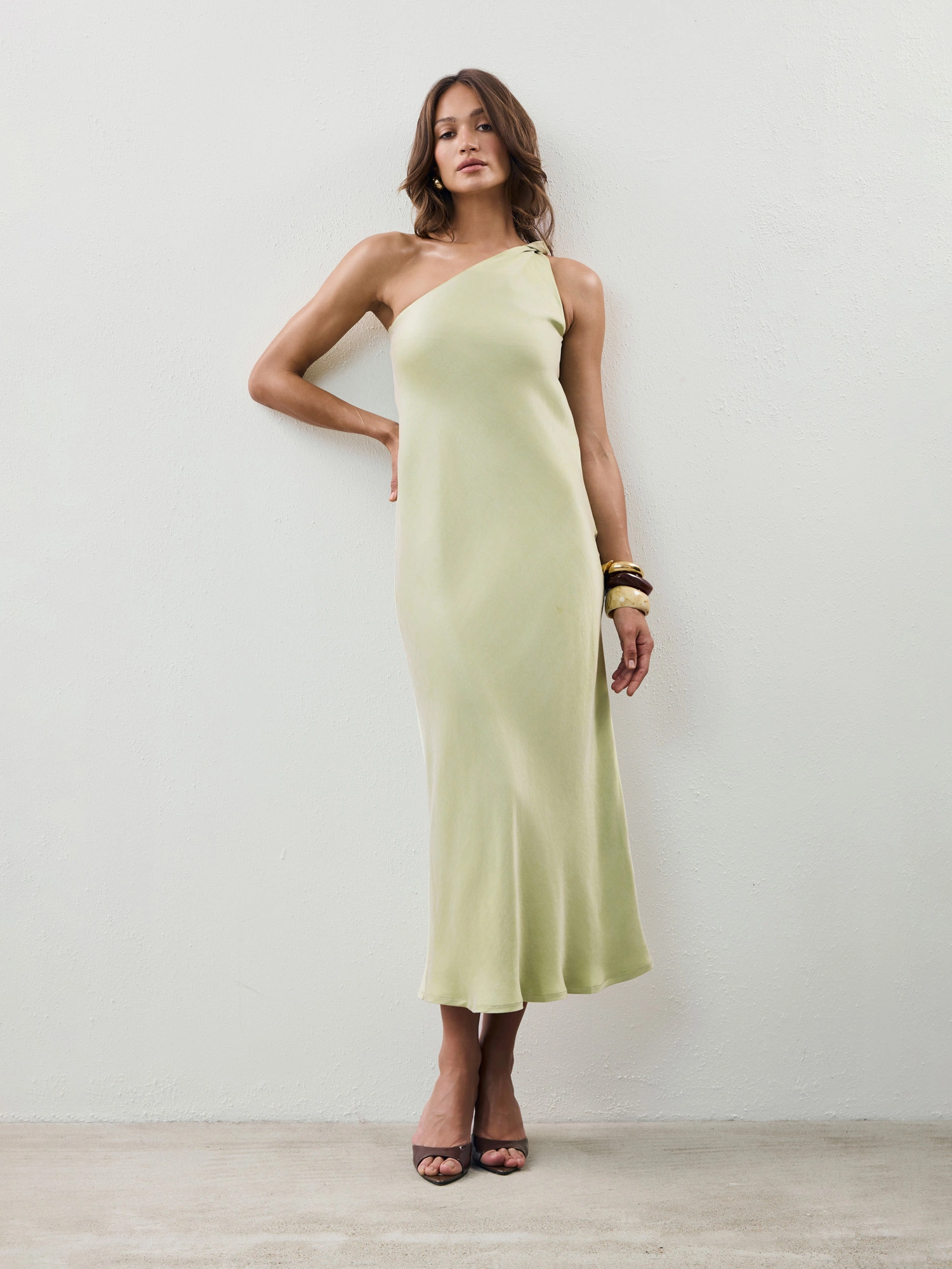 Bankietowa sukienka maxi. Wykonana z miękkiej i lejącej mieszanki wiskozy i lyocelu o delikatnym, atłasowym połysku. Jest dopasowana z lekko rozkloszowanym dołem. Jej największym atutem jest jednak asymetryczna góra i skręcone ramiączko, które pięknie eksponuje ramię i podkreśla linię biustu. To niezwykle elegancka propozycja, która z pewnością idealnie sprawdzi się podczas najważniejszych i wielkich wyjść.