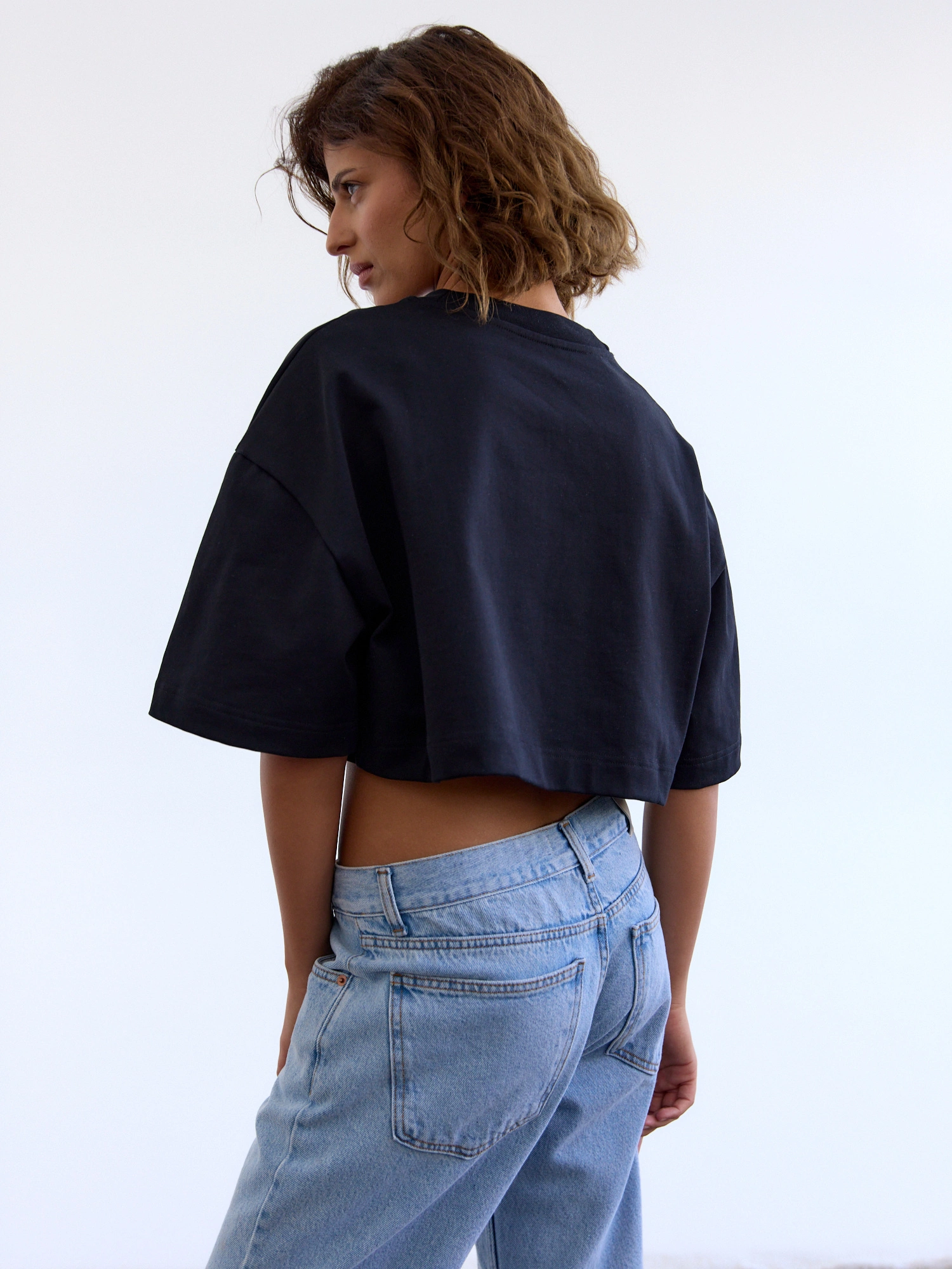 Crop top wykonany z grubszej i mięsistej bawełny. Materiał świetnie się układa, a w połączeniu z krótszym fasonem i charakterystycznie wydłużonymi rękawami tworzy nowoczesny i unikatowy look. Idealny do stylizacji z jeansami z wysokim stanem, szortami lub spodniami dresowymi. To doskonały balans między wygodą a wyrazistym stylem i z pewnością wykorzystasz go na wiele sposobów.