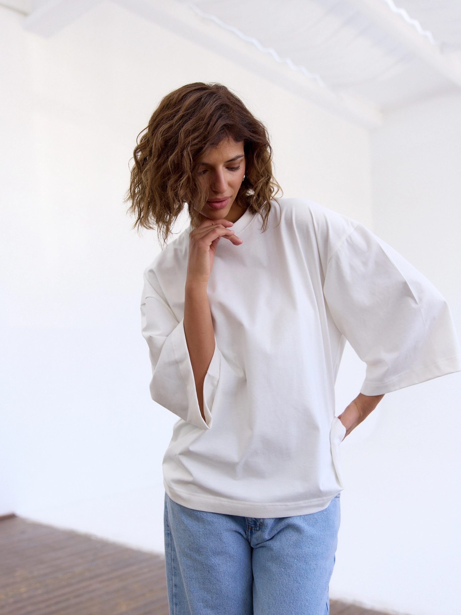 T-shirt o luźnym fason z charakterystycznie wydłużonymi i szerszymi rękawami wykonany z miękkiej i delikatnej dla skóry bawełny. To idealny basic, który sprawdzi się jako baza zarówno do stylizacji codziennych jak i sportowych. Połącz z jeansami, szortami, eleganckimi spodniami z materiału czy joggerami i ciesz się komfortem w najlepszym stylu.