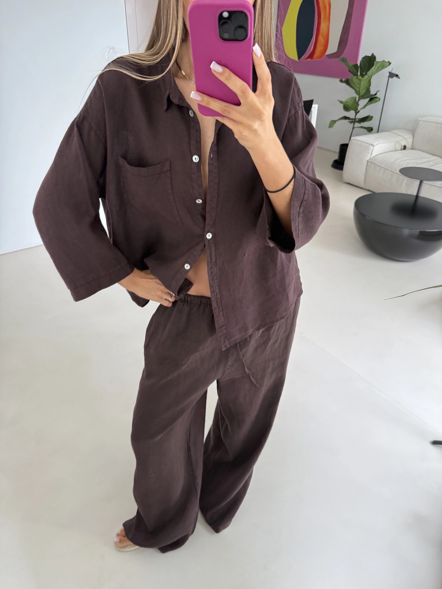 Pssst... Między koszulą, a spodniami możliwa jest delikatna różnica w odcieniu - wynika to z naturalnych właściwości lnu i procesu barwienia. Pozostaje jednak niezauważalna w codziennym użytkowaniu.