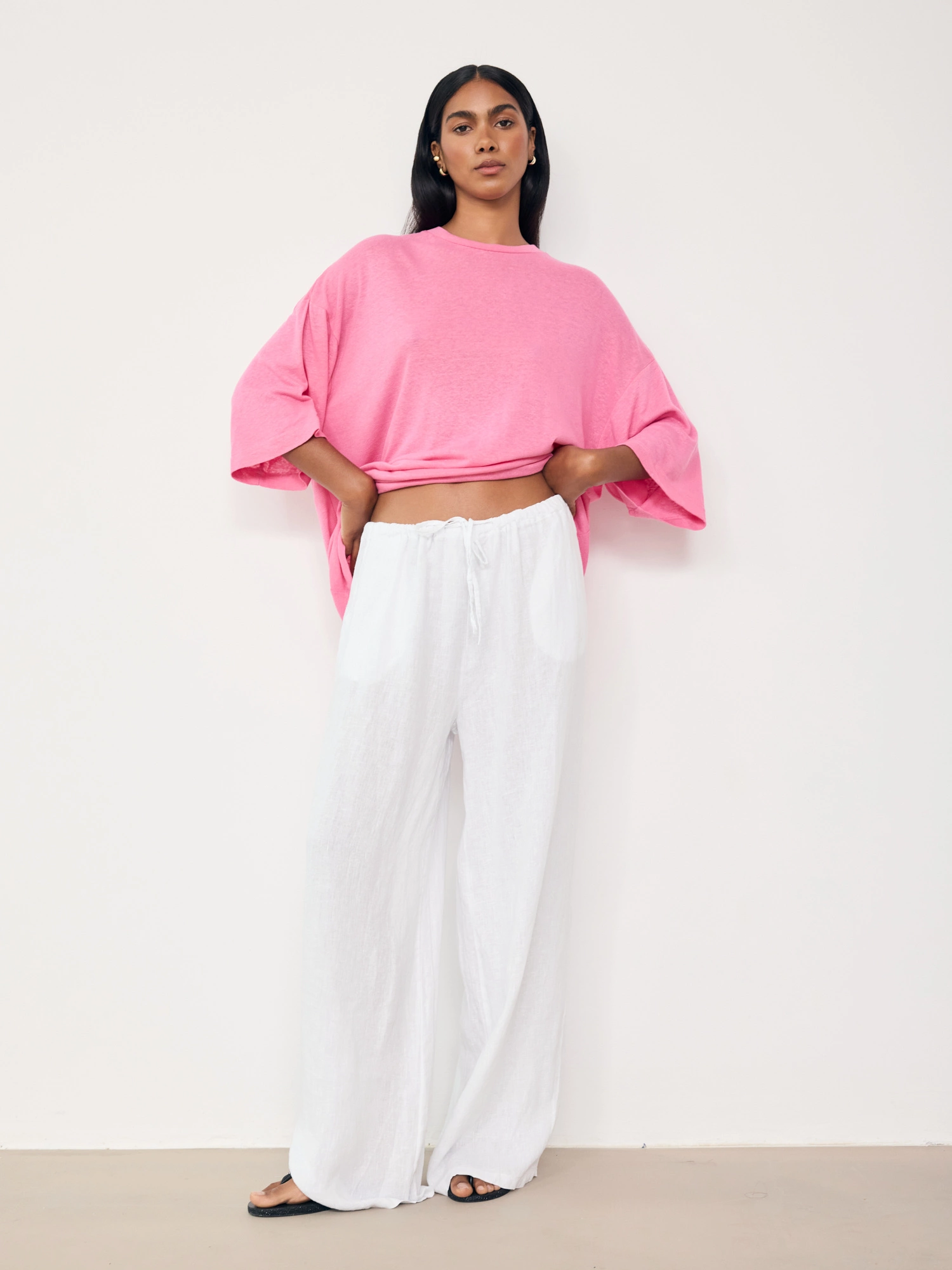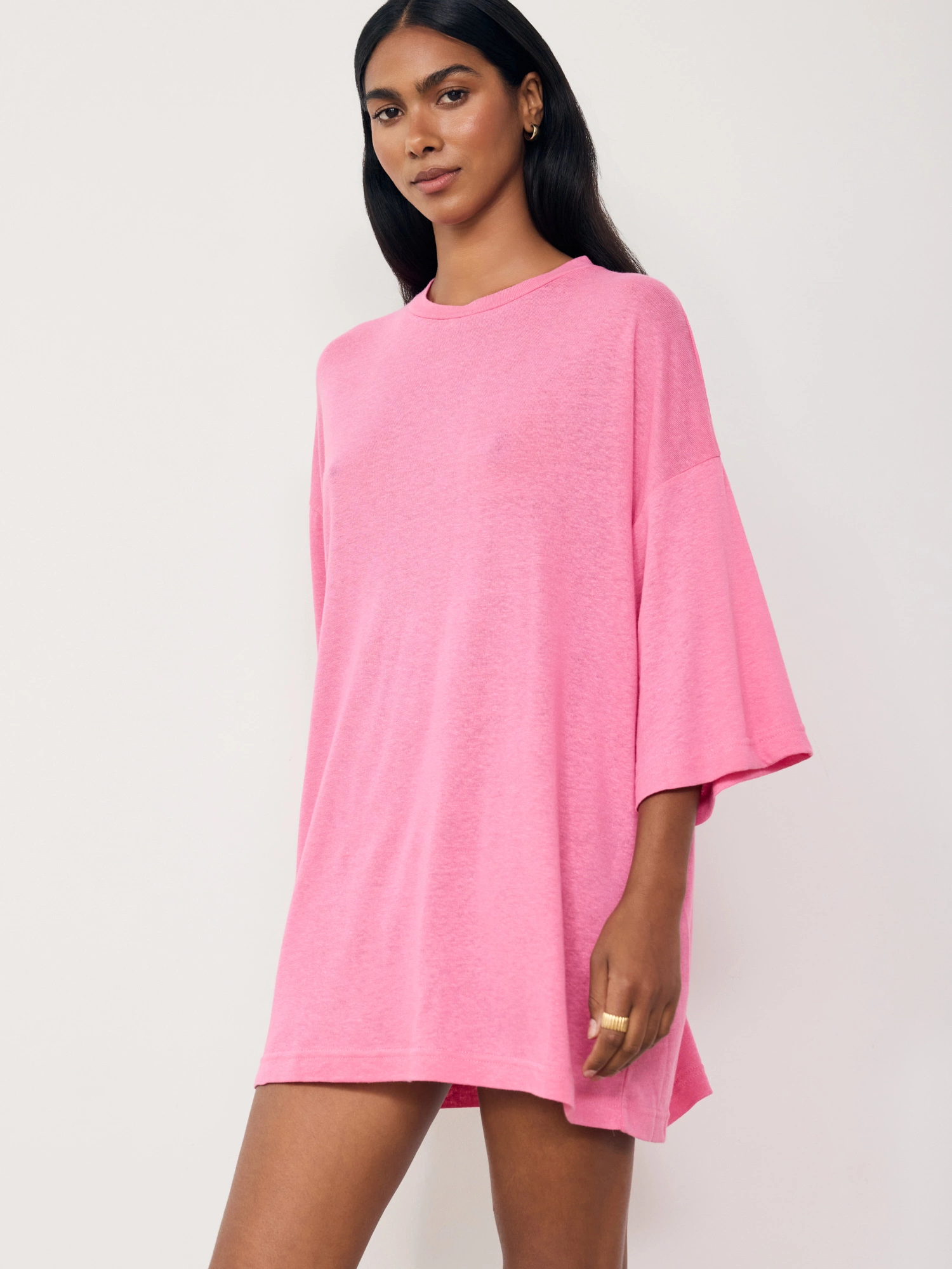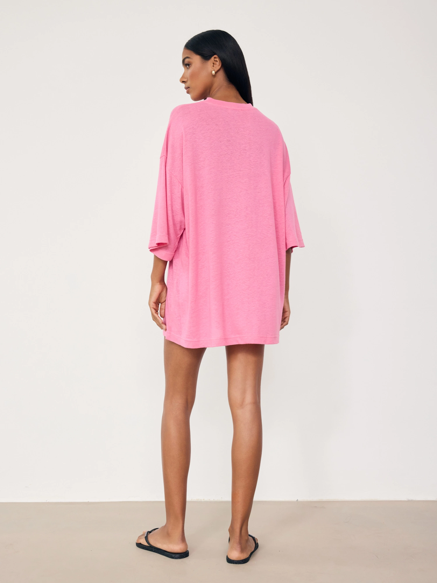 Obszerny, oversizowy T-shirt z wydłużonymi rękawami. Wykonany z wyjątkowego blendu lnu i wiskozy o charakterystycznej, imitującej dzianinę strukturze - miękkiej, przewiewnej i przyjemnej w noszeniu. Jest długi, dlatego z łatwością możesz nosić go jako tunikę do szortów, zestawić z naszymi lnianymi spodniami lub wciągnąć na strój i lecieć na plażę!