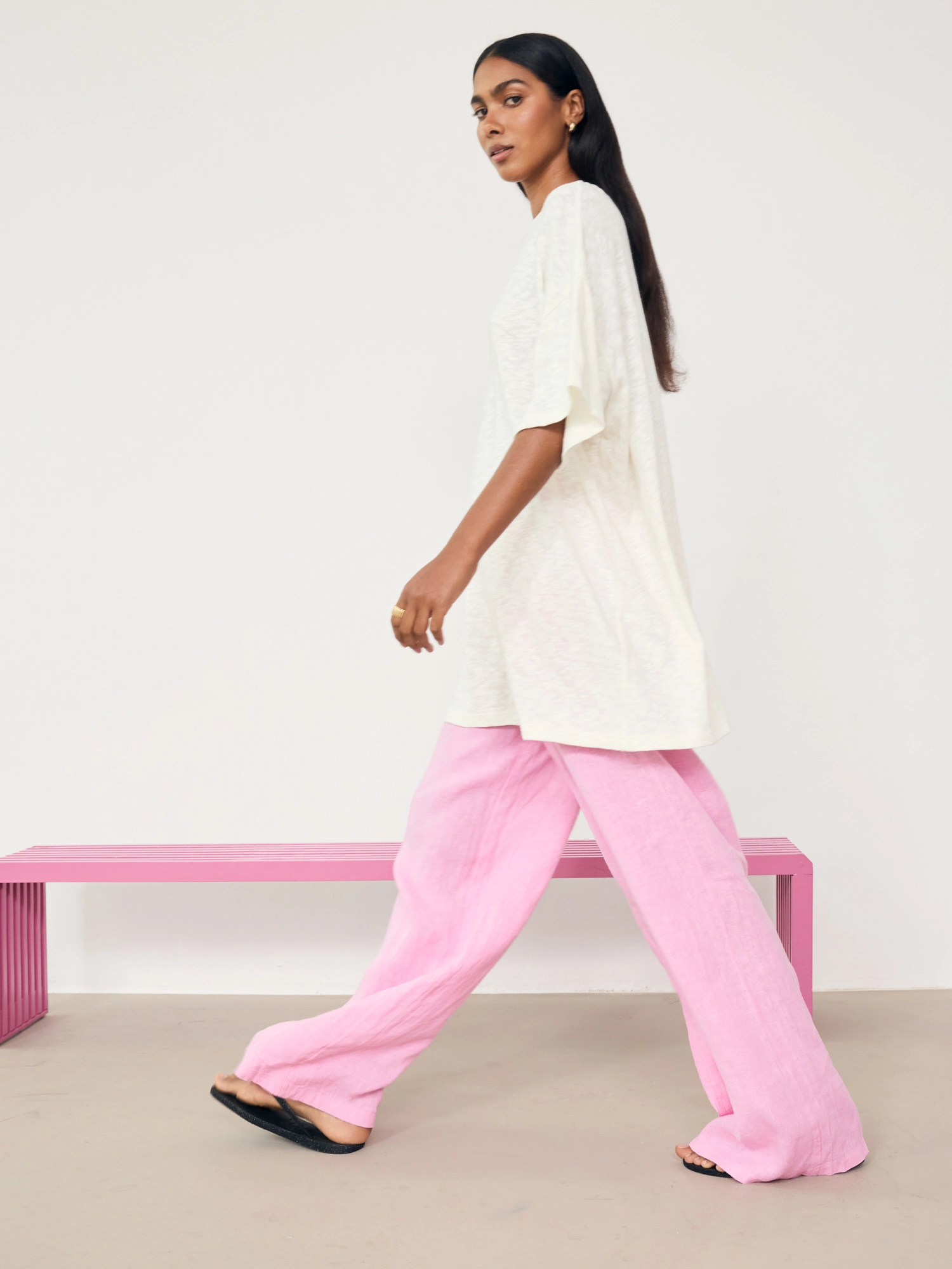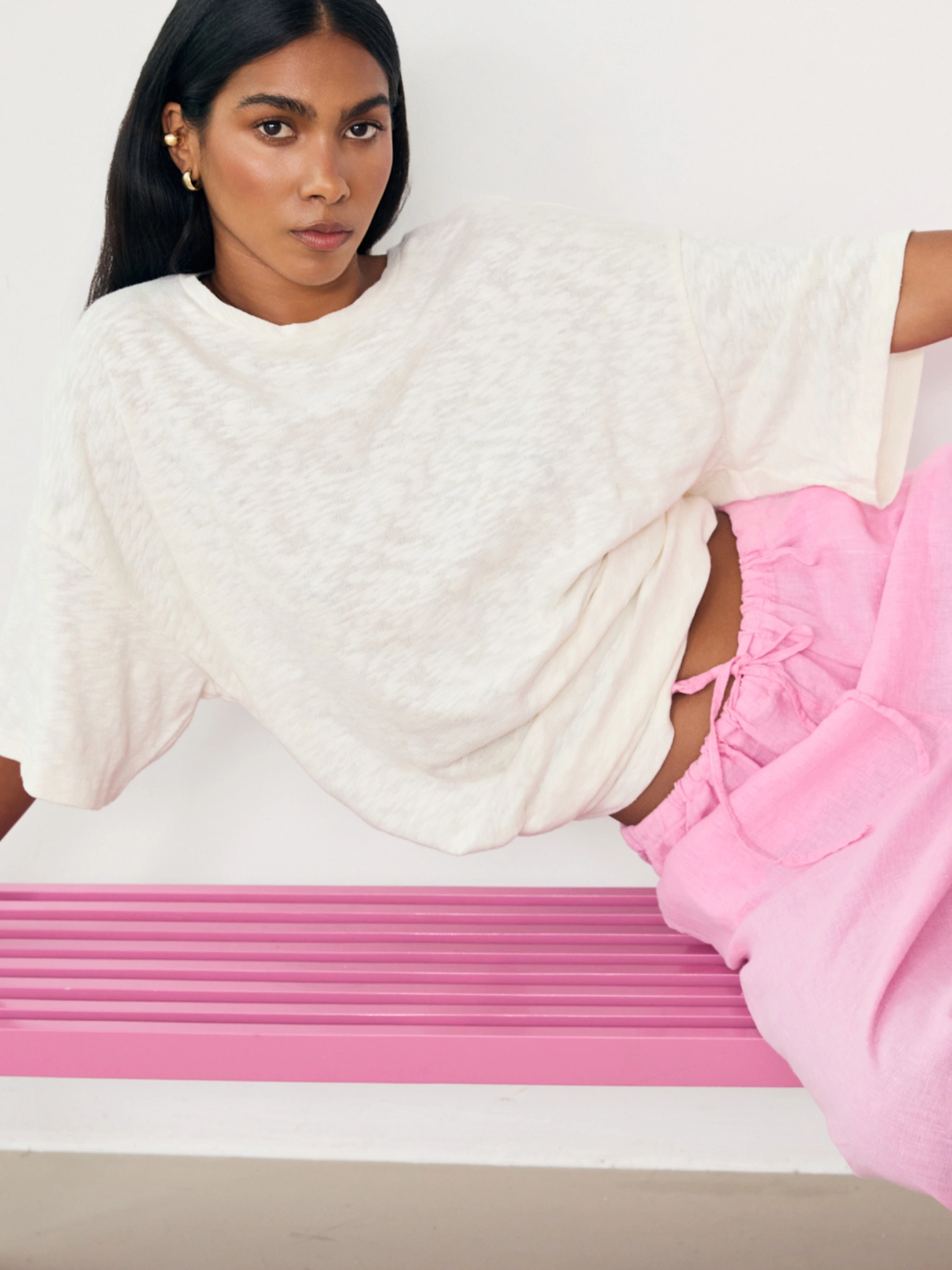 Obszerny, oversizowy T-shirt z wydłużonymi rękawami. Wykonany z wyjątkowego materiału o charakterystycznej, imitującej dzianinę strukturze - miękkiej, przewiewnej i przyjemnej w noszeniu. Jest długi, dlatego z łatwością możesz nosić go jako tunikę do szortów, zestawić z naszymi lnianymi spodniami lub wciągnąć na strój i lecieć na plażę!