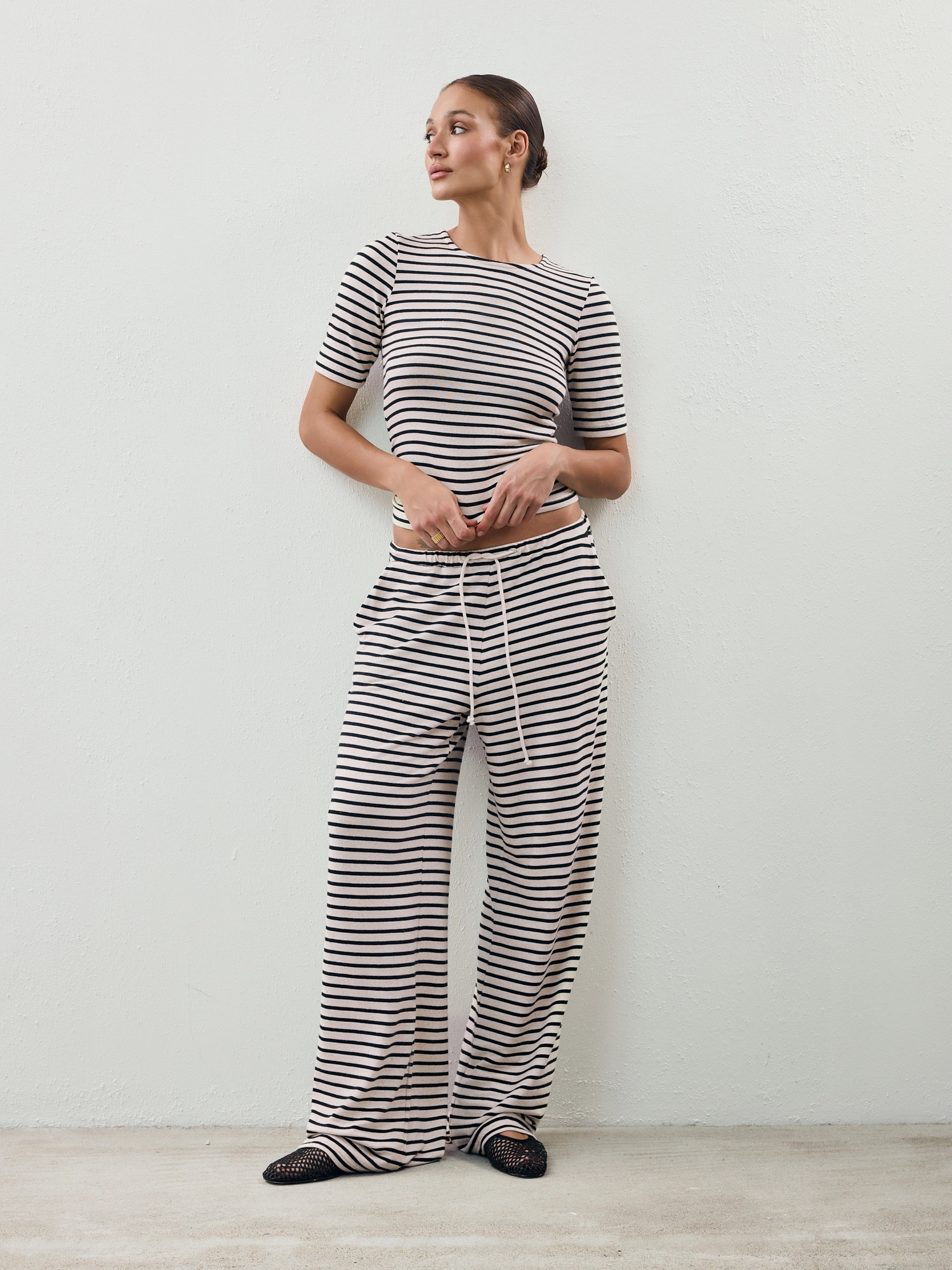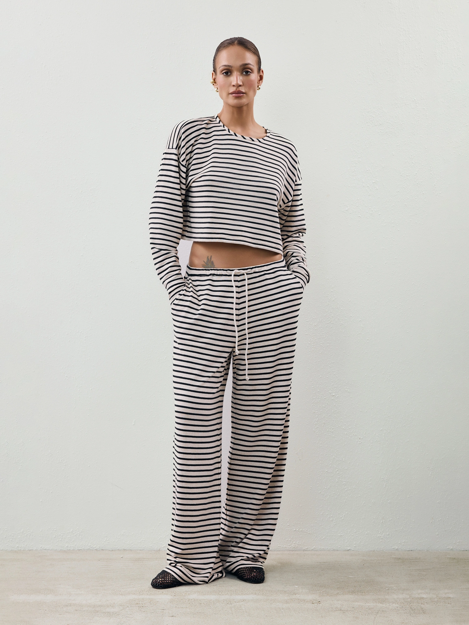 Spodnie wykonany z przyjemnej dla skóry mieszanki wiskozy, bawełny i lnu o charakterystycznej strukturze lekkiego sweterka. Materiał jest miękki, dzięki czemu idealnie dopasowuje się do sylwetki i przyjemnie ją otula. Mają długie szerokie nogawki, obniżony stan i wygodne wiązanie w pasie, a w połączeniu z longsleevem lub T-shirtem tworzą casualowy set – idealną wiosenno-letnią alternatywę dla dresów. Zabierz go ze sobą na wakacje, weekendowy wypad za miasto albo po prostu chilluj na kanapie w najbardziej stylowym wydaniu.
