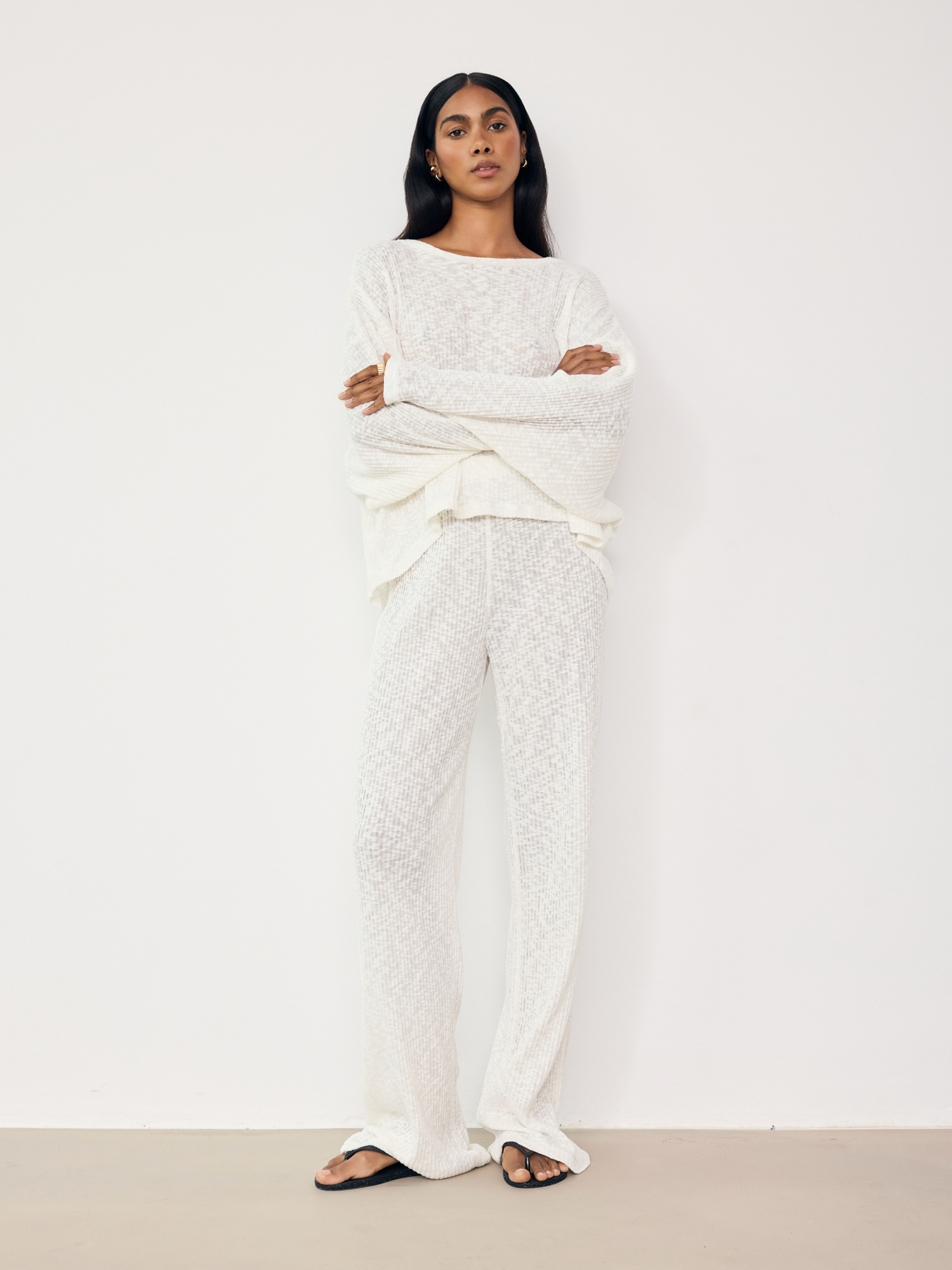Długie spodnie wykonane z miękkiej bawełny o wyrazistej strukturze, imitującej ażurowy splot. Materiał jest niezwykle przewiewny i lekki, co sprawia, że idealnie sprawdzą się podczas wyższych temperatur, gwarantując wygodę przez cały dzień. Mają proste, swobodnie układające się nogawki i elastyczną talię, która zapewnia dopasowanie bez uczucia ucisku. W połączeniu z oversize’owym longsleevem tworzy minimalistyczny set na lato – idealny zarówno na plażę, jak i na spacer po mieście. Połącz je z oversizowym T-shirtem albo lnianą koszulą  – noś tak jak lubisz najbardziej.