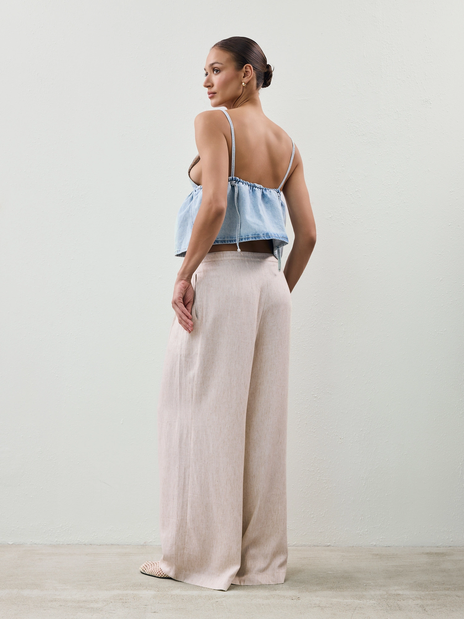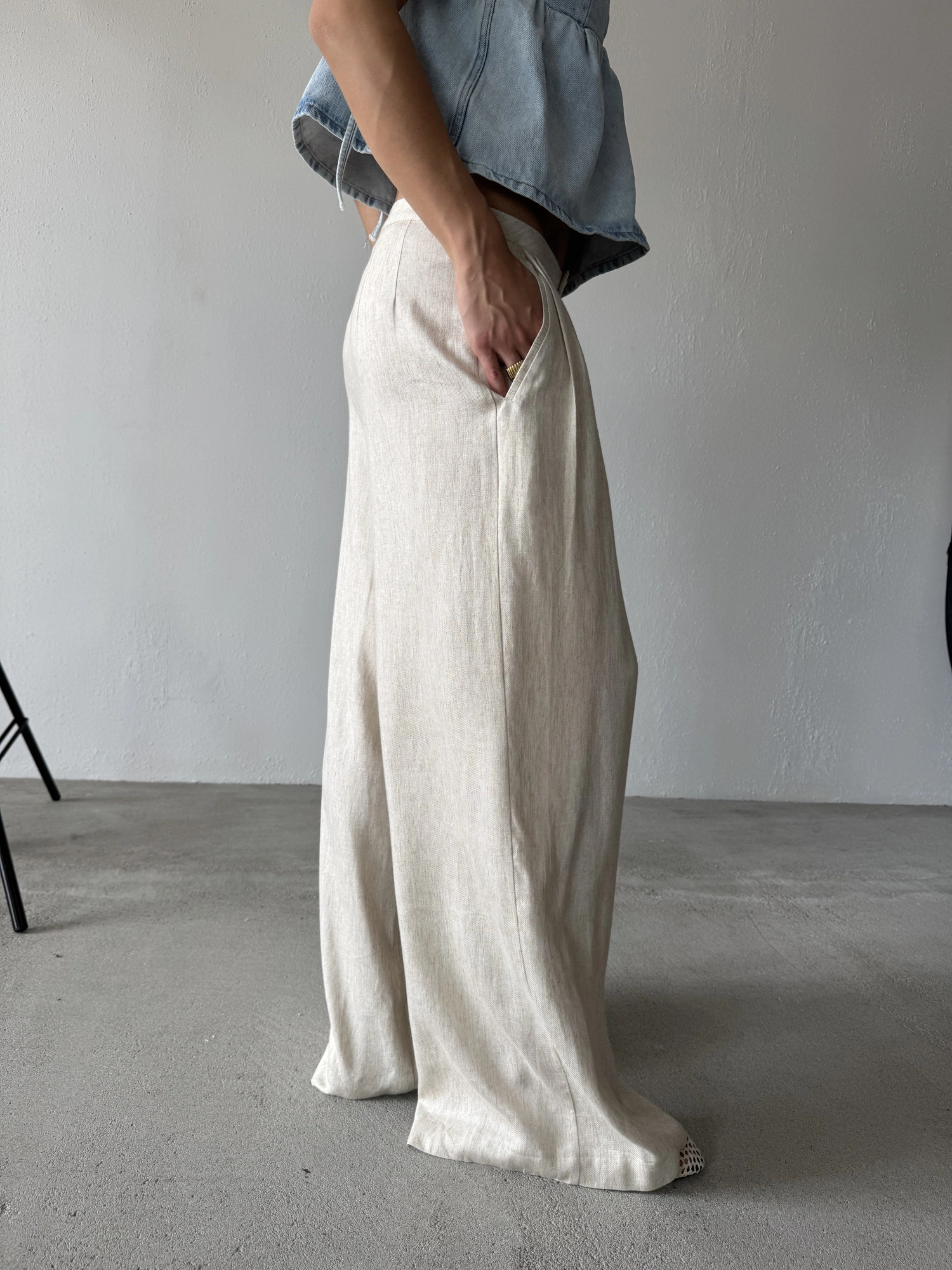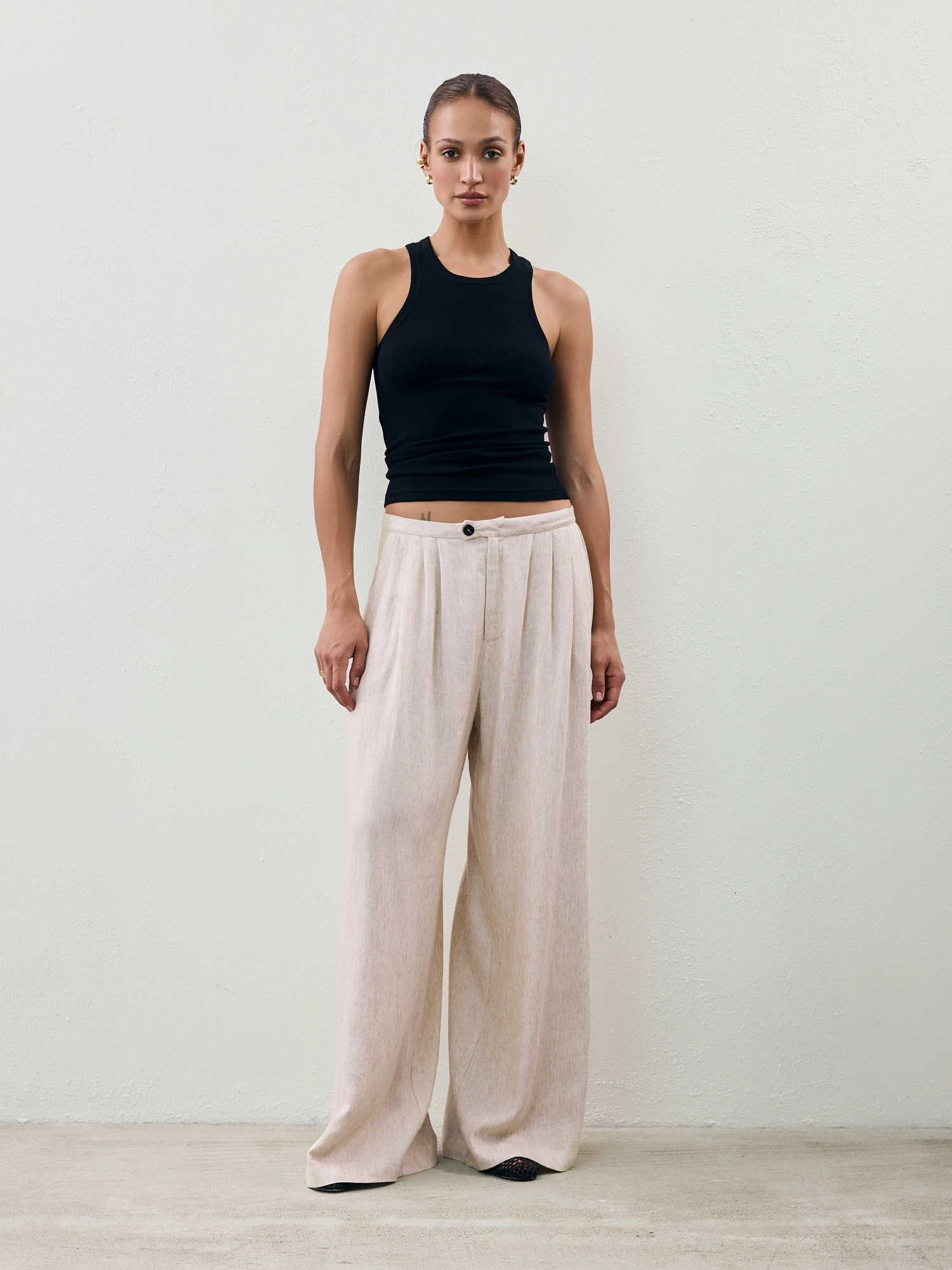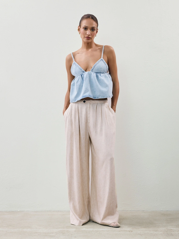Materiałowe spodnie wykonane z miękkiej i delikatnej mieszanki wiskozy i lnu. Mają szerokie nogawki i obniżony stan. Sportowy charakter przełamują plisowania na przodzie, które w połączeniu z lekkim materiałem sprawiają, że całość świetnie się układa i pracuje w ruchu. To idealna propozycja na lato, która będzie wygodna, a przede wszystkim oddychająca. Noś z dopasowaną bokserką, lnianą koszulą lub topem.
