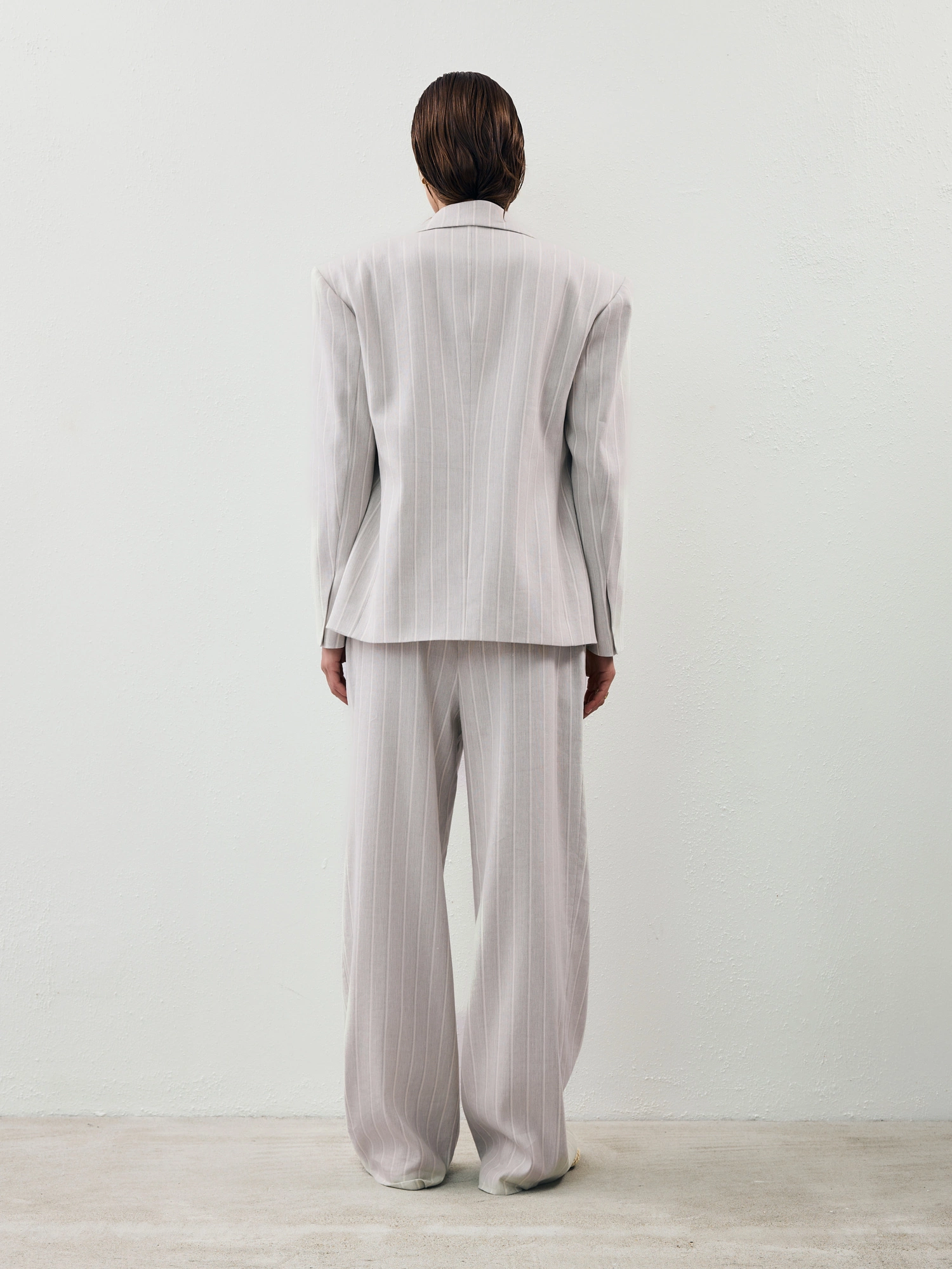 Garniturowa marynarka, uszyta z miękkiego materiału w jasnoszarym odcieniu z delikatnym, tenisowym prążkiem, wewnątrz wykończona podszewką z wiskozy. Ma minimalistyczny, stylizowany na męski krój – mocna linia ramion z poduszkami, klasyczne klapy z wycięciami i dyskretne kieszenie.