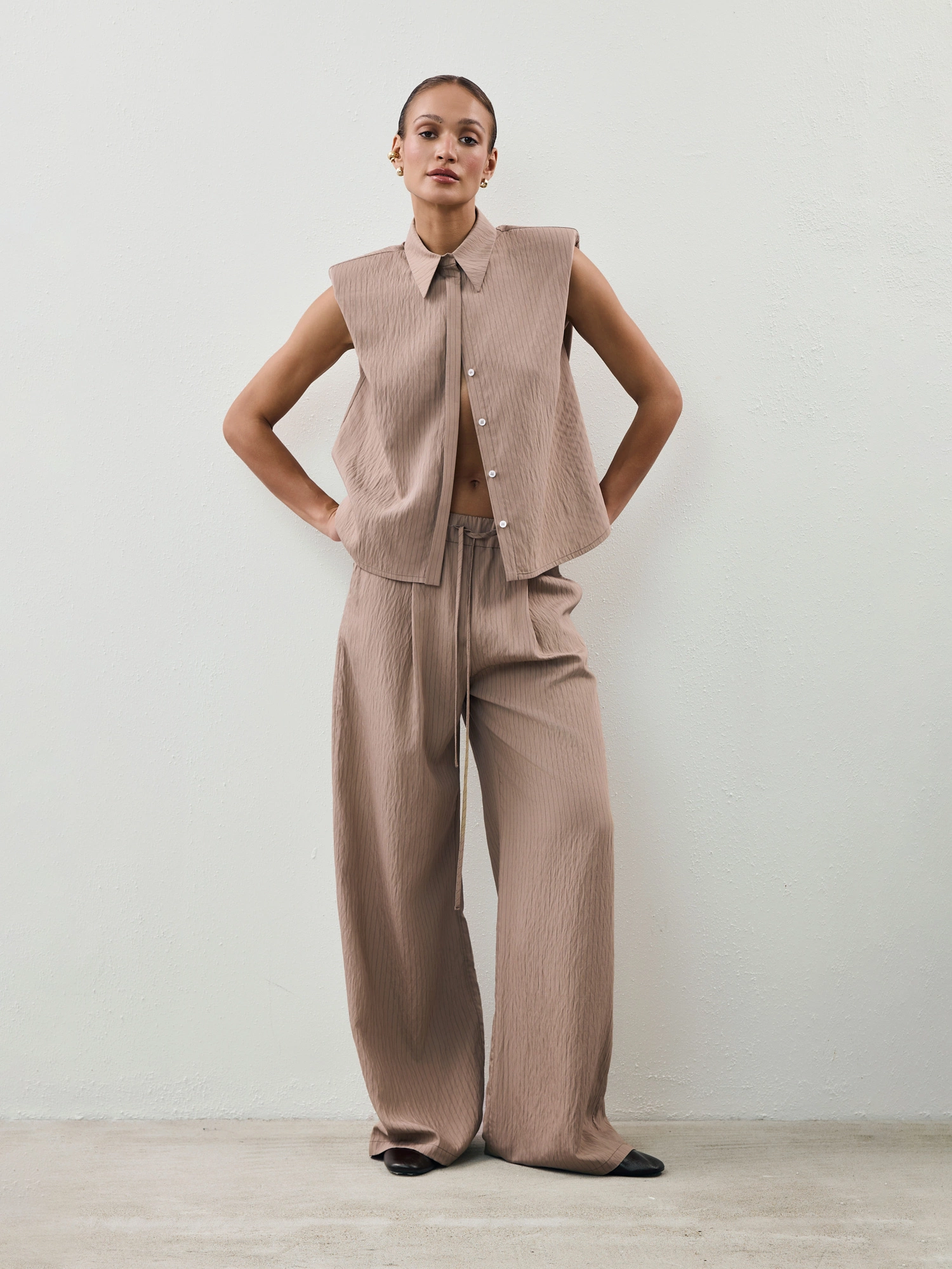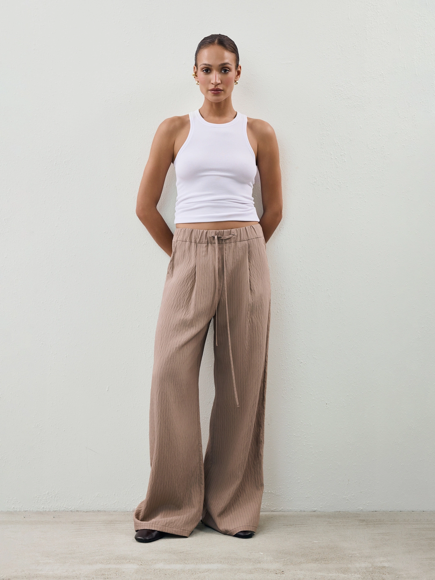 Spodnie wykonana z miękkiego materiału o delikatnie karbowanej fakturze w subtelny prążek. Mają szerokie, proste nogawki, a w pasie szeroką, wygodną gumę z dodatkowym wiązaniem, na przodzie dwie zakładki. To propozycja będąca idealnym połączeniem sportowej elegancji i nonszalanckiego luzu. Noś z dedykowaną koszulą, basicowym T-shirtem lub topem.