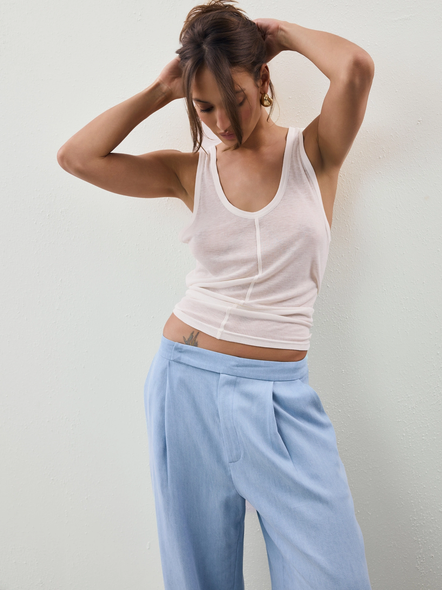 Stylizowane na męskie spodnie wykonane z niezwykle miękkiej i przyjemnej dla skóry tkaniny - mieszanki wiskozy i lnu. Materiał wizualnie imituje denim, ma charakterystyczny, jasnoniebieski odcień i diagonalną fakturę. Jest lejący, lekki i przewiewny - dzięki temu świetnie się układa i pracuje w ruchu. Spodnie mają proste, luźne nogawki, klasyczny stan i dwie zakładki na przodzie. Po bokach dwie poręczne kieszenie. To propozycja, która w połączeniu z dedykowaną koszulą stworzy unikatowy, modowy set, który – w zależności od dodatków – sprawdzi się zarówno na co dzień, jak i na wieczorne wyjście. Noś ją ze sneakersami lub japonkami w casualowej wersji, albo zestaw ze szpilkami i elegancką biżuterią na specjalne okazje.
