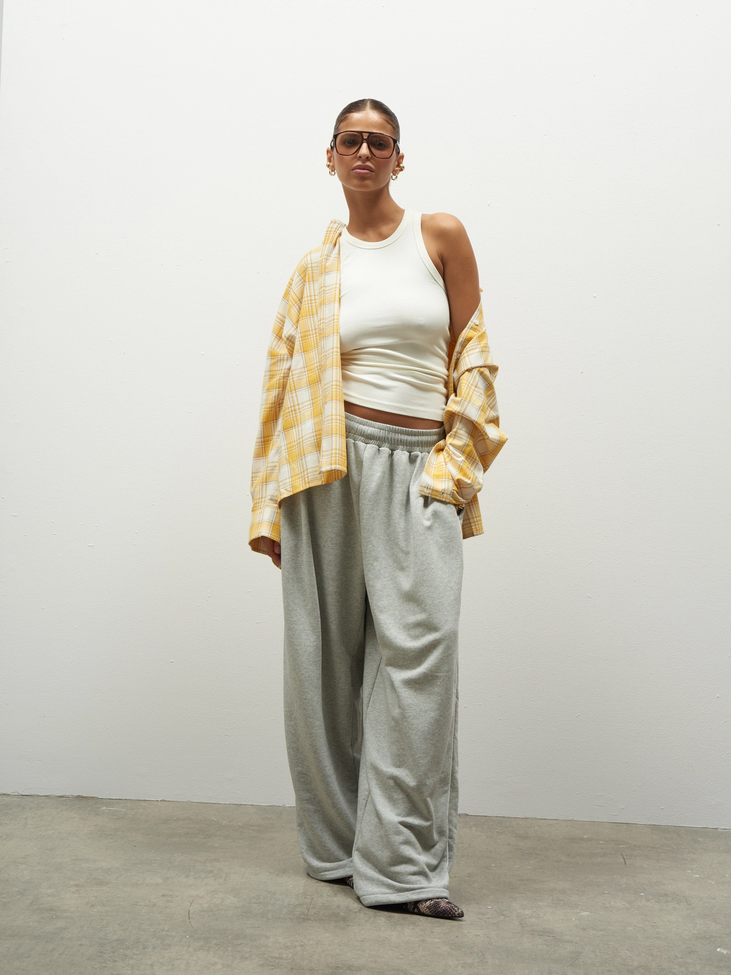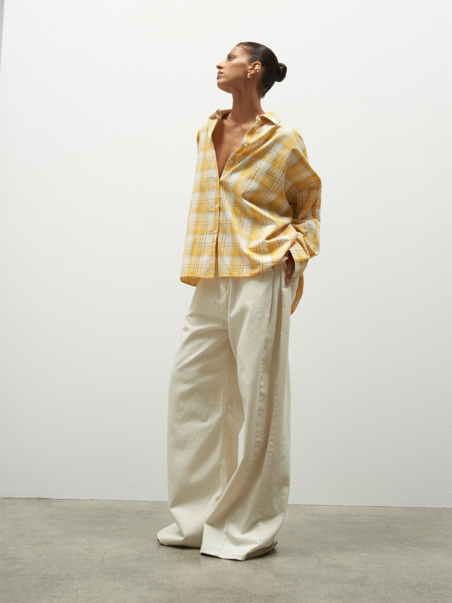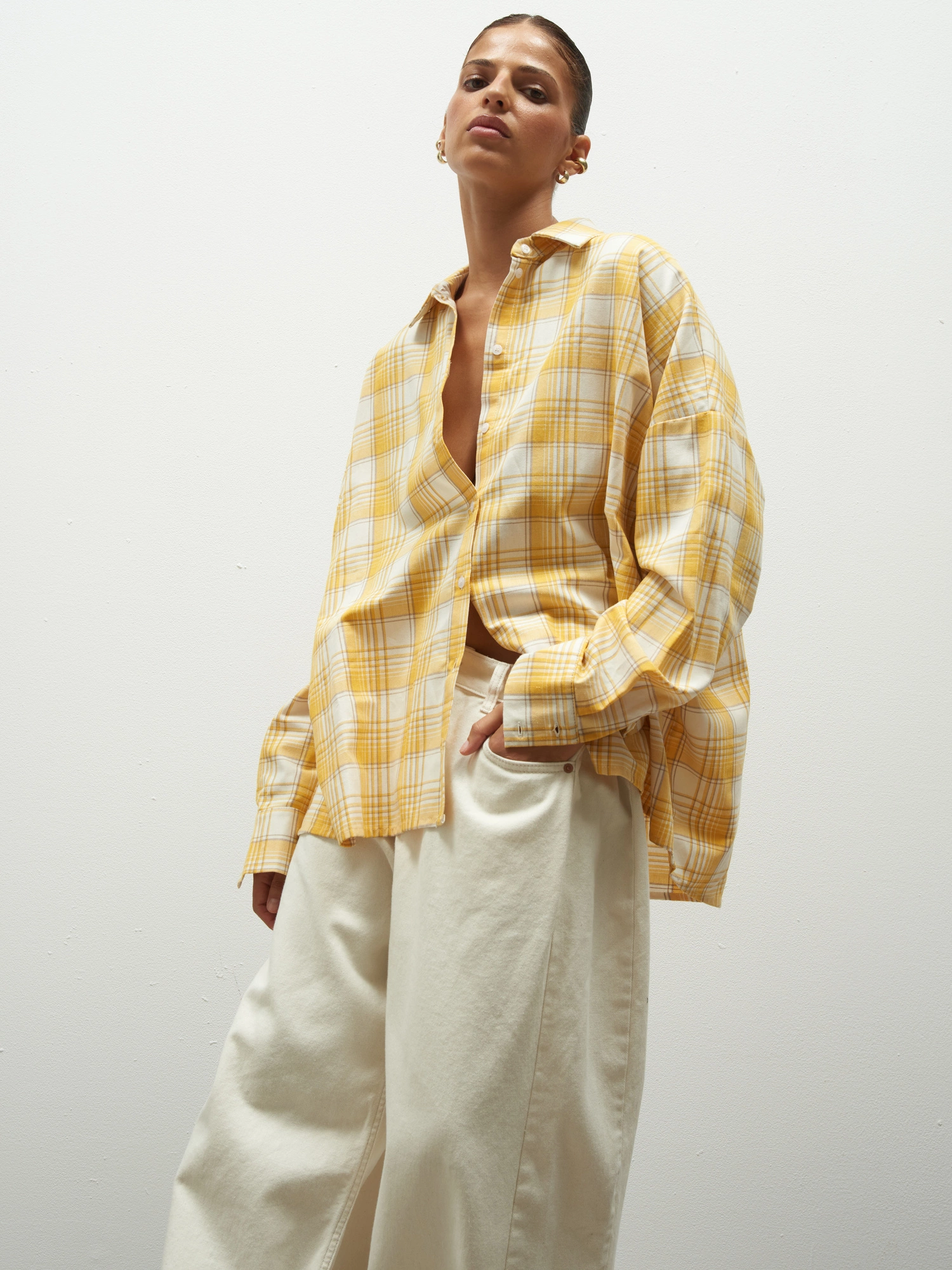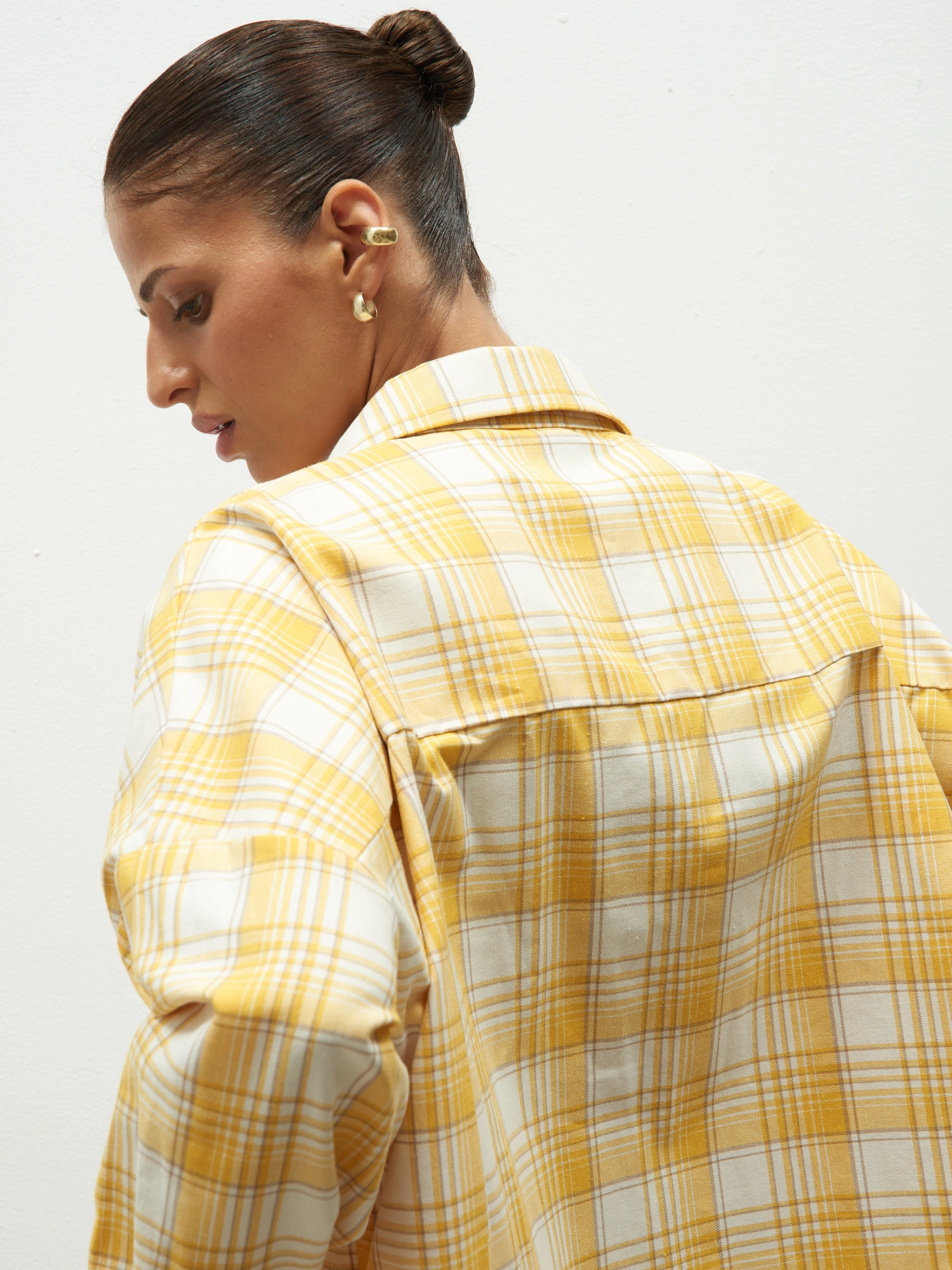 Koszula oversize wykonana z miękkiej tkaniny z bawełną w charakterystyczny print w piękną, żółtą kratę. Utrzymana w stylu worker shirt - jest duża, obszerna i stylizowana na męską. Ma klasyczny kołnierzyk i szerokie mankiety przy rękawach. Noś ją z ulubionymi jeansami, narzuć na top i legginsy lub przewiąż swobodnie w pasie dla podkręcenia dresowej stylówki - wszystkie chwyty dozwolone.