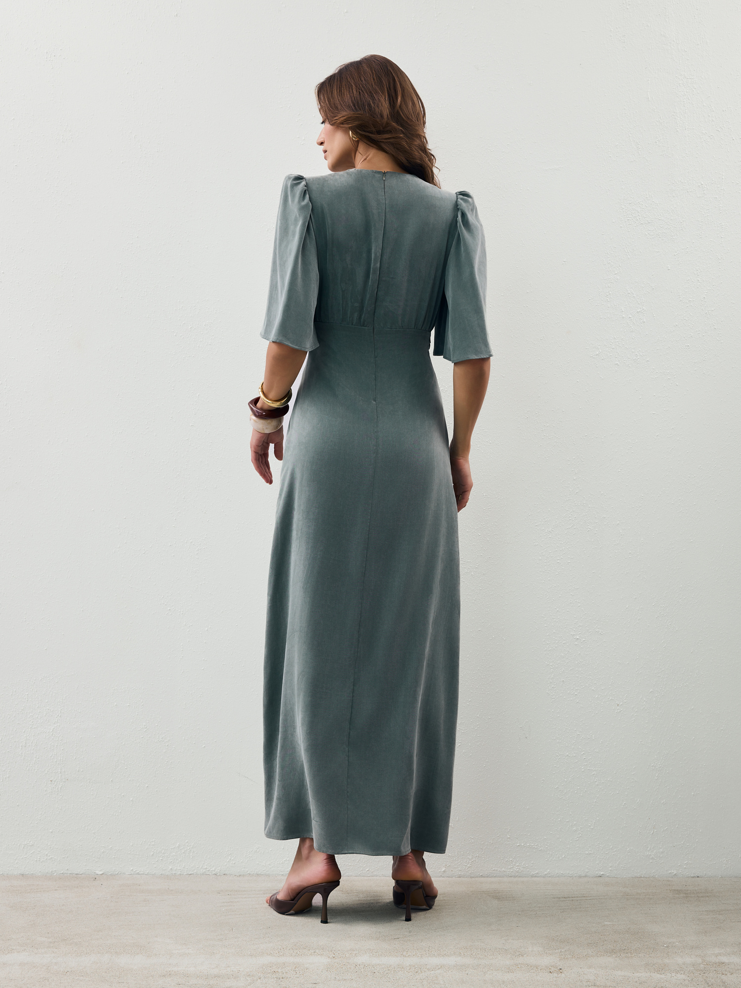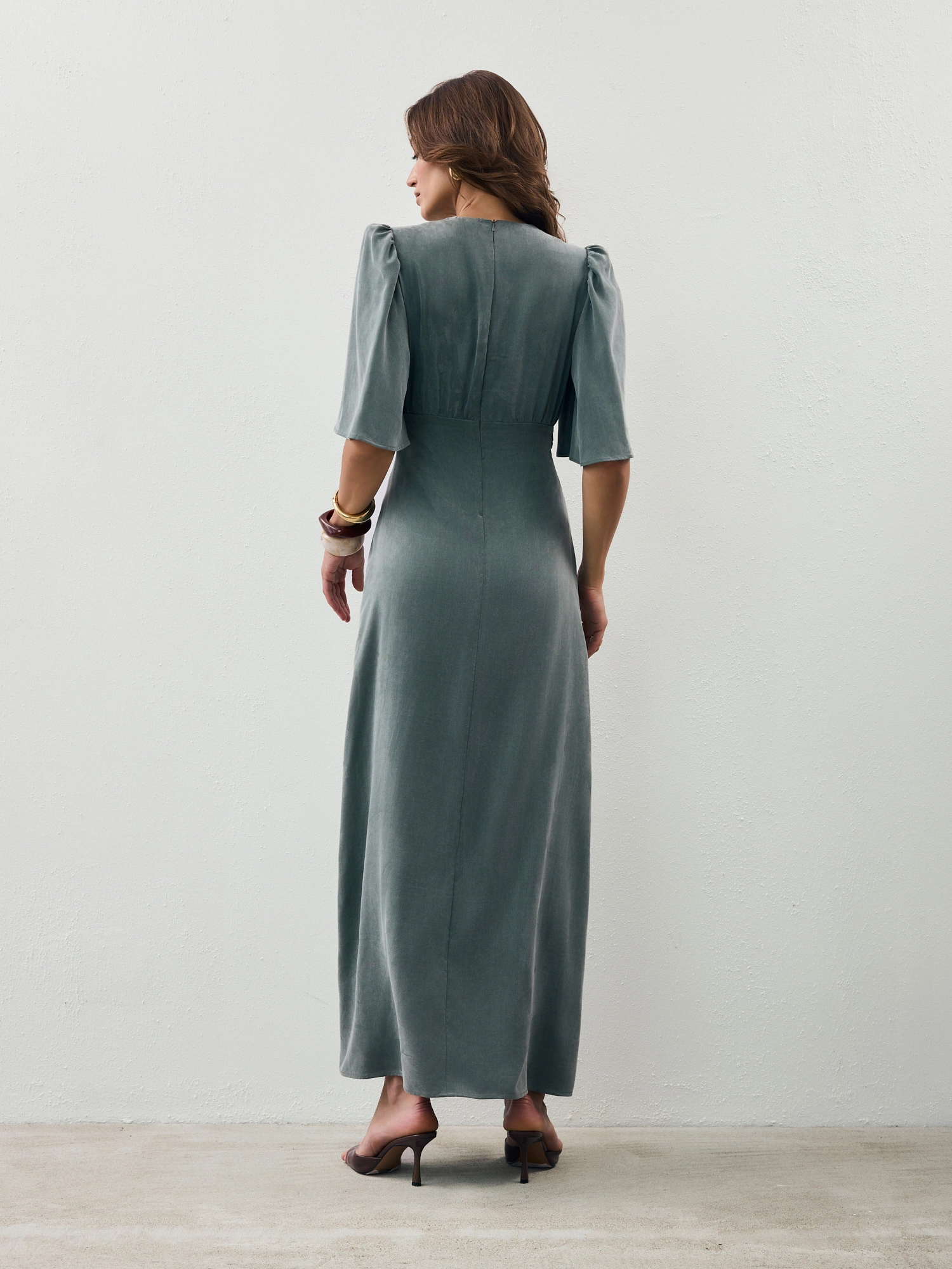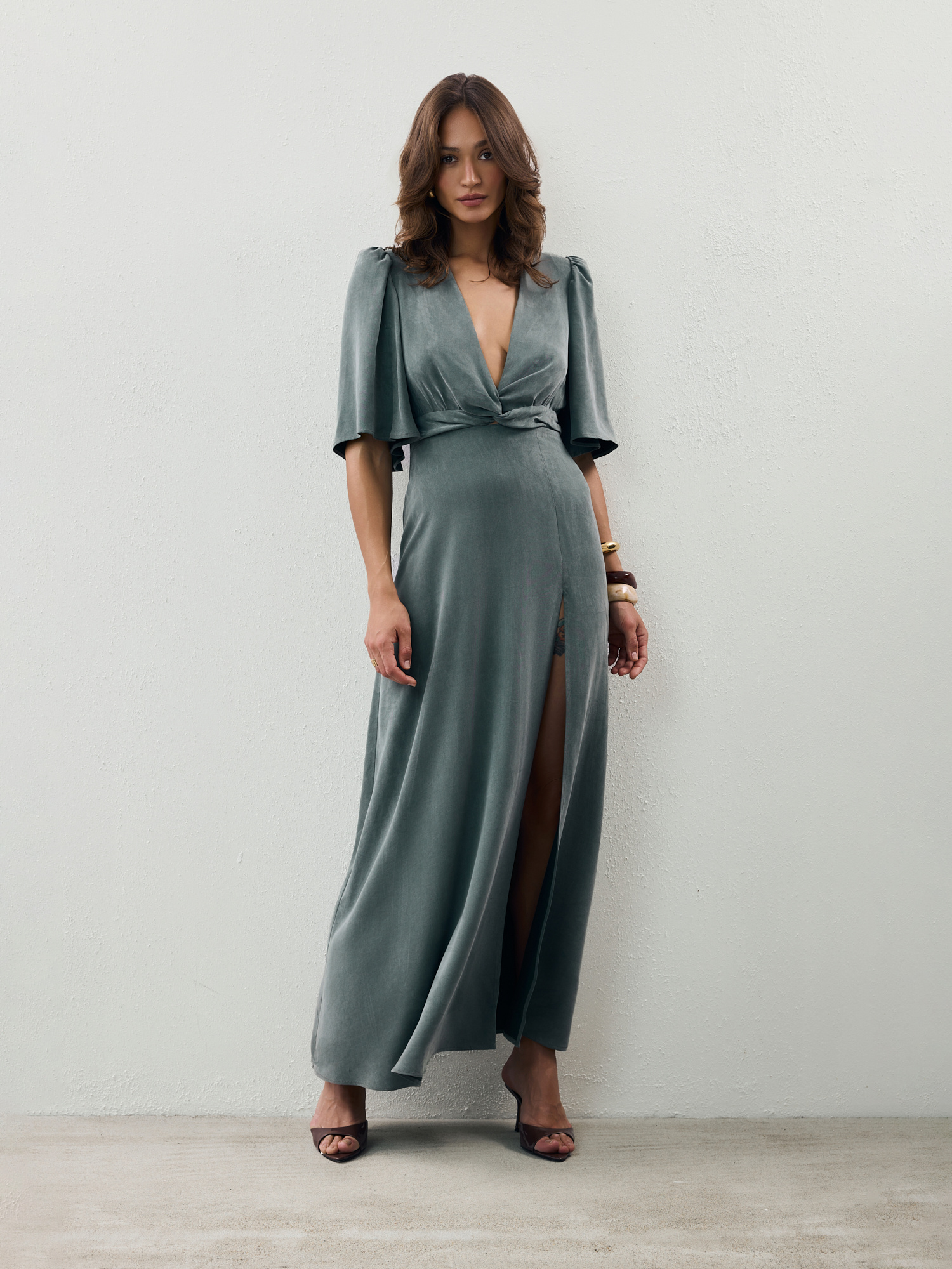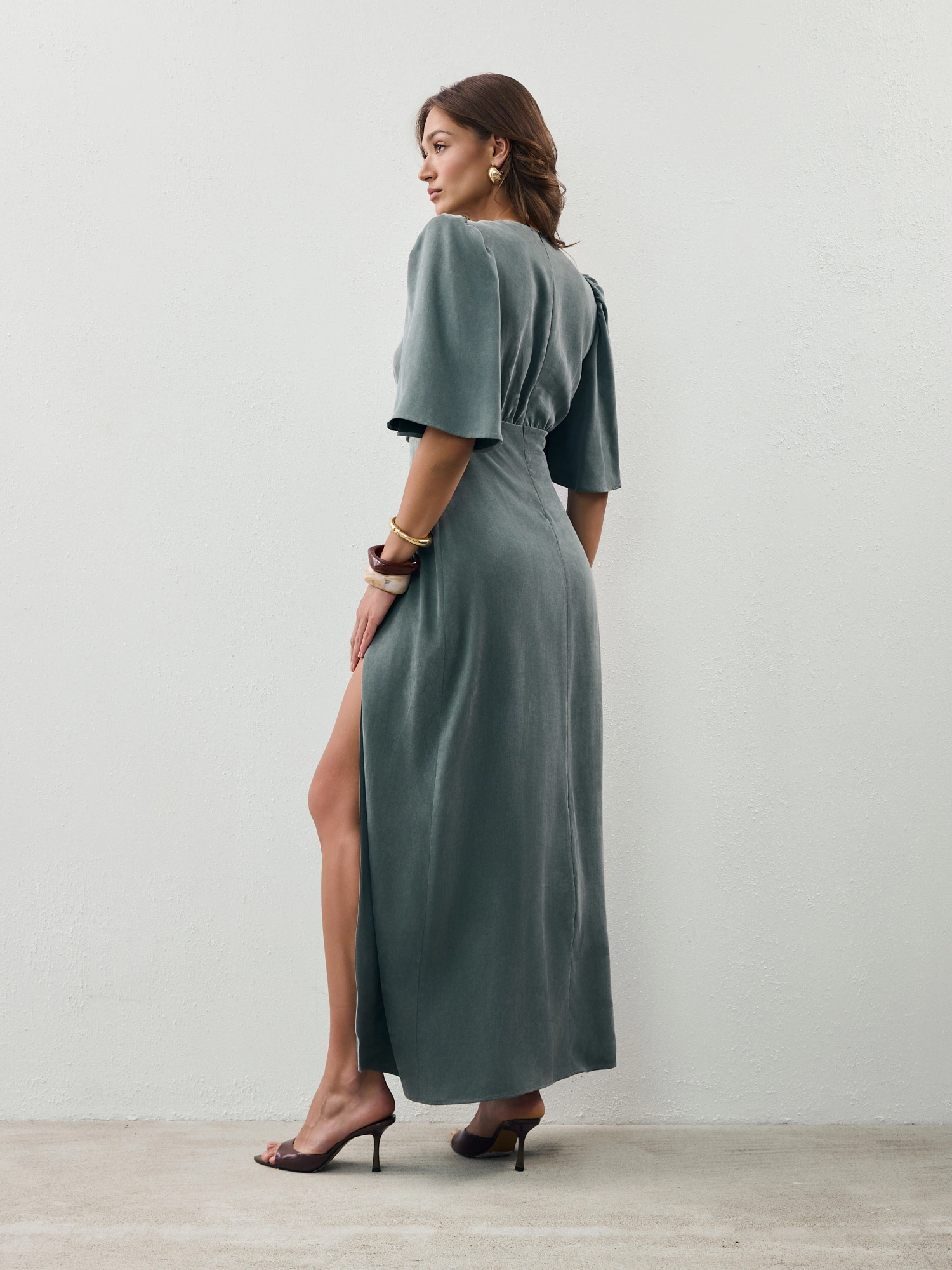 Bankietowa sukienka maxi. Wykonana z miękkiego blendu tencelu i wiskozy o aksamitnym wykończeniu i subtelnym połysku. Model z pięknie podkreśloną talią i efektownym supłem, z luźno puszczanym dołem i głębokim rozcięciem na nodze, które nadaje sylwetce lekkości i kobiecego wdzięku. Głęboki dekolt w kształcie litery V eksponuje linię biustu, a lekko bufiaste rękawy do łokcia dodają stylizacji elegancji i charakteru. Sukienka zapinana jest z tyłu na kryty zamek.